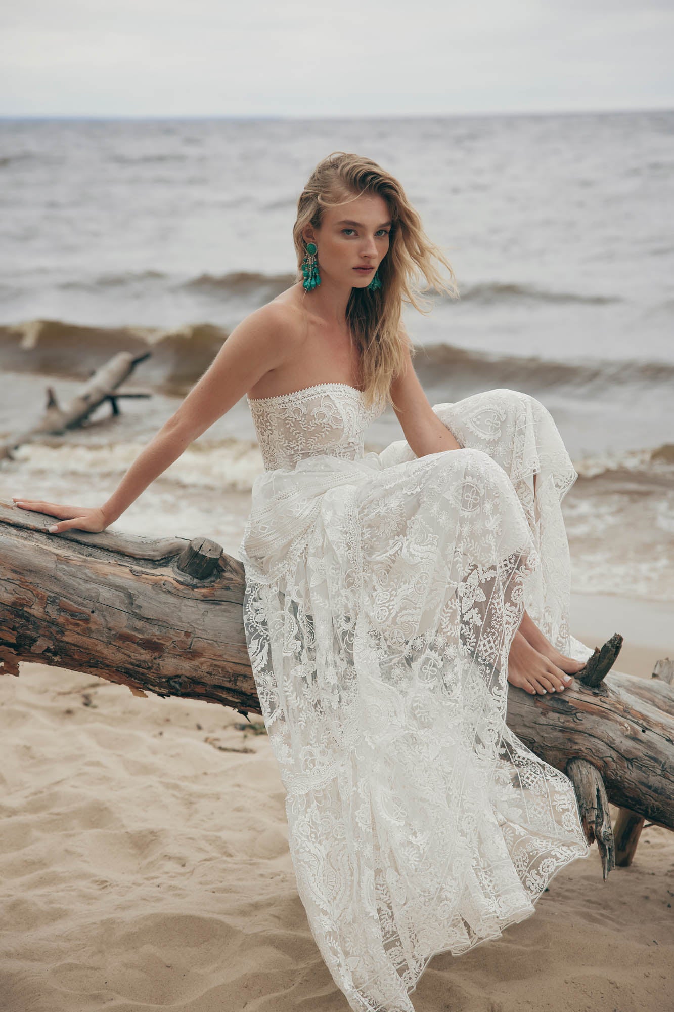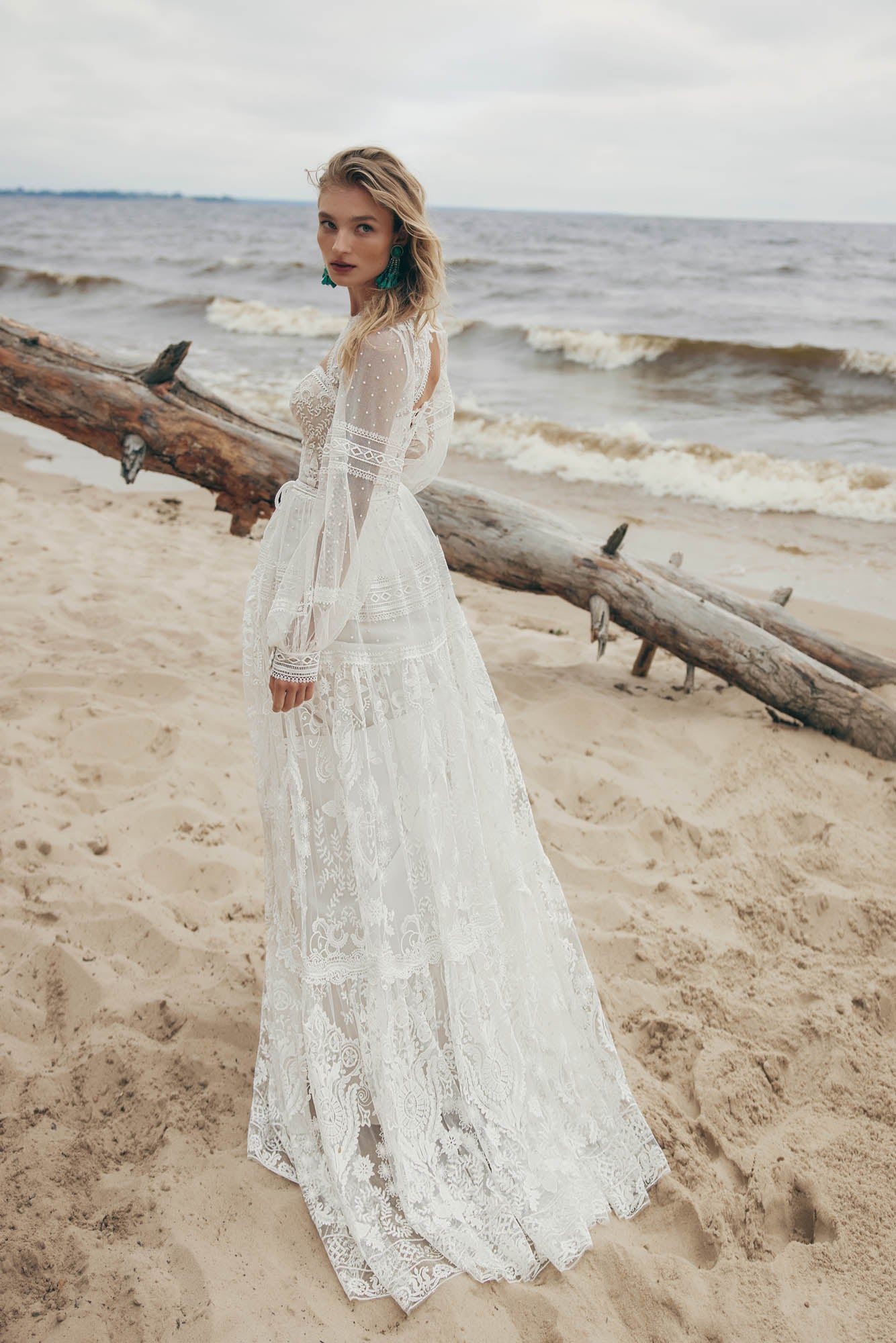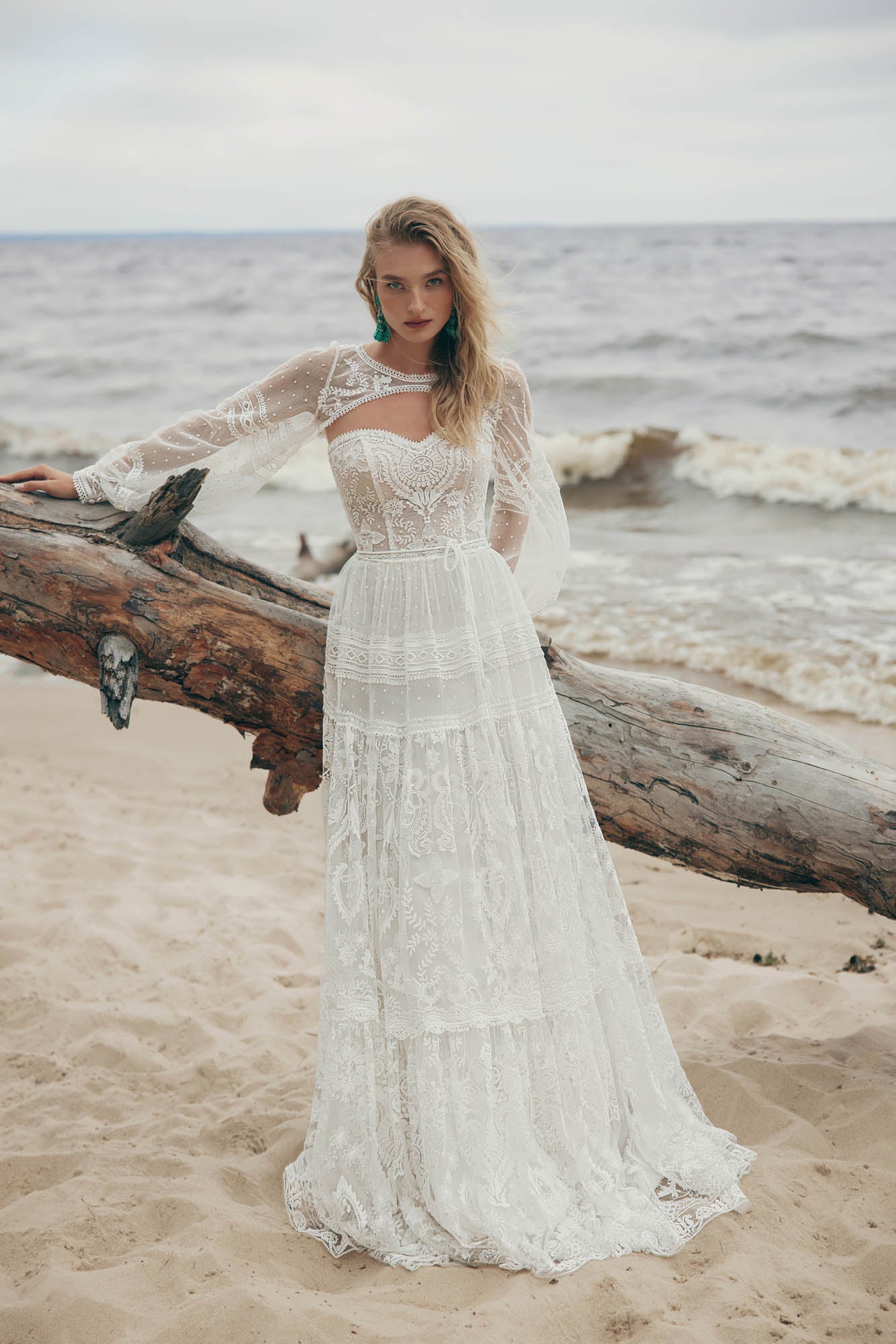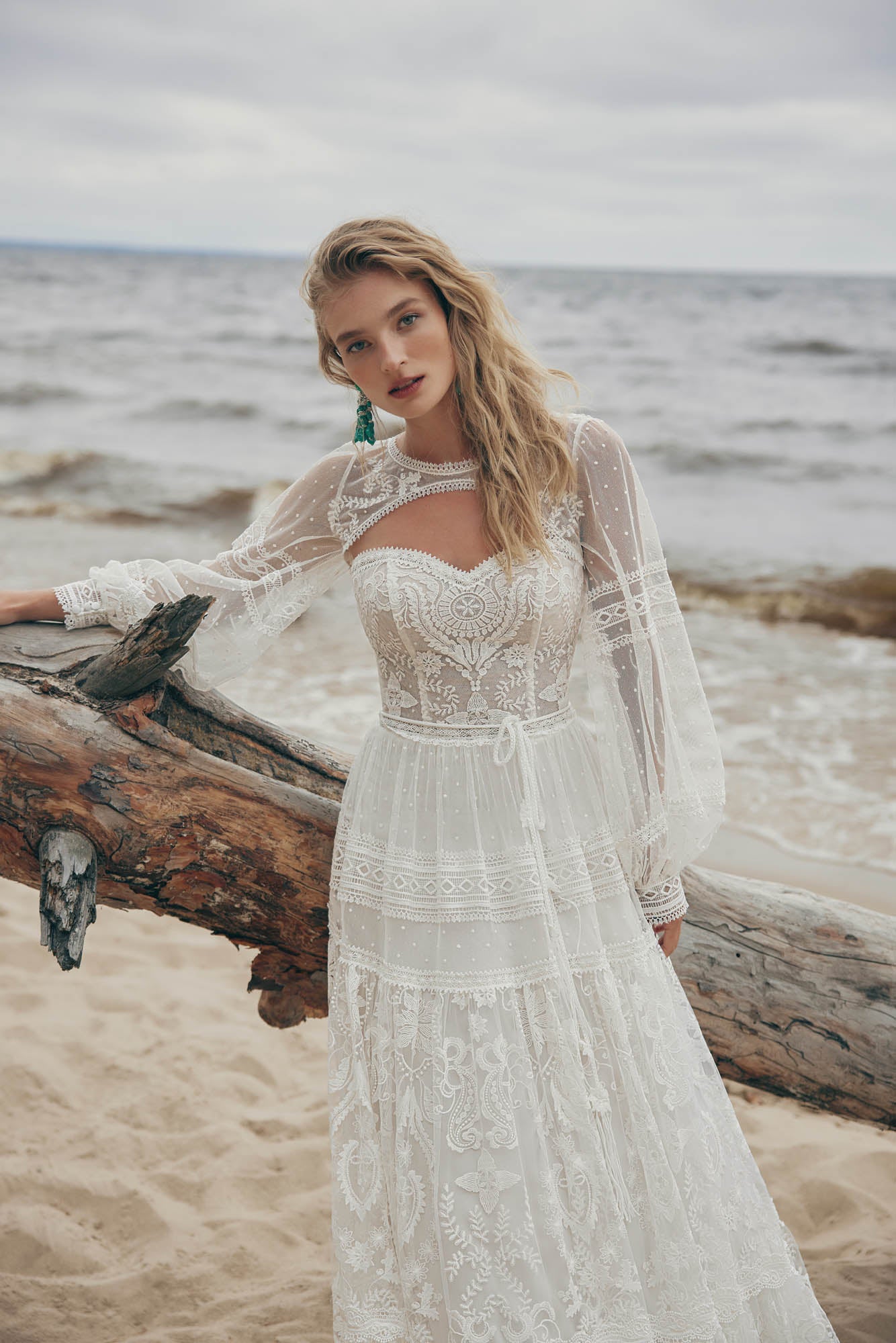 Abito da sposa scivolato presenta un corpino trasparente e scollo a cuore insieme alla gonna lunga, morbida, che riprende gli inserti di pizzo del corpino. Il bolero con maniche a sbuffo ricamate con pizzo e perline danno un tocco romantico all'abito