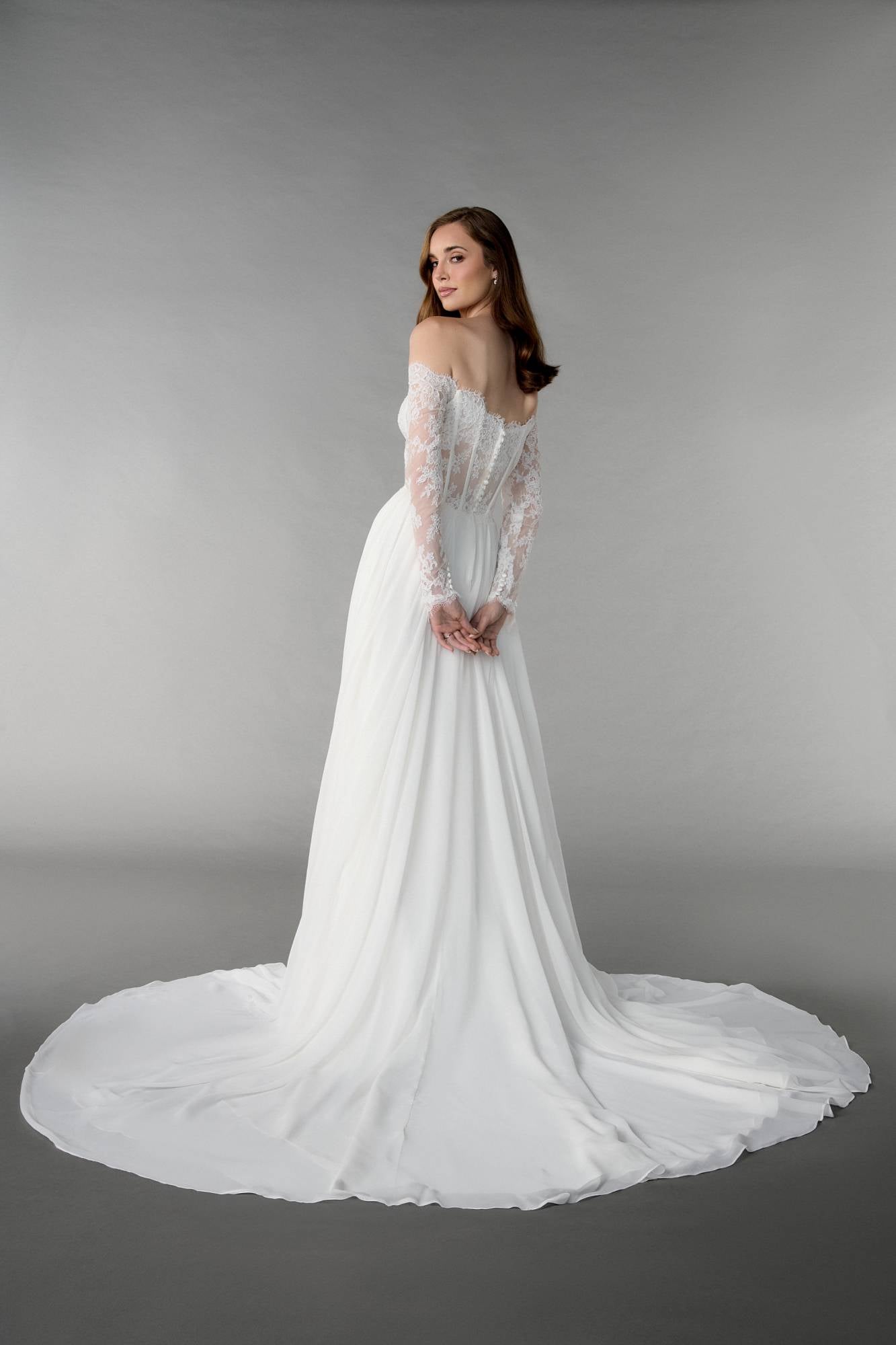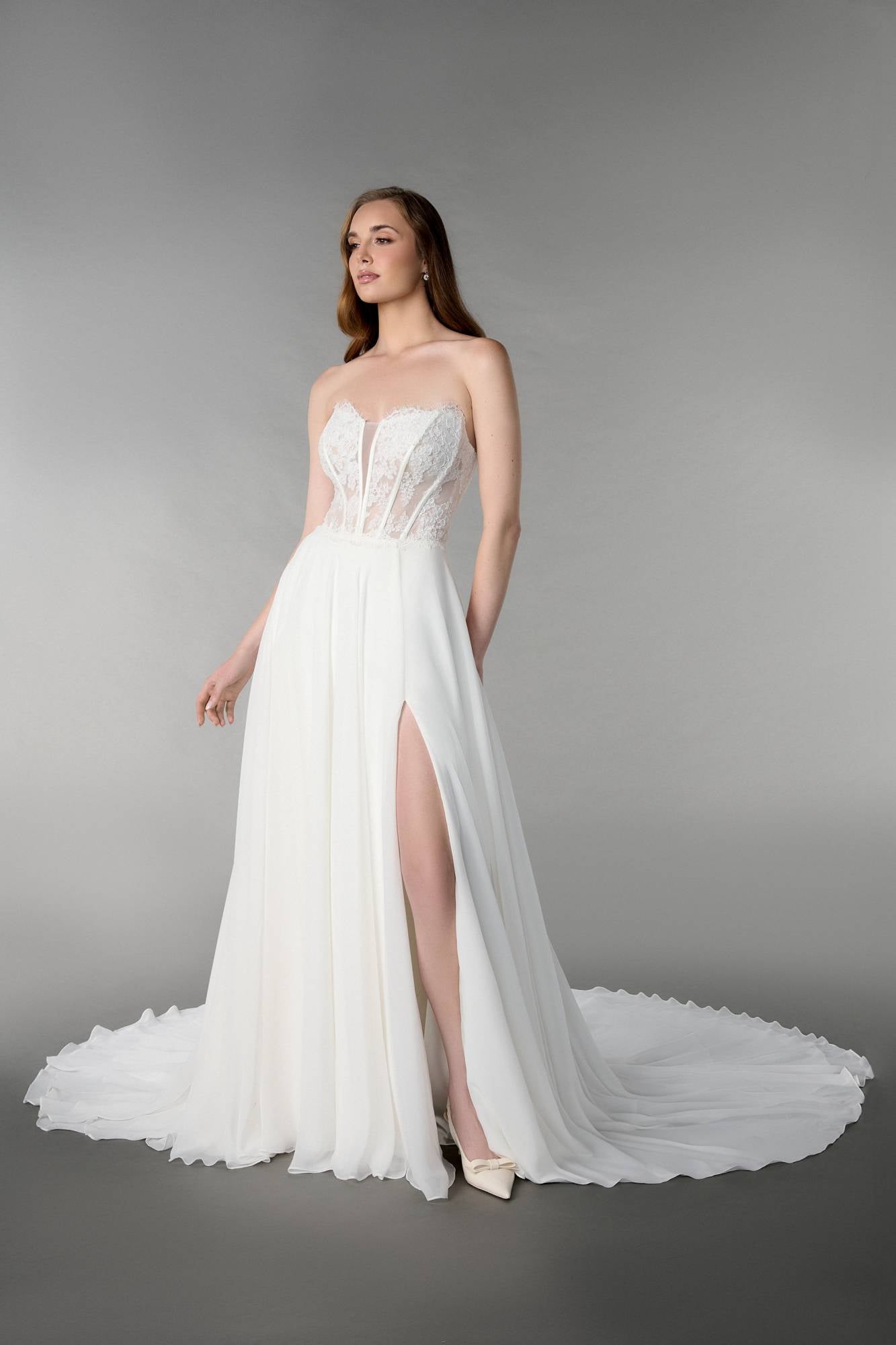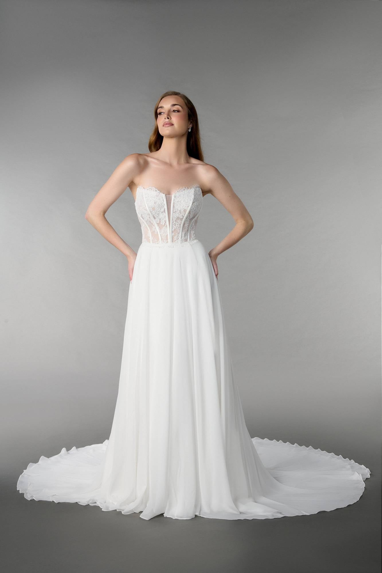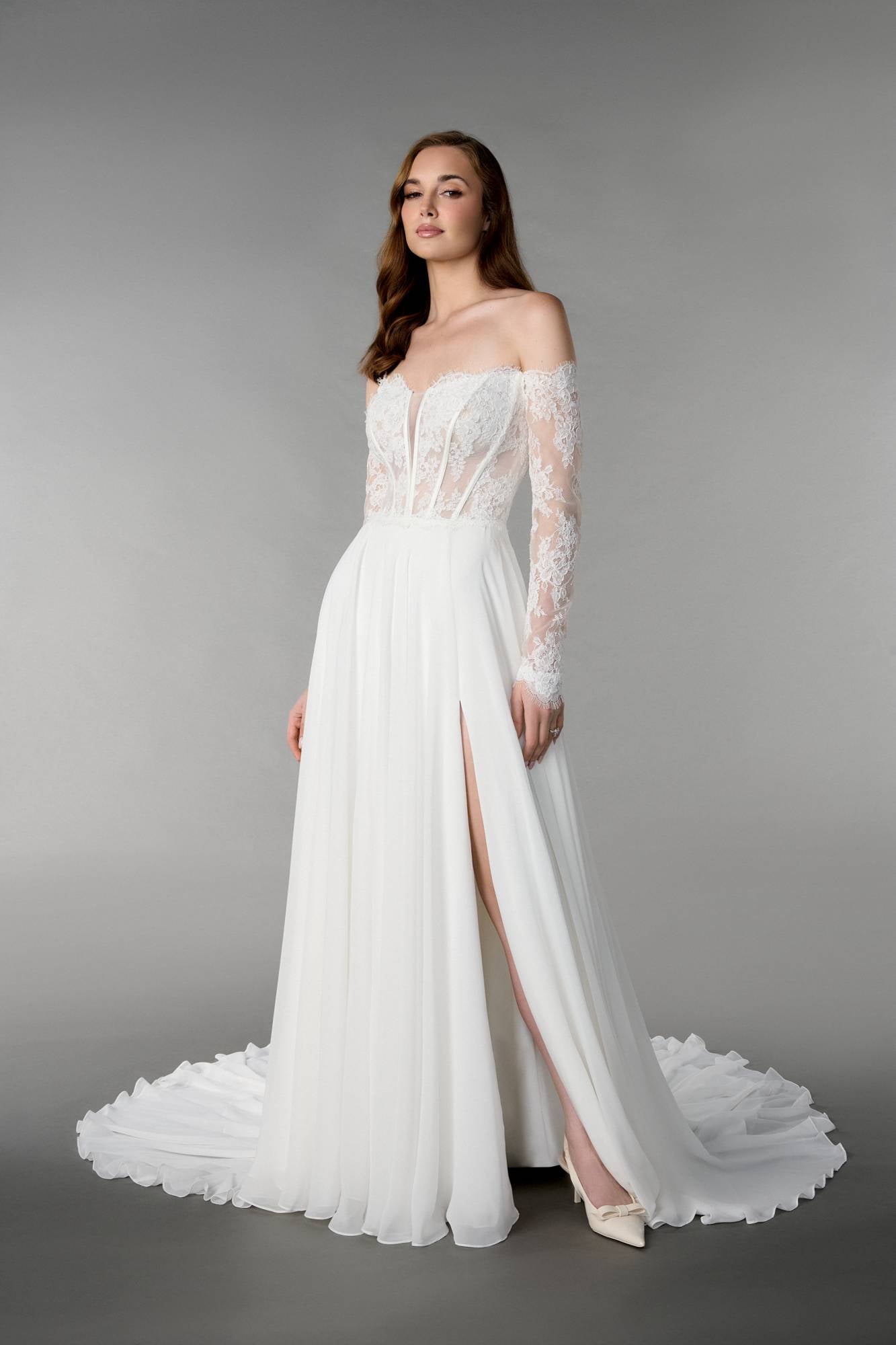 Abito da sposa con corpino steccato semitrasparente con scollo a V velato in pizzo, maniche lunghe in pizzo rimovibili e gonna liscia