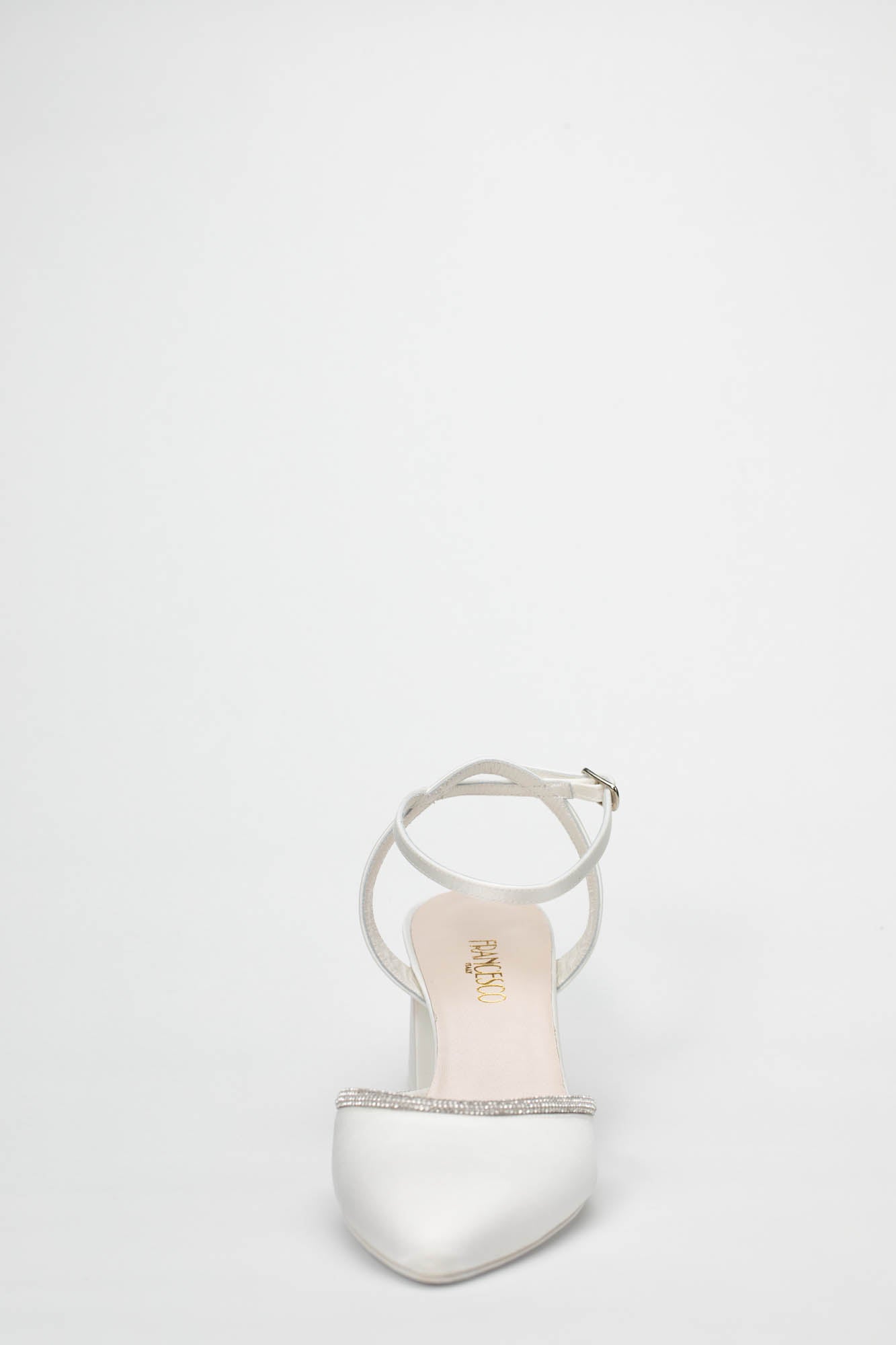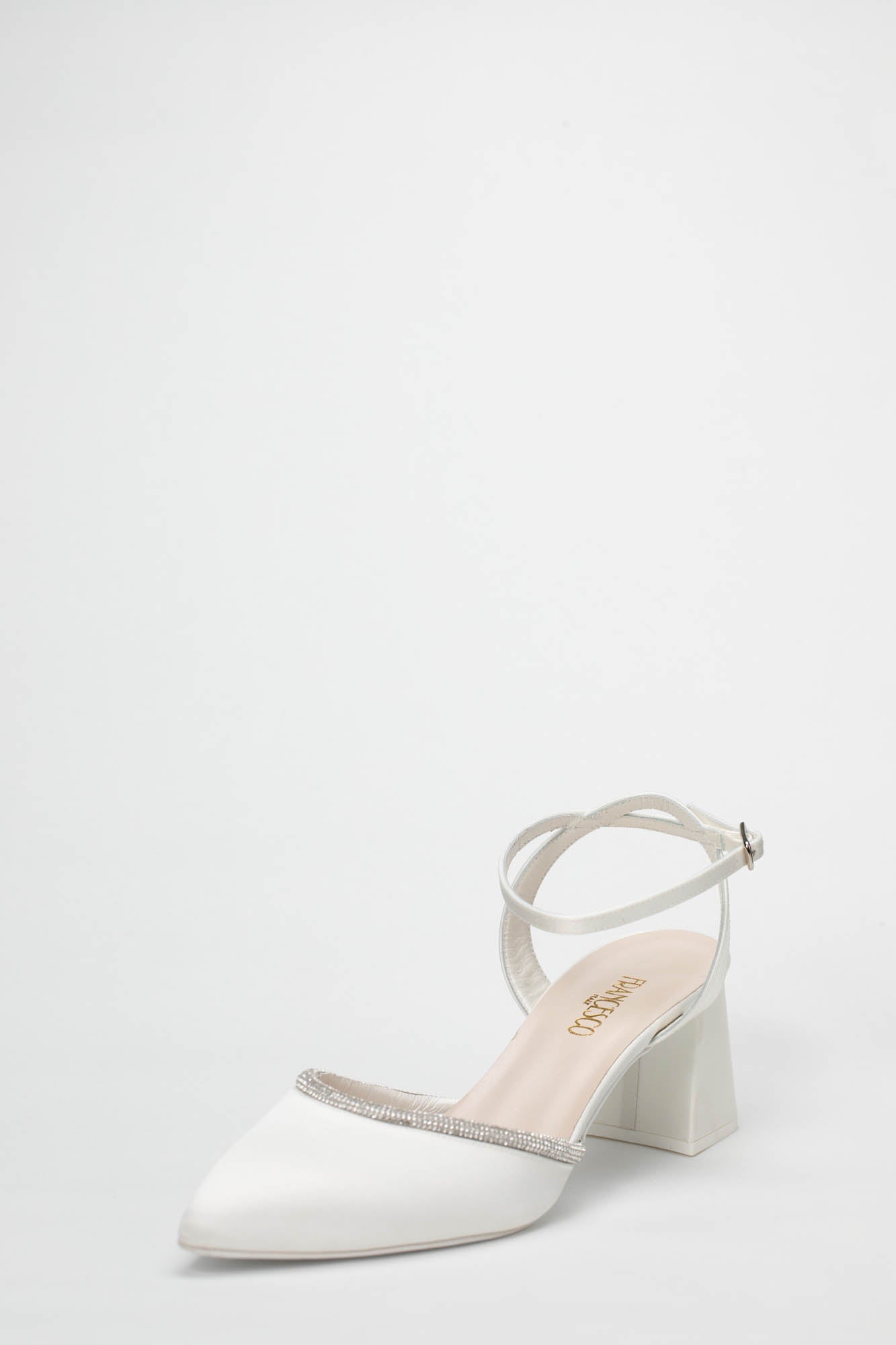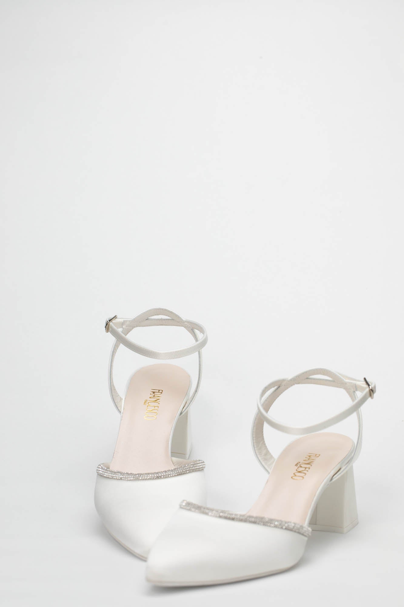 L'estetica della Benedetta 9827 è definita da una punta affusolata e chiusa che richiama la classicità della décolleté. Il profilo dello scollo è interamente impreziosito da un sottile bordo di cristalli luminosi, che incornicia il piede con un riflesso brillante e sofisticato. Questo dettaglio gioiello dialoga armoniosamente con la finitura in satin bianco, creando un contrasto di texture estremamente chic. Il design è completato da un cinturino alla caviglia regolabile che stabilizza la calzata, rendendo questo modello un connubio perfetto di funzionalità e bellezza preziosa, ideale da abbinare ad abiti da sposa midi, completi pantalone eleganti o vestiti nuziali dal taglio scivolato. Come per ogni nostra proposta, è possibile richiedere la personalizzazione del modello per renderlo unico: contattaci per scoprire come adattare questa creazione al tuo stile.
