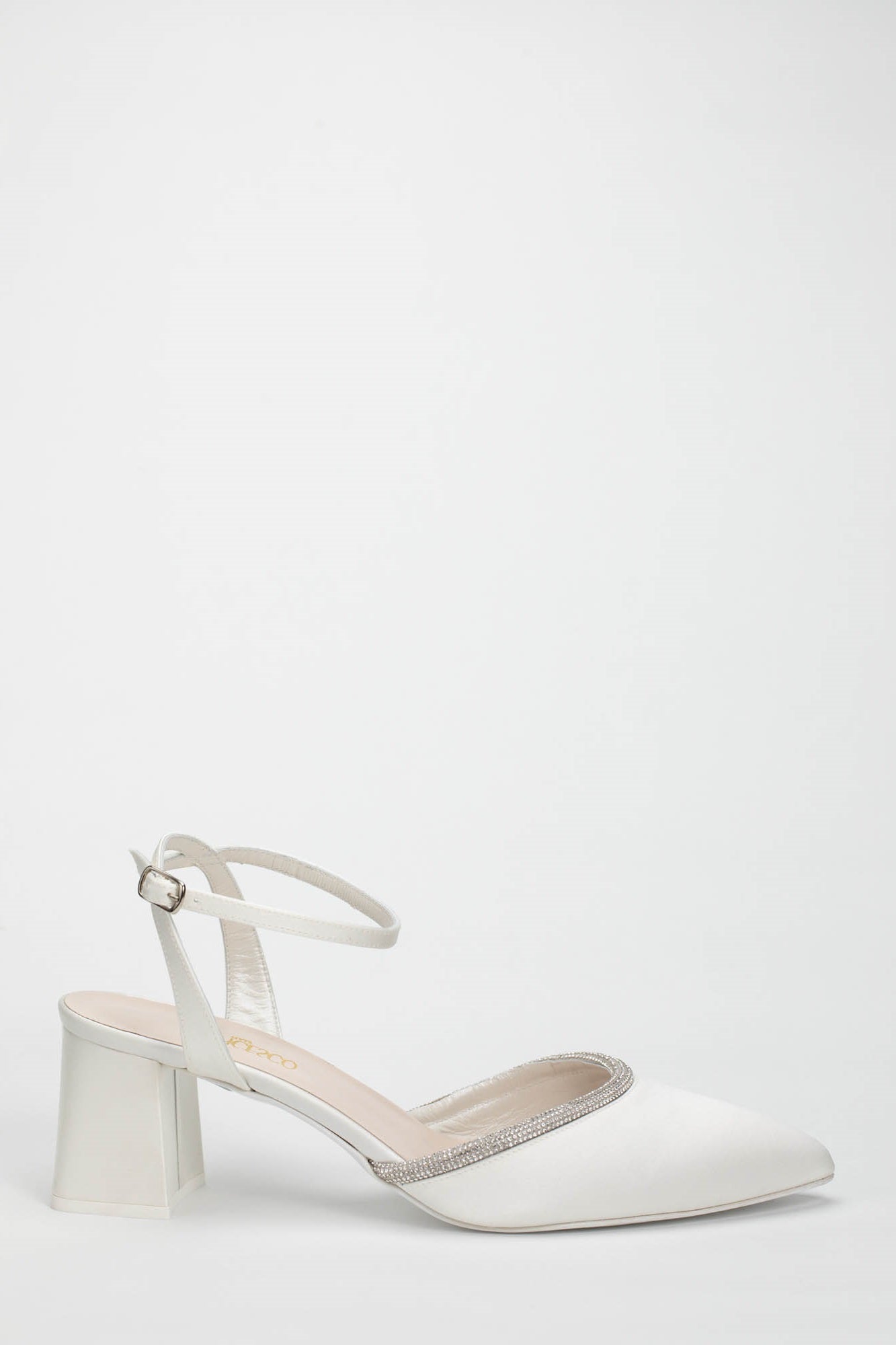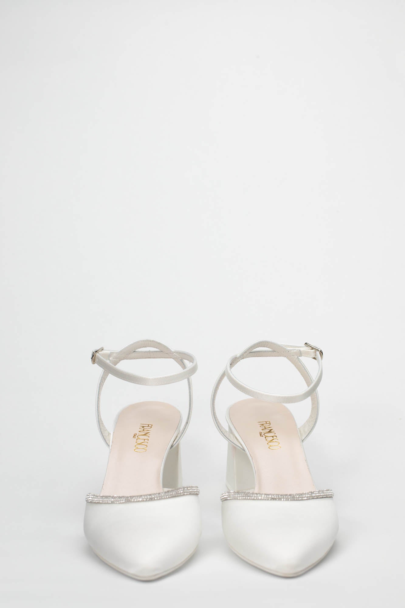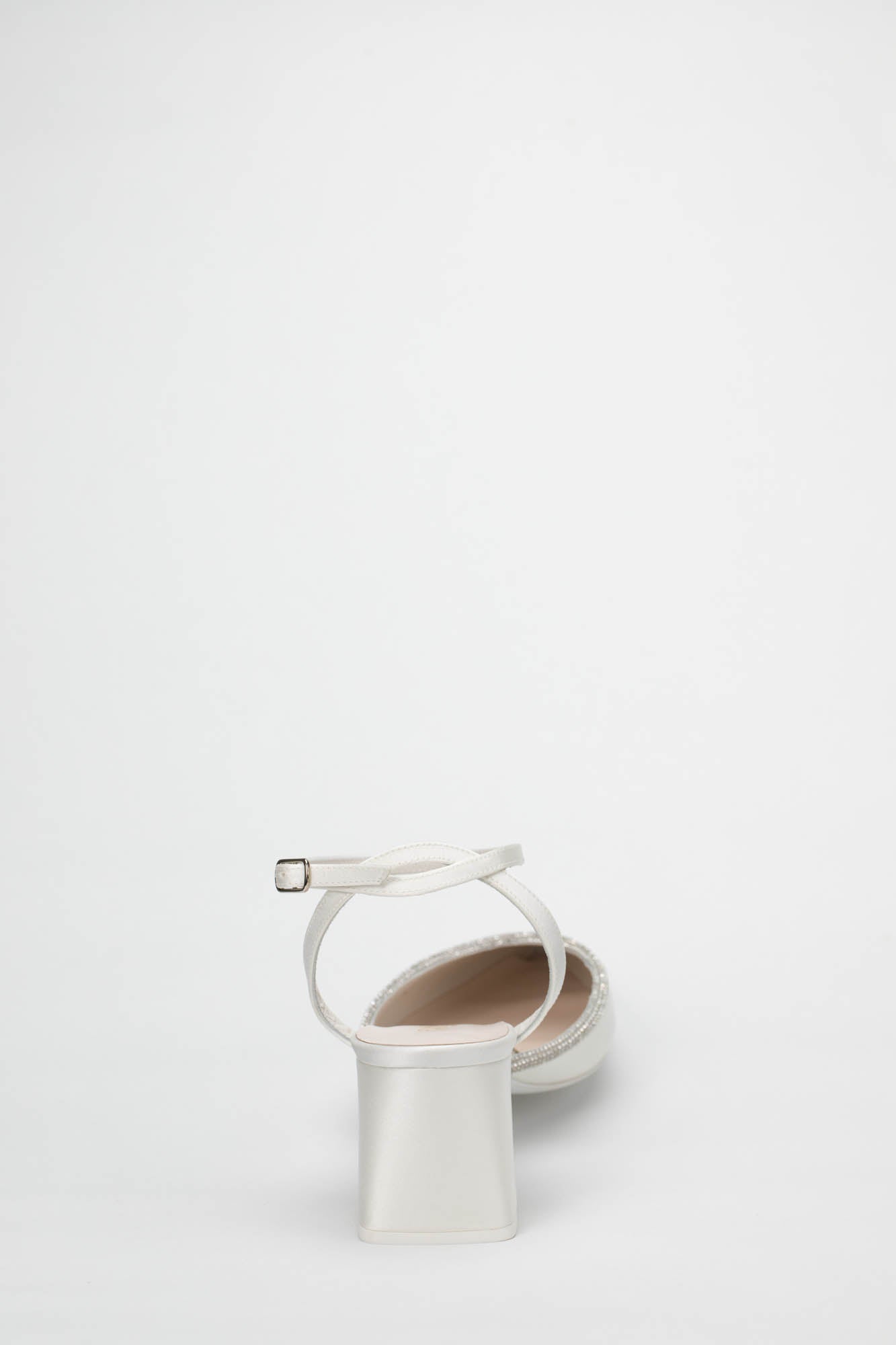 L'estetica della Benedetta 9827 è definita da una punta affusolata e chiusa che richiama la classicità della décolleté. Il profilo dello scollo è interamente impreziosito da un sottile bordo di cristalli luminosi, che incornicia il piede con un riflesso brillante e sofisticato. Questo dettaglio gioiello dialoga armoniosamente con la finitura in satin bianco, creando un contrasto di texture estremamente chic. Il design è completato da un cinturino alla caviglia regolabile che stabilizza la calzata, rendendo questo modello un connubio perfetto di funzionalità e bellezza preziosa, ideale da abbinare ad abiti da sposa midi, completi pantalone eleganti o vestiti nuziali dal taglio scivolato. Come per ogni nostra proposta, è possibile richiedere la personalizzazione del modello per renderlo unico: contattaci per scoprire come adattare questa creazione al tuo stile.