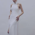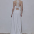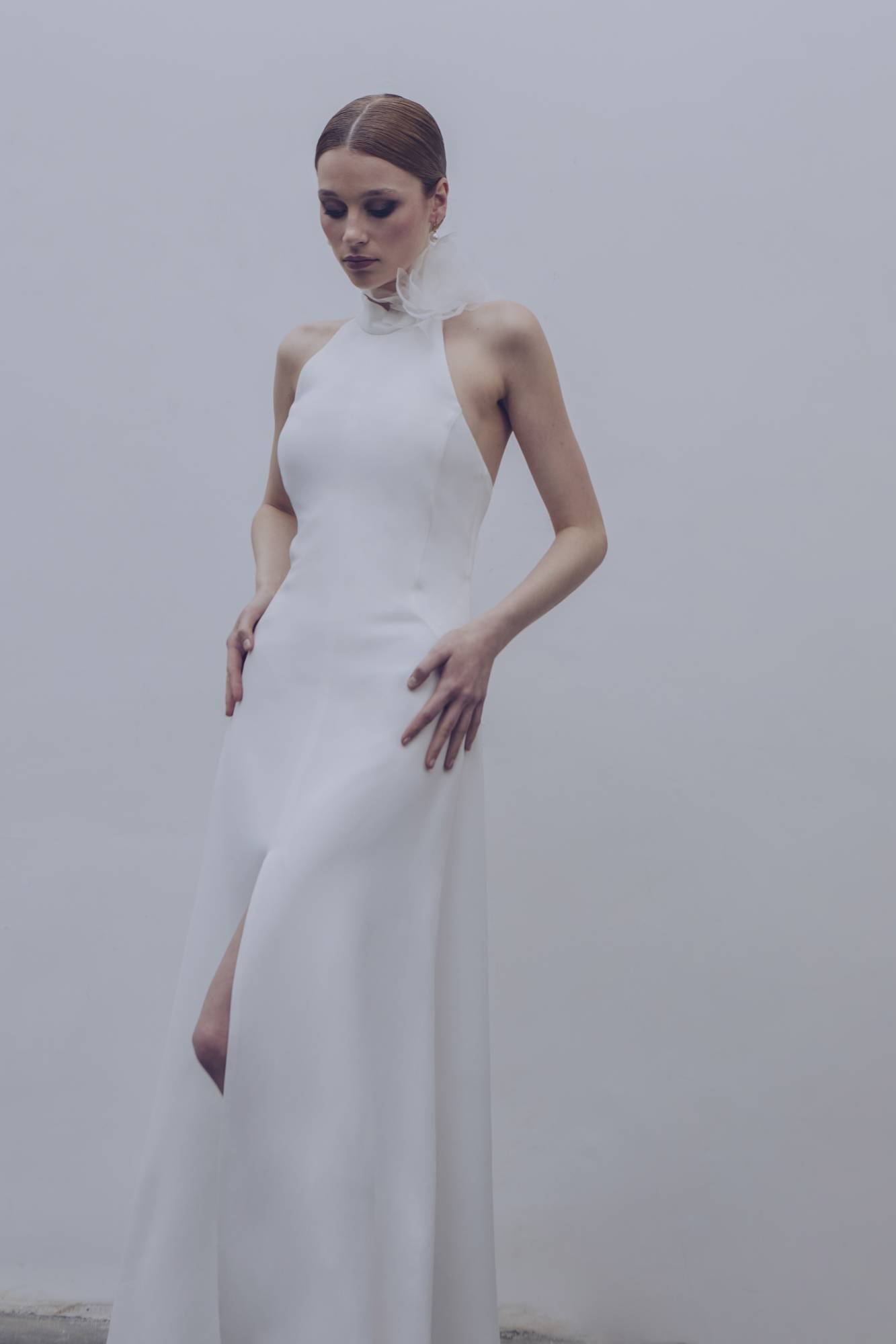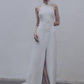 Abito da sposa linea pulita con scollo all'americana e spacco profondo sul davanti. La scollatura è profonda sulla schiena, impreziosita da fiori in organza tridimensionali.