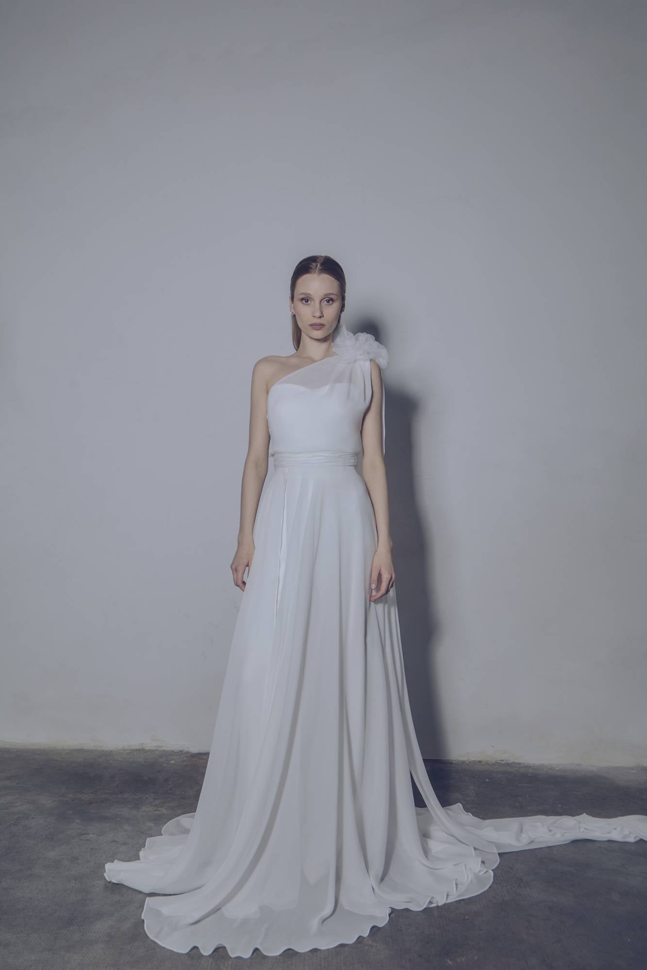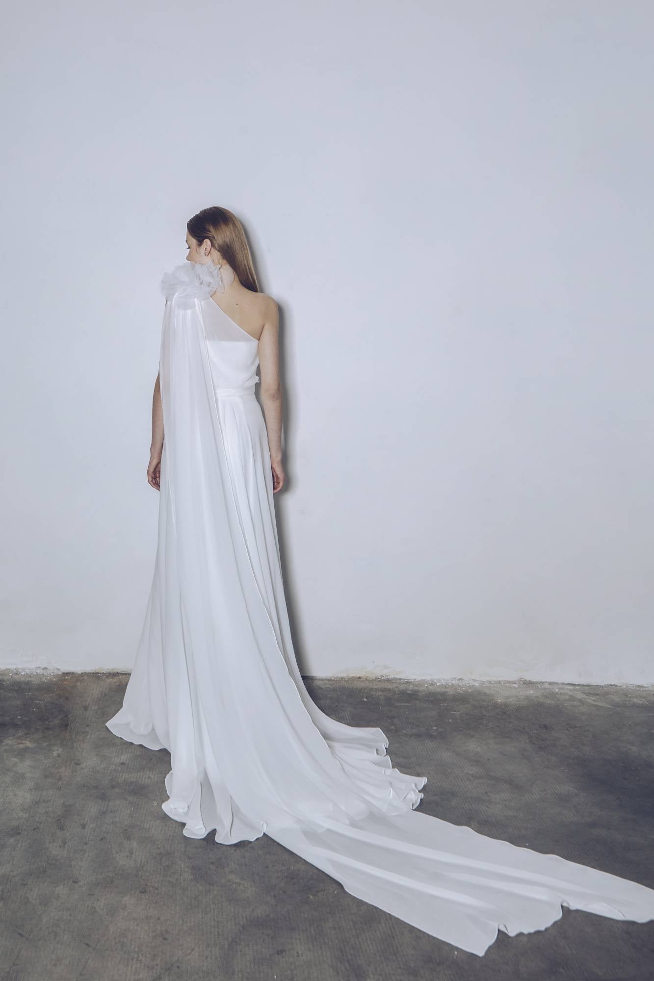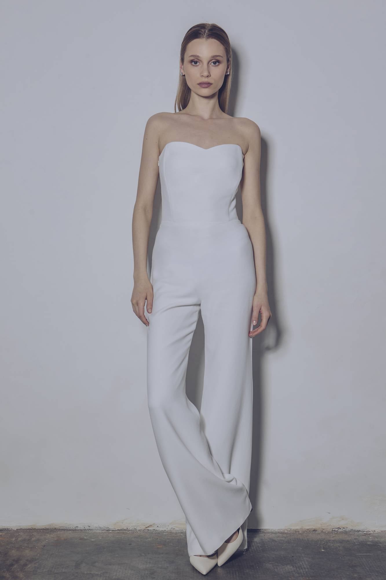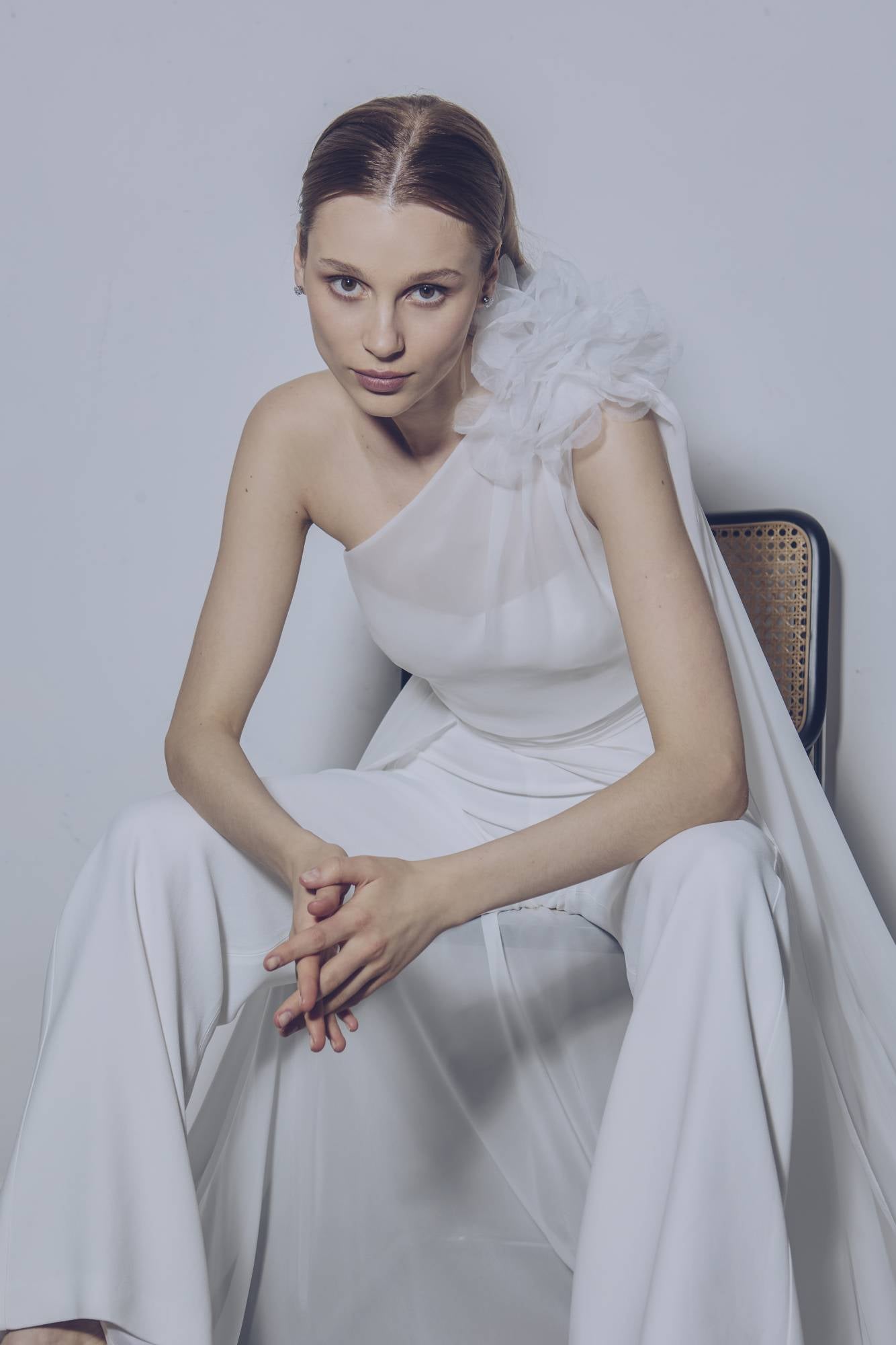 Tuta pantalone da sposa in crepe con corpino strutturato, scollato a cuore, abbinato a uno spolverino in chiffon con spacco e fiore tridimensionale in organza. Un abito sofisticato, moderno e dinamico.