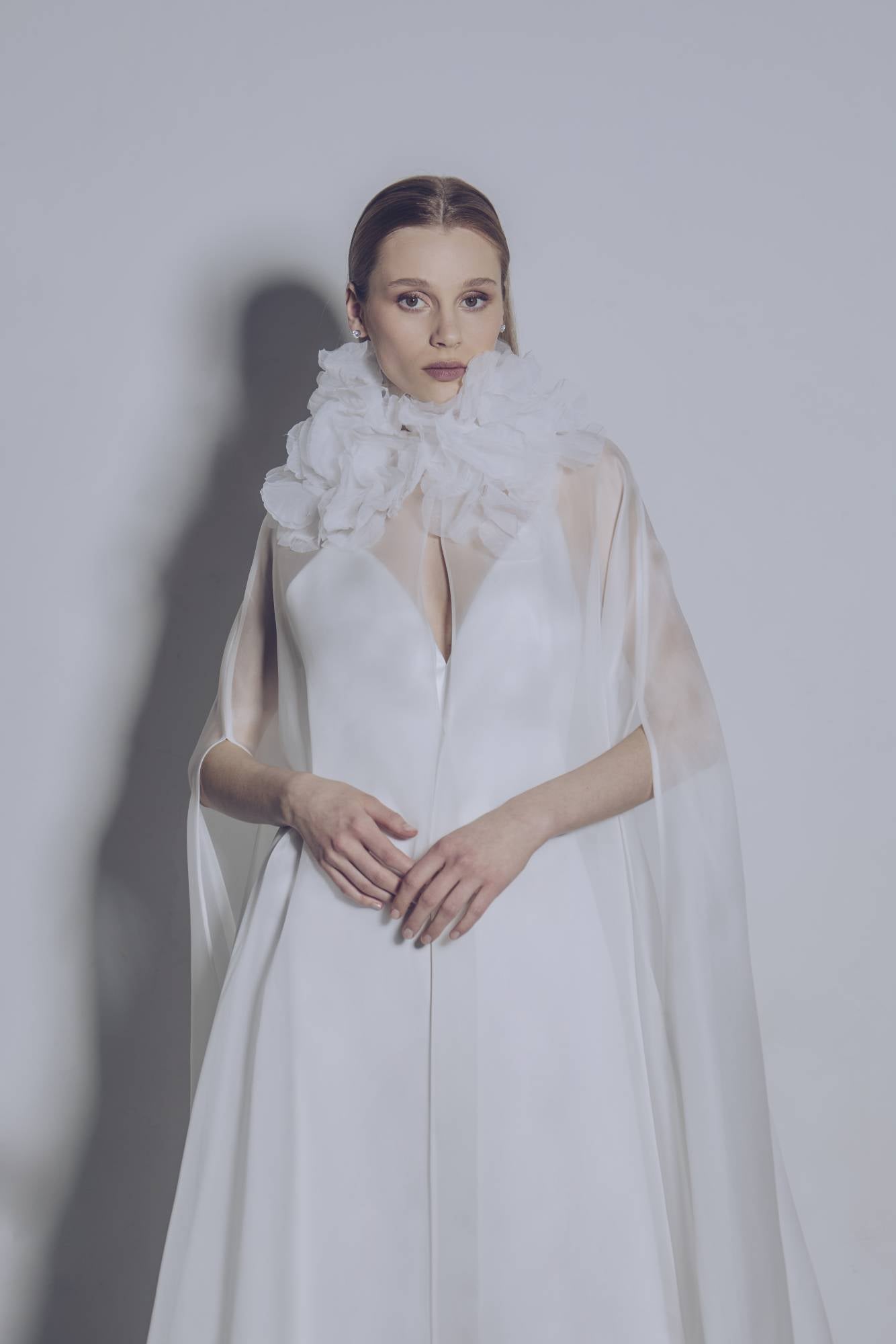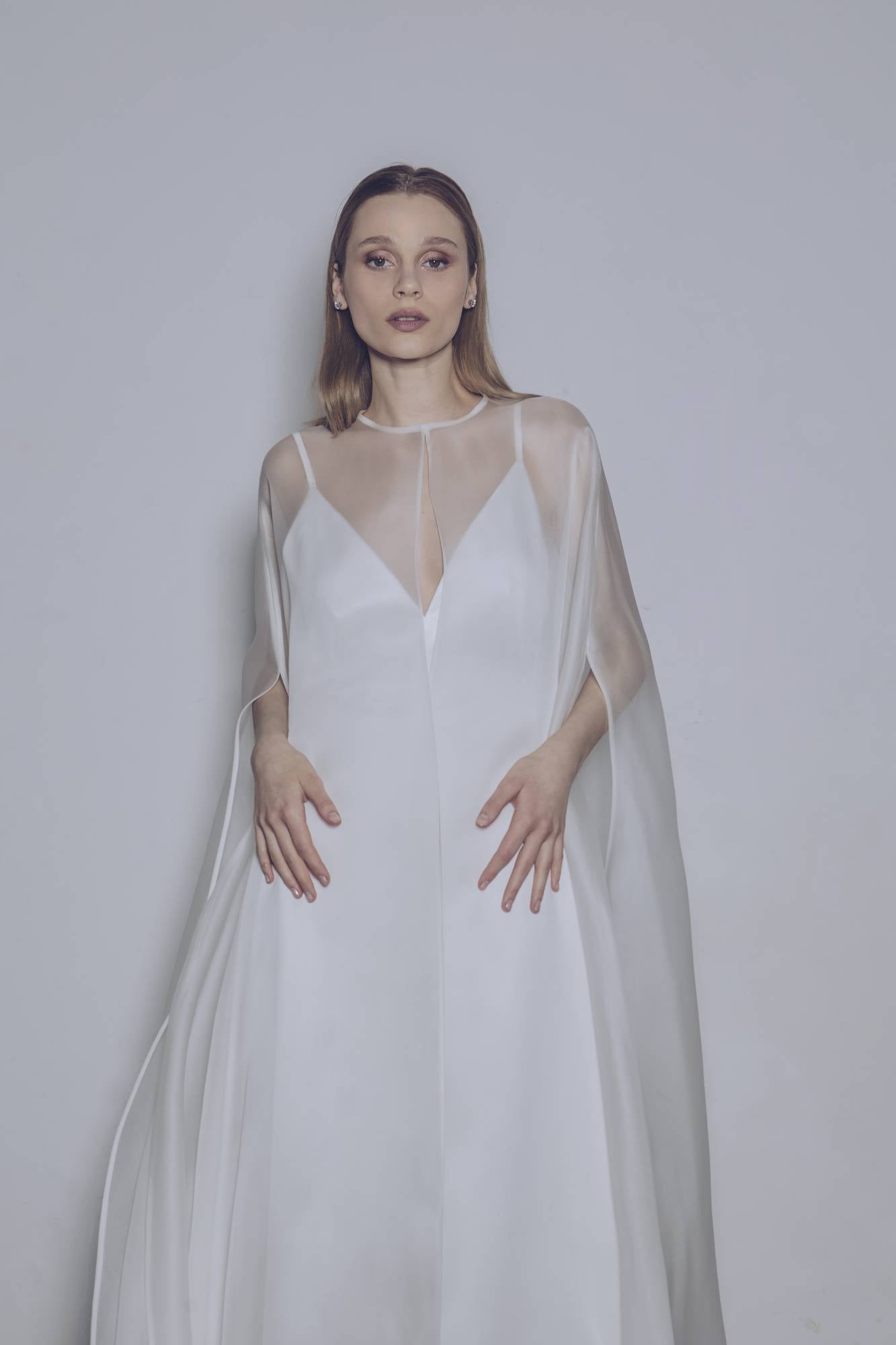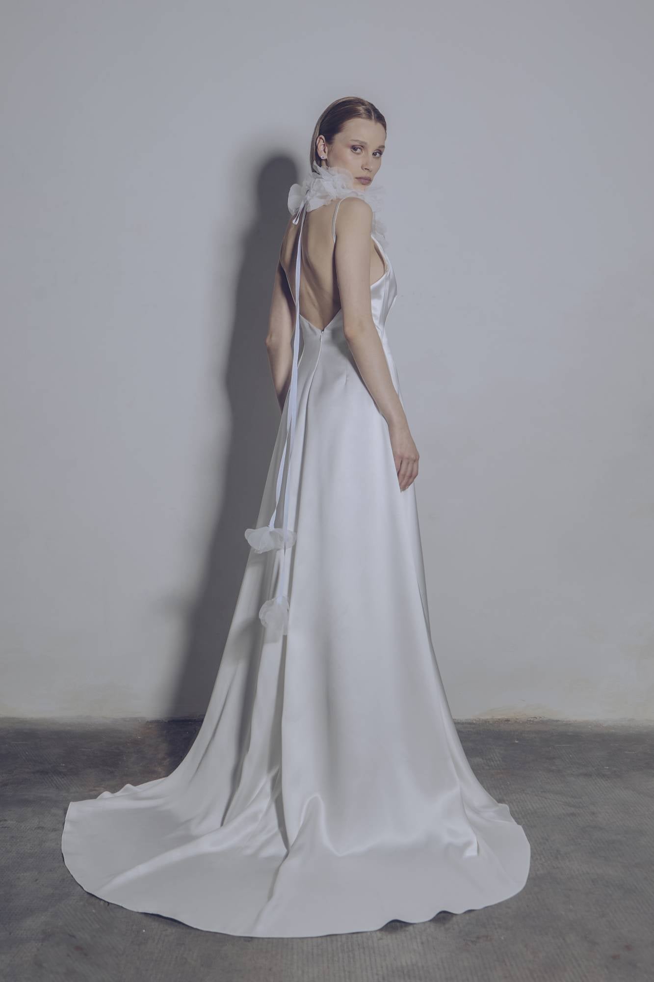 Abito da sposa dalla linea fluida scivolata con profonda scollatura e spalline sottili.