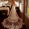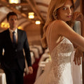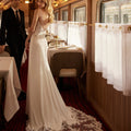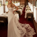 Abito a sirena con scollo dritto e spalline gioiello con corpino lavorato e gonna in crepe. Completa il look un sontuoso strascico rimovibile in tulle e pizzo.