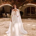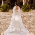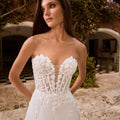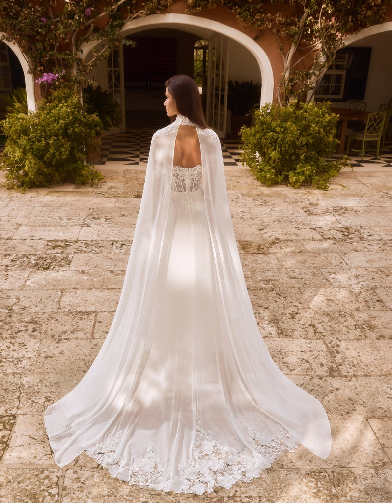 Abito da sposa dalla linea scivolata in chiffon con corpino effetto steccato realizzato in pizzo e ricamo luminoso.