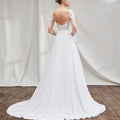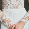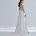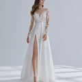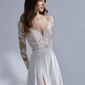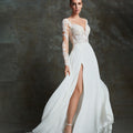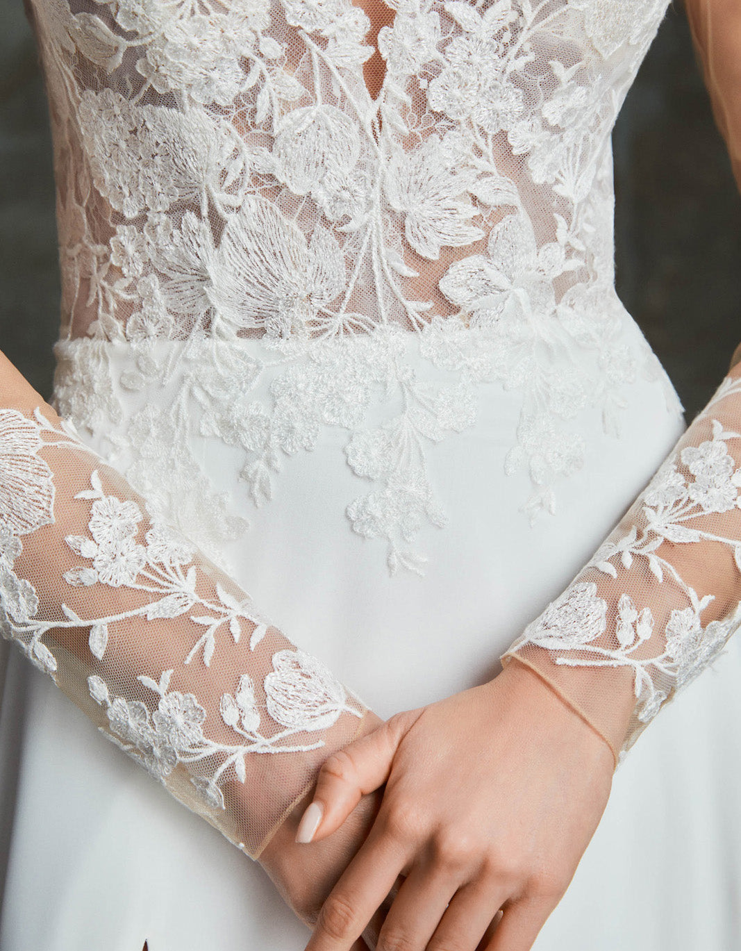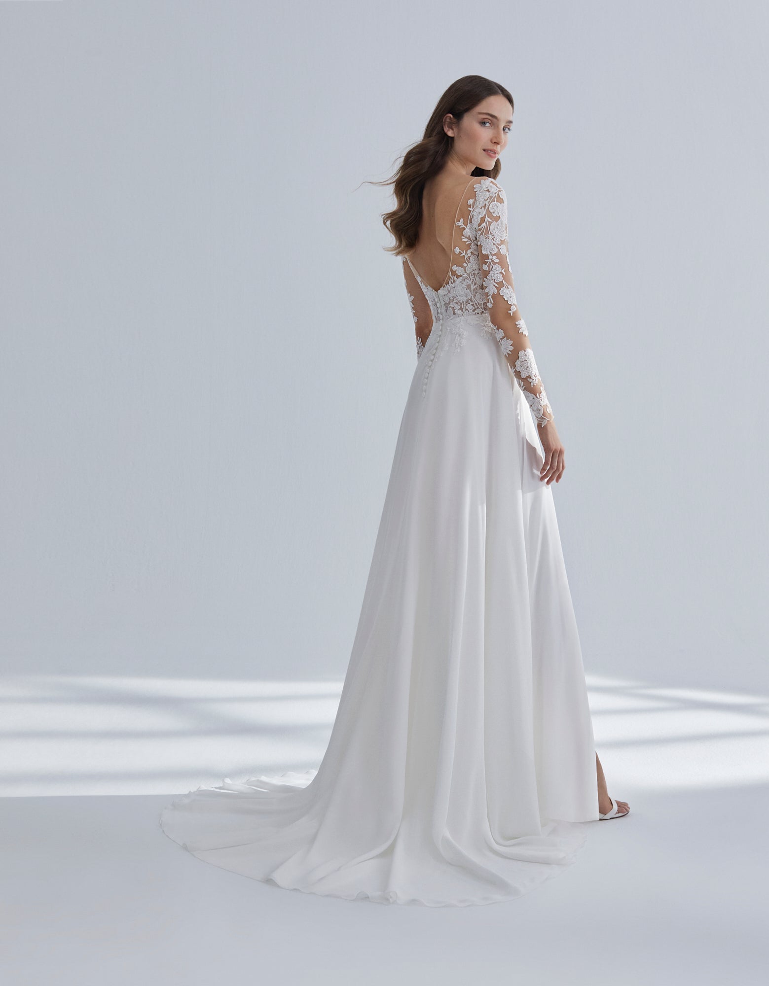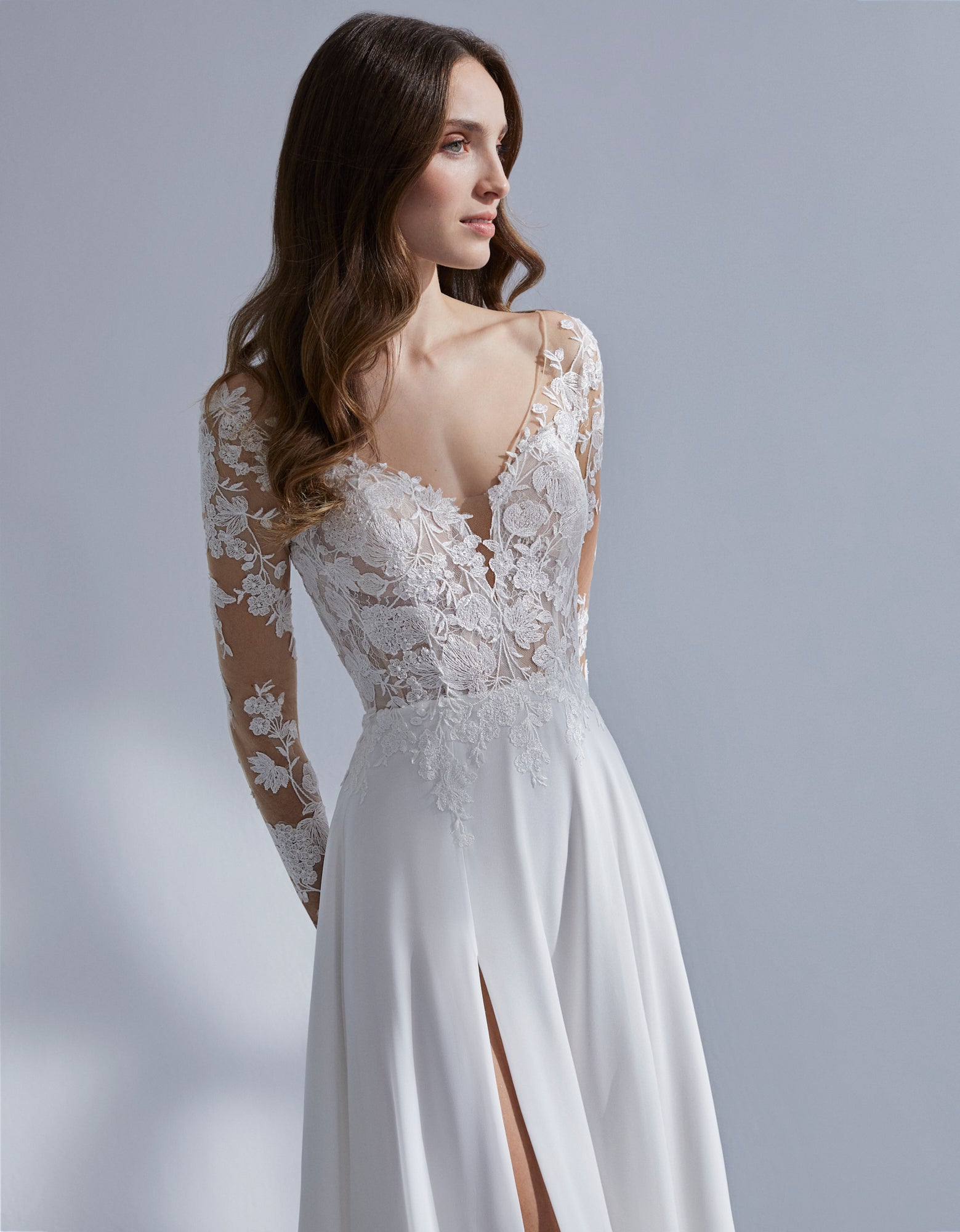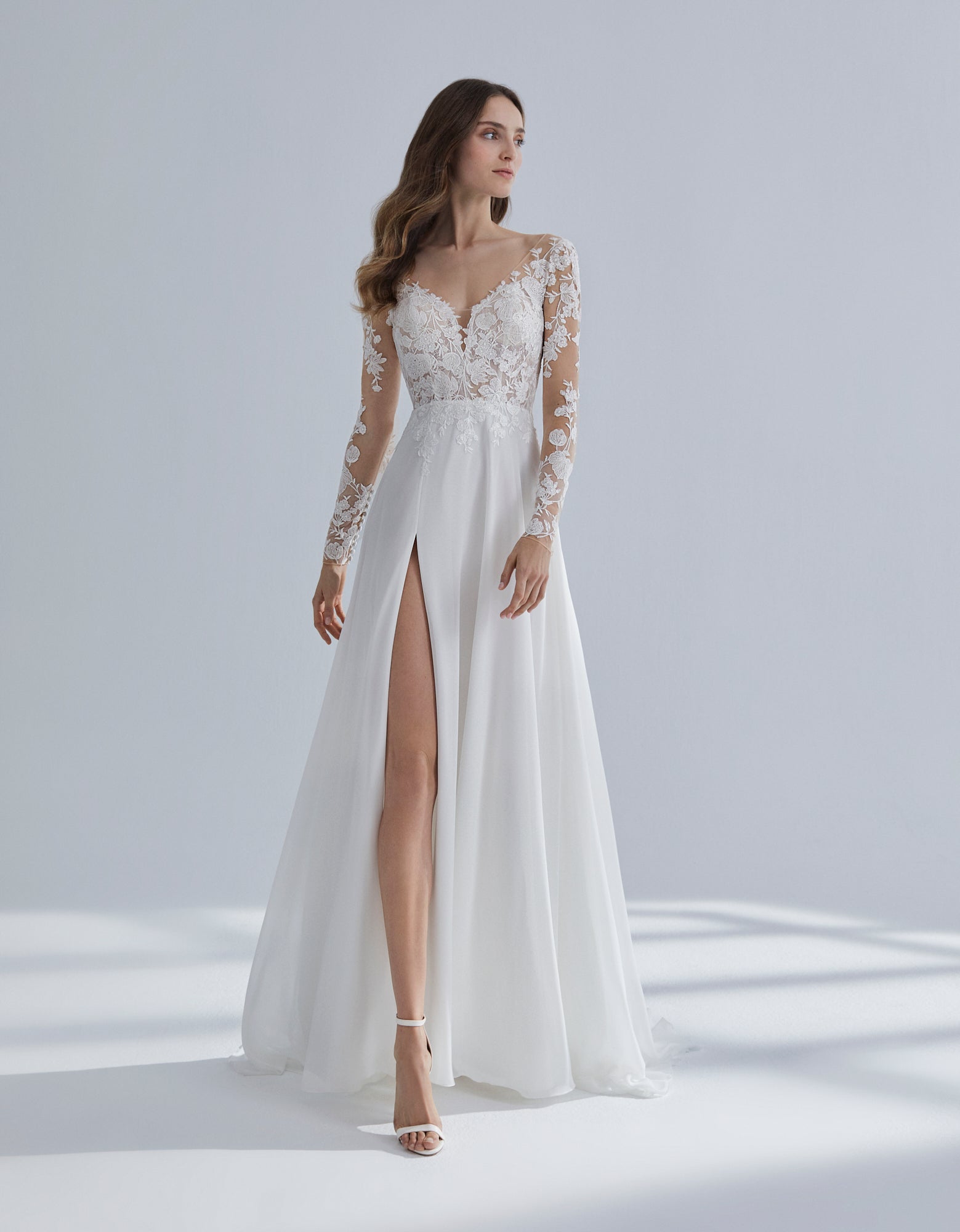 Abito dalla linea scivolata con maniche lunghe e corpino realizzato in pizzo chantilly e cristalli. La gonna in morbido chiffon ha uno spacco laterale che dona sensualità e dinamicità.