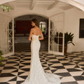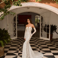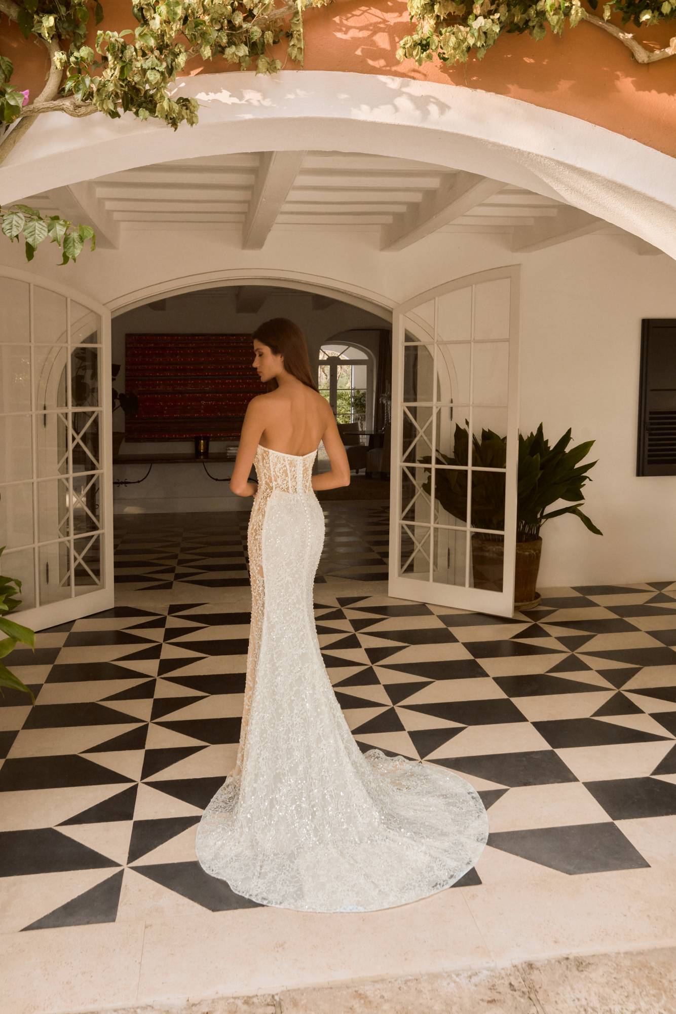 Abito a sirena con scollo a cuore e manicotti abbinati. L'abito presenta sensuali trasparenze sulla scollatura e lungo i fianchi.
