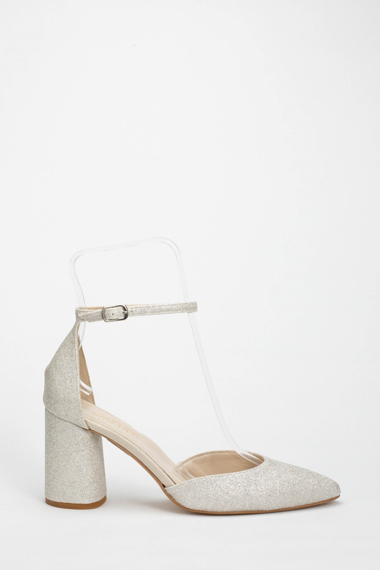 La décolleté da sposa Amber 9373 Palermo è la calzatura perfetta per chi sogna un look nuziale radioso e di classe, capace di coniugare un’estetica glamour a una stabilità eccellente. Realizzata in una scintillante finitura in glitter argento, questa scarpa è pensata per la sposa che vuole brillare, riflettendo la luce a ogni passo e aggiungendo un tocco di preziosa modernità al proprio abito. Il design si distingue per la sua linea chiusa classica e raffinata, che avvolge il piede con eleganza offrendo un supporto ottimale. Il vero punto di forza di questo modello è il tacco largo da 7 cm: un'altezza studiata per offrire il giusto slancio alla figura mantenendo una stabilità eccezionale. A completare la struttura è il delicato cinturino alla caviglia, che assicura una tenuta impeccabile e una calzata sicura durante tutto l'evento, dalla cerimonia ai balli. Come per ogni nostra proposta, è possibile richiedere la personalizzazione del modello per adattarlo perfettamente ai tuoi desideri: contattaci per scoprire come rendere unico il tuo paio di scarpe.
