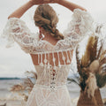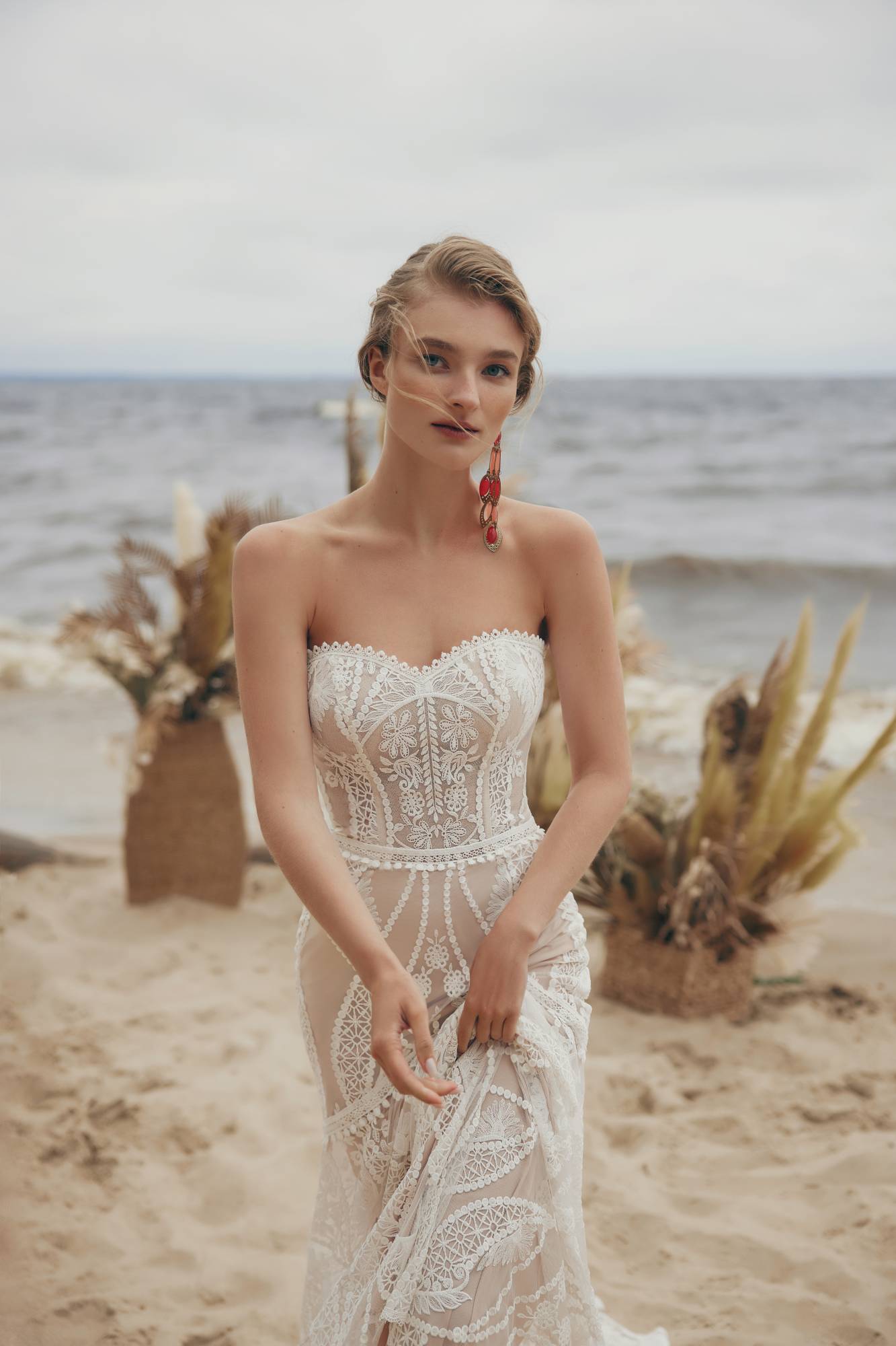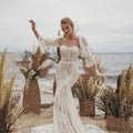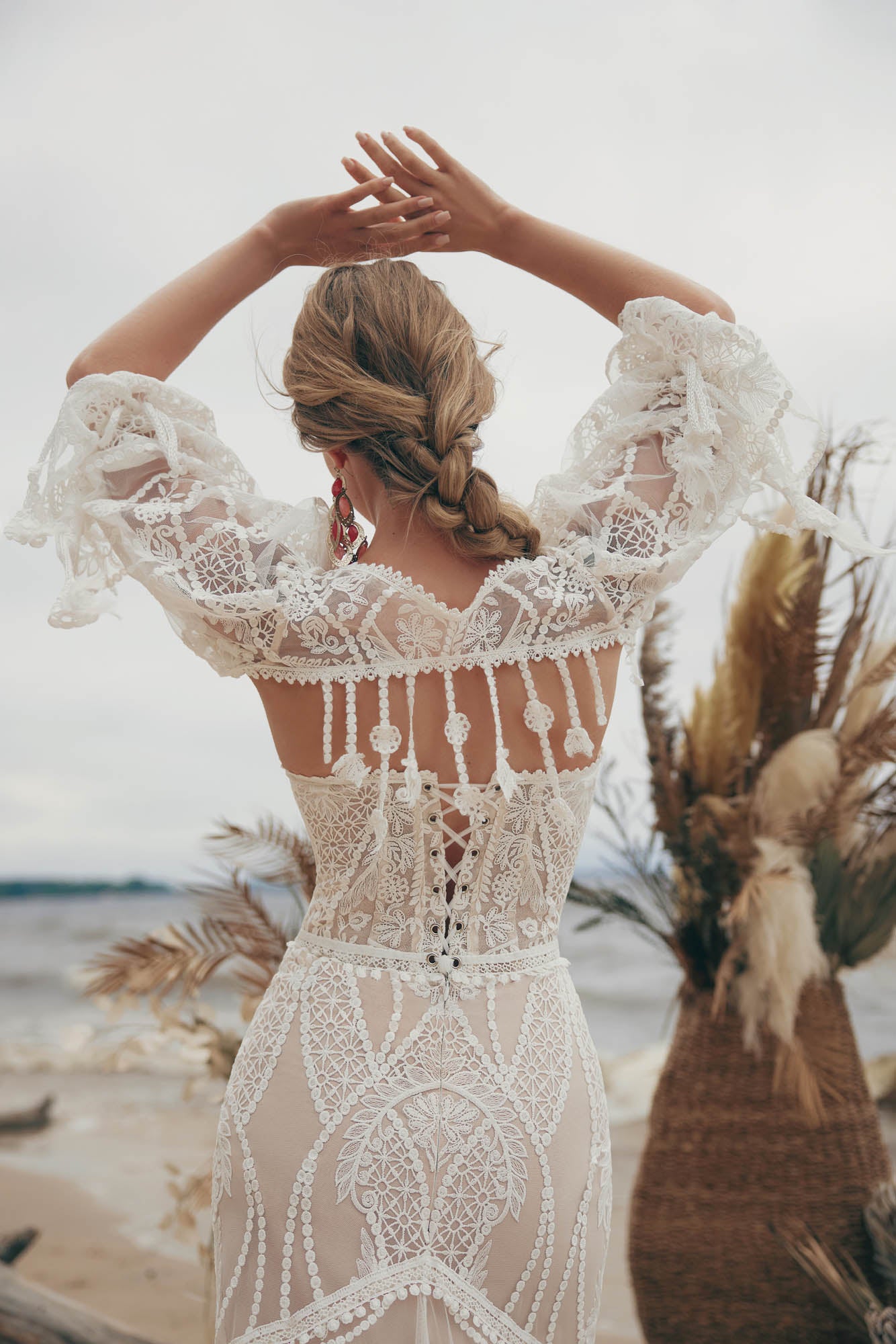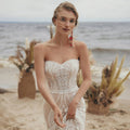 Abito da sposa a sirena effetto nude completamente ricamato da inserti di pizzo floreali con corpino scollo a cuore. Il bolero staccabile riprende lo stesso motivo dell'abito.
