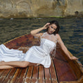 Abito da sposa a sirena in satin con corpino scollato dritto, morbido drappeggio sul fianco e spacco laterale sensuale. L'abito è abbinato a una cappa.
