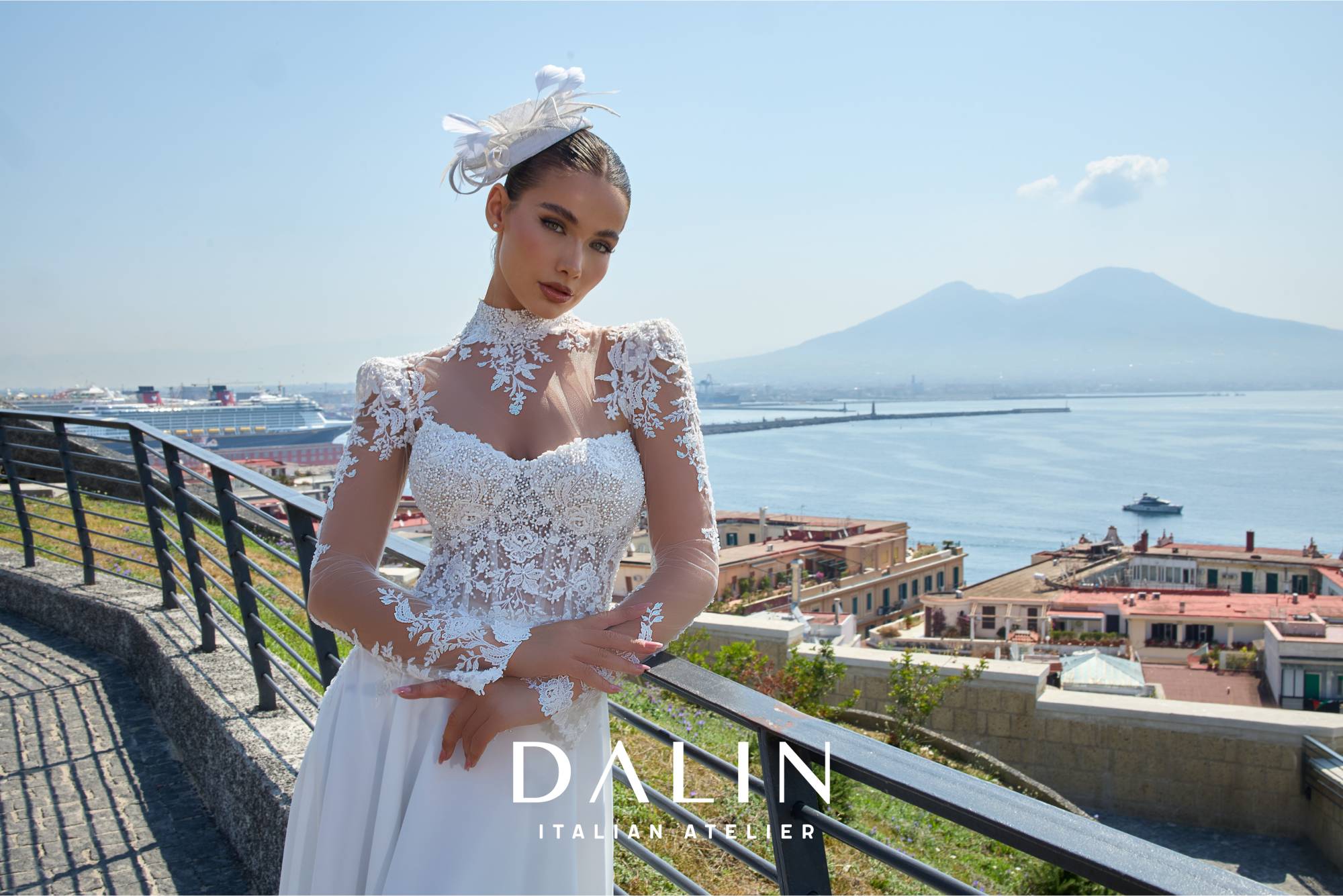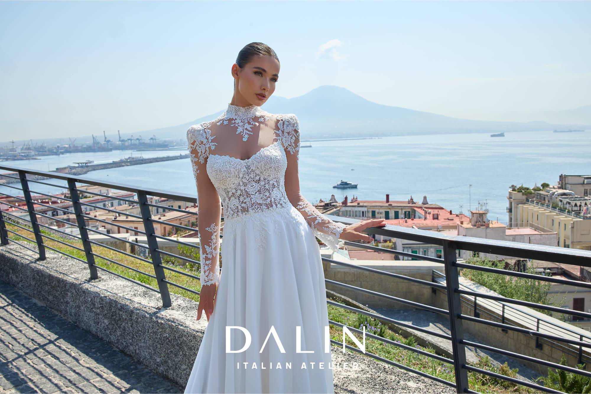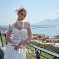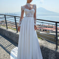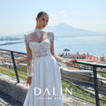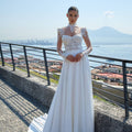 Abito da sposa scivolato con gonna in chiffon e corpino scollato a cuore geometrico, arricchito da applicazioni in pizzo e cristalli che finiscono morbidi sulla gonna. Il bolero a collo alto con spalline strutturate dona estrema eleganza all'abito.