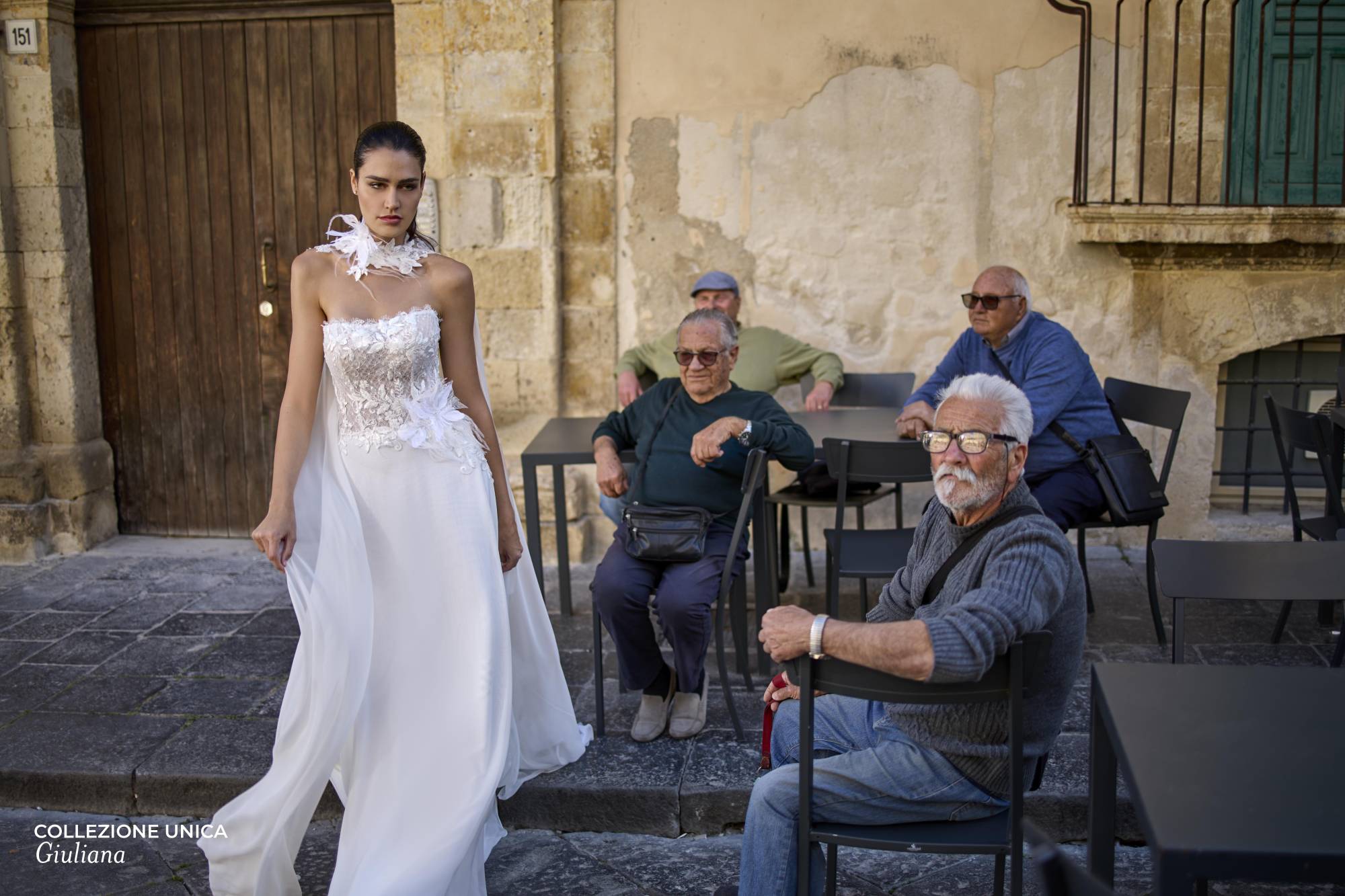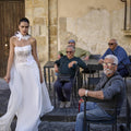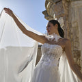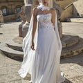 Abito da sposa in morbido chiffon con corpino ricamato e impreziosito da floreali applicazioni. Completa il look una mantella in chiffon rifinita con pizzo sul colletto.
