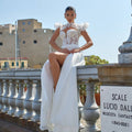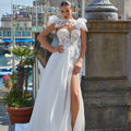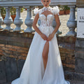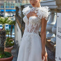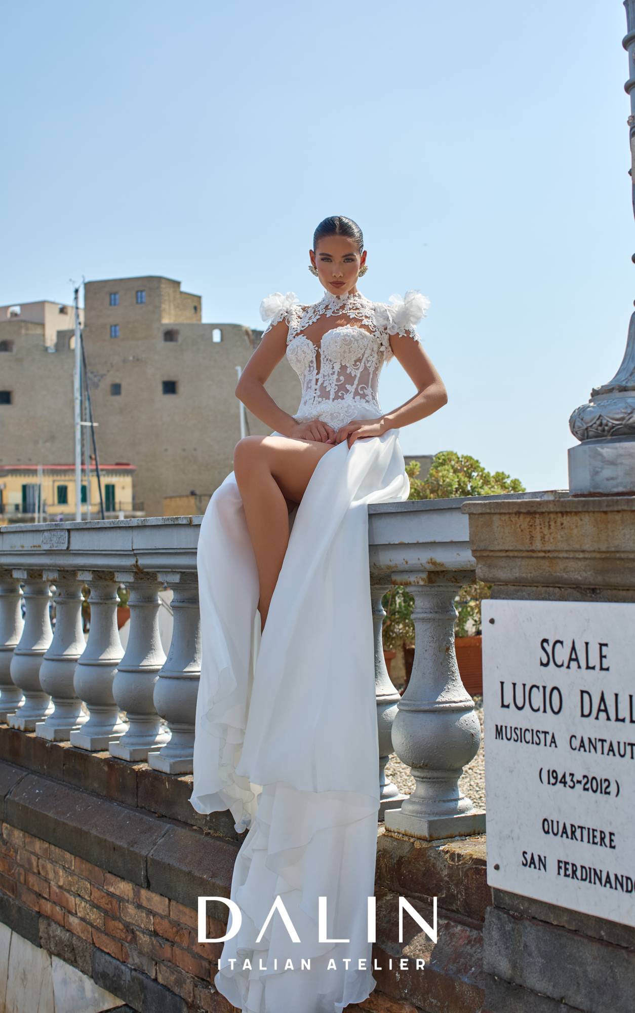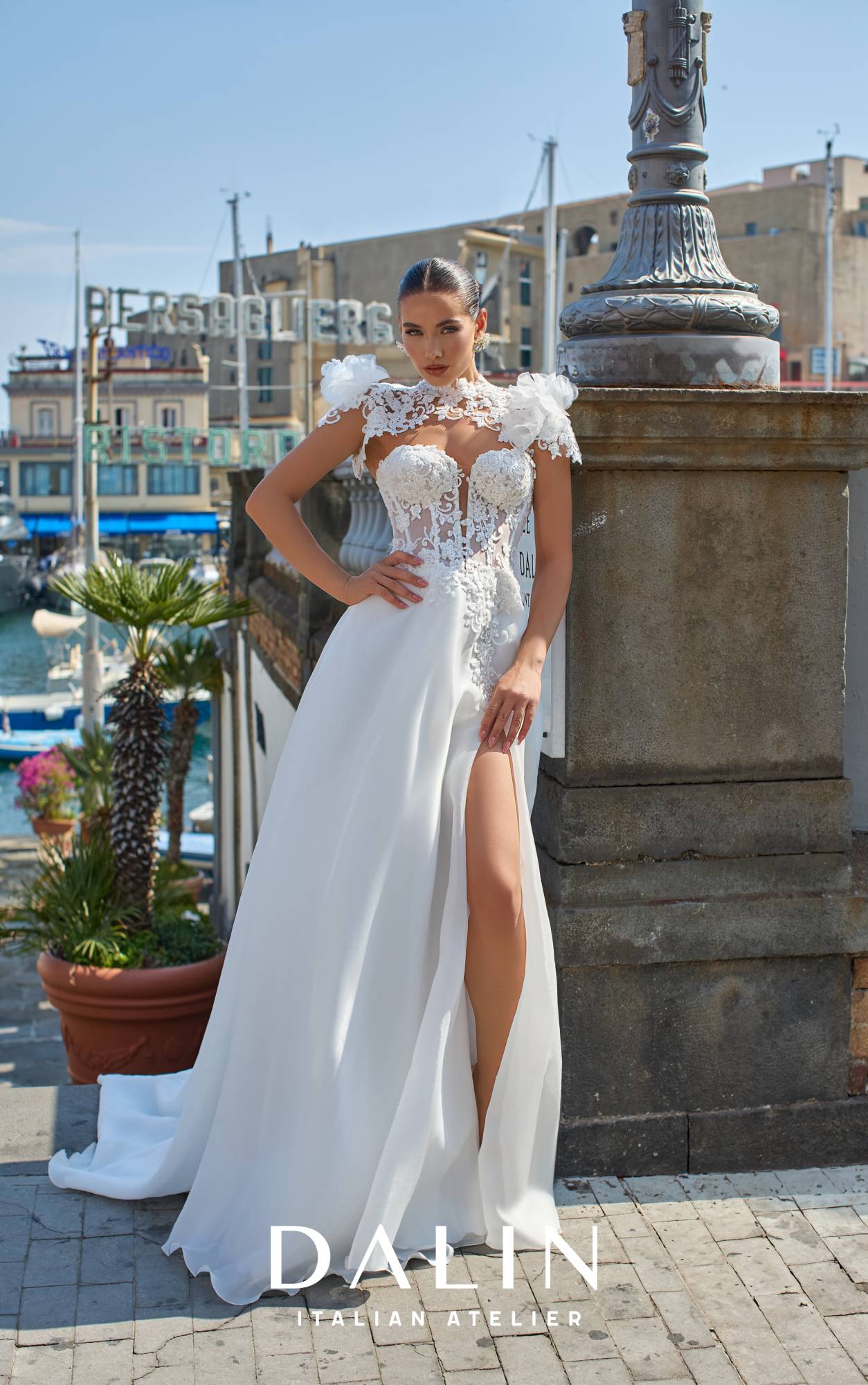 Abito da sposa in organza con gonna semi ampia e spacco laterale. Il corpino è finemente realizzato in pizzo e ricamo prezioso con sensuali trasparenze. Il bolero abbinato, con pizzo colletto alto e spalline tridimensionali, dona un tocco frizzante e sofisticato.