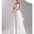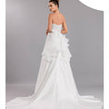 Abito da sposa in satin con gonna pulita e balze sulla parte posteriore e corpetto con applicazioni di pizzo e perline e scollatura morbida a cuore
