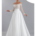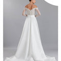 Meraviglioso abito da principessa in mikado con corpino prezioso con scollo omerale e maniche lunghe. Il corpino è finemente realizzato in pizzo ricamato con cristalli e perle. Il punto vita è esaltato da una fascia alta impreziosita da una cinta fina di cristalli e perle.