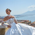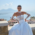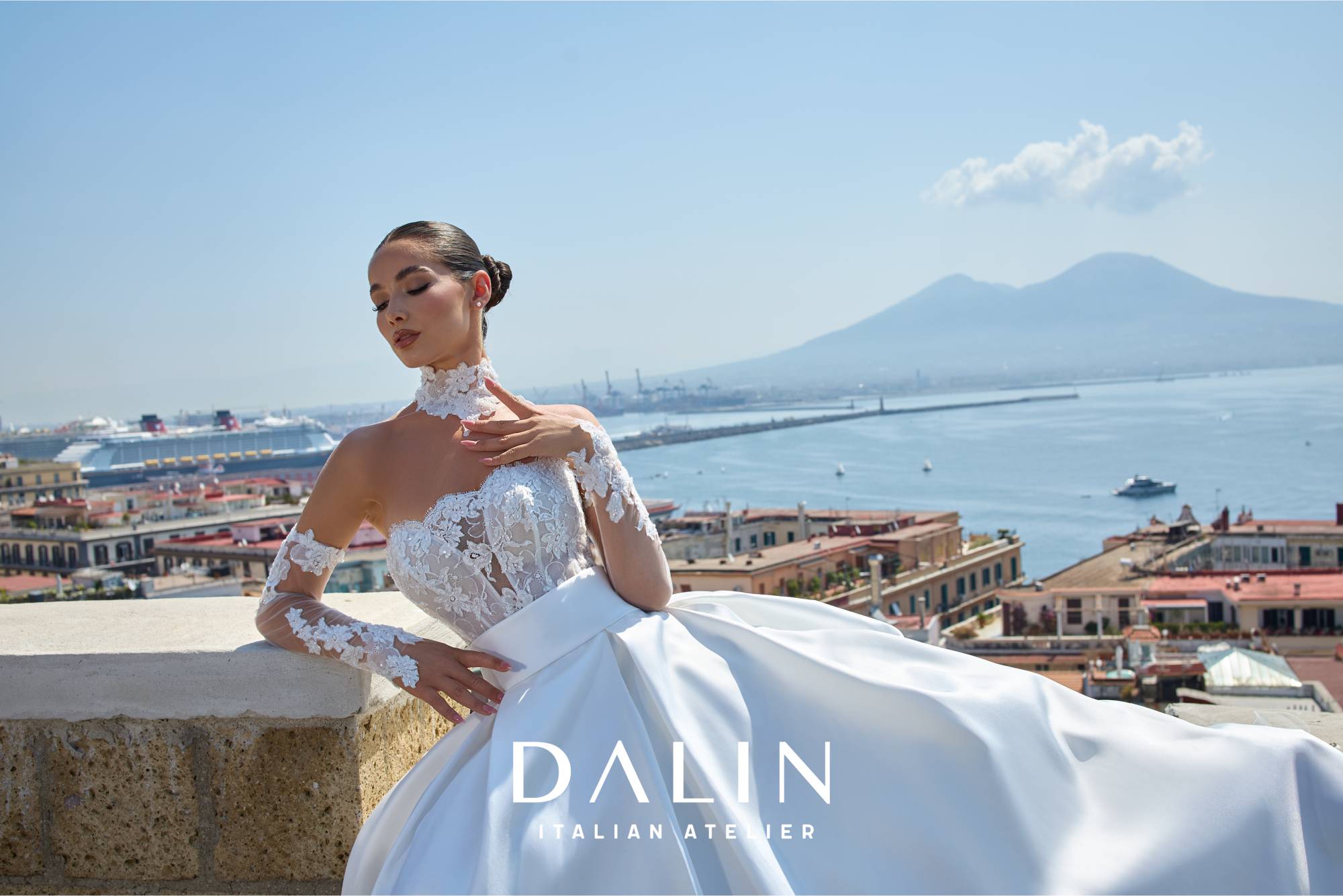 Abito da sposa da principessa con ampia gonna in mikado, fascia alta in vita e corpino romantico in pizzo con scollo dritto. Completano il look i manicotti aderenti in tulle e pizzo e il collarino.