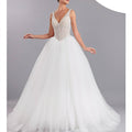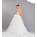 Abito da sposa principesco con gonna ampia in tulle semplice e corpino effetto bustier semitrasparente con stecche a vista, scollo a V, interamente ricoperto da cristalli.