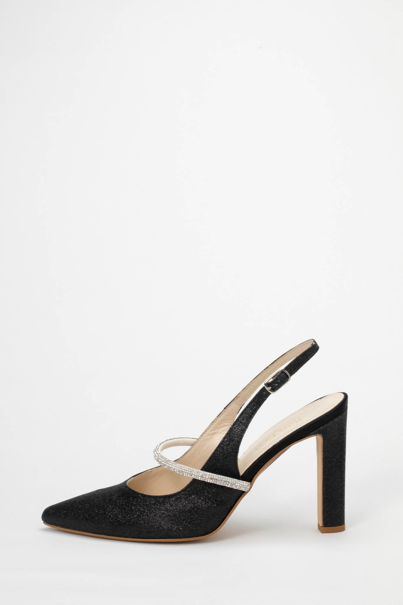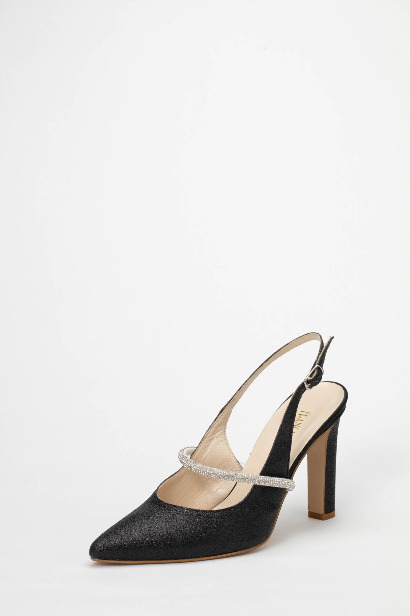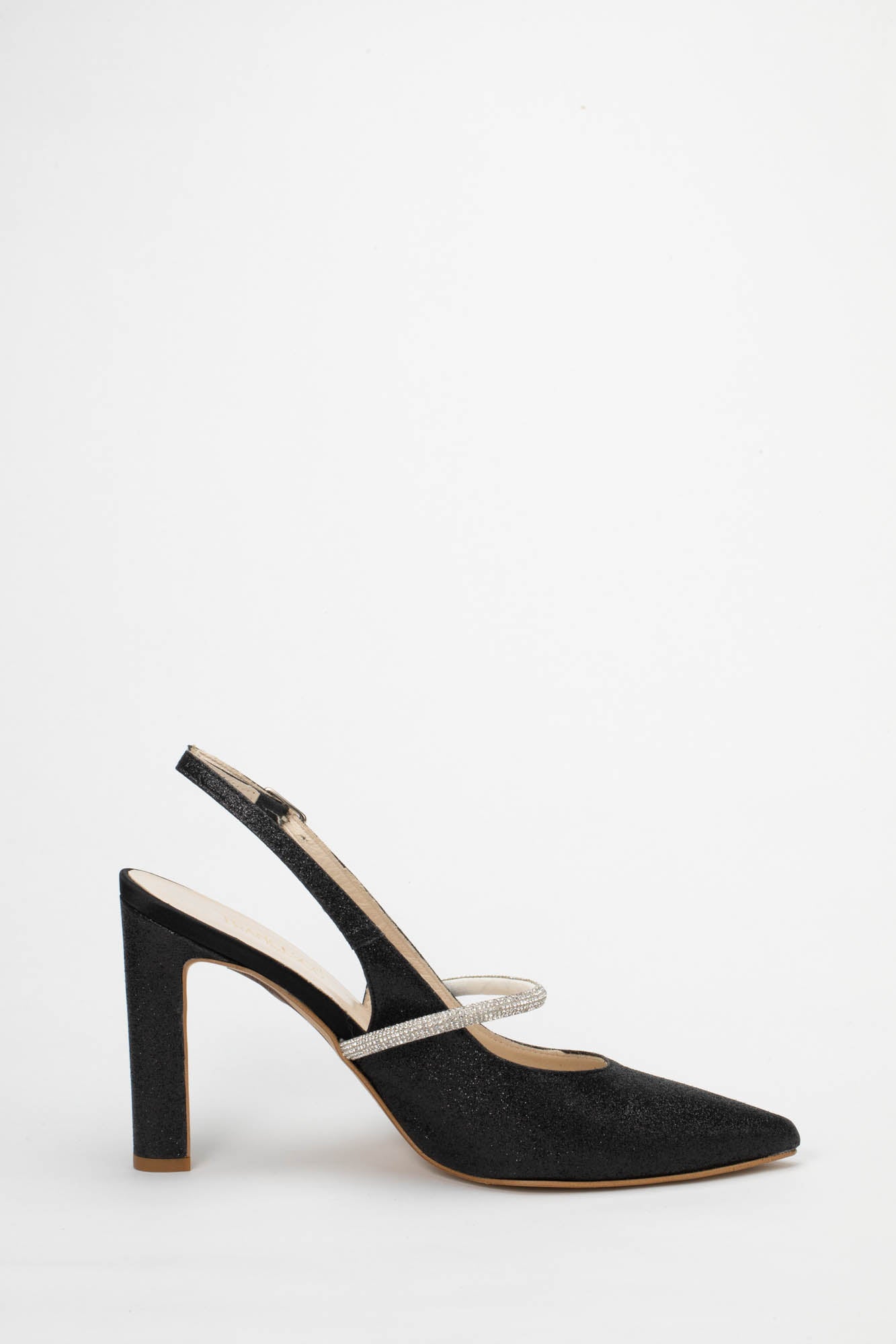 La scarpa da sposa modello 8912 è la quintessenza dell'eleganza moderna, dedicata a chi desidera unire una silhouette slanciata a un dettaglio luce di grande impatto. Questa splendida décolleté slingback è realizzata in un sofisticato glitter nero, una finitura che conferisce una brillantezza notturna, perfetta per completare abiti nuziali e da cerimonia d’alta sartoria. Il carattere unico di questa calzatura è definito dal sottile tubolare di cristalli argento che avvolge con delicatezza il collo del piede, creando un effetto gioiello che illumina ogni passo e aggiunge una nota di lusso contemporaneo all'intero outfit. Il design della 8912 è studiato per esaltare la femminilità senza rinunciare alla stabilità, grazie a un tacco medio da 9 cm che offre un'altezza importante e una base d'appoggio sicura. La forma affusolata della punta si sposa con un cinturino posteriore regolabile, dotato di una discreta fibbia metallica, che permette di personalizzare la calzata garantendo che la scarpa rimanga ferma e confortevole durante tutto il rito e il successivo ricevimento. È la calzatura ideale per la sposa che cerca una statura regale e un design aperto, capace di slanciare la gamba con grazia e naturalezza. Come per ogni nostra proposta, è possibile richiedere la personalizzazione del modello per renderlo unico: contattaci per scoprire come adattare questa creazione al tuo stile.