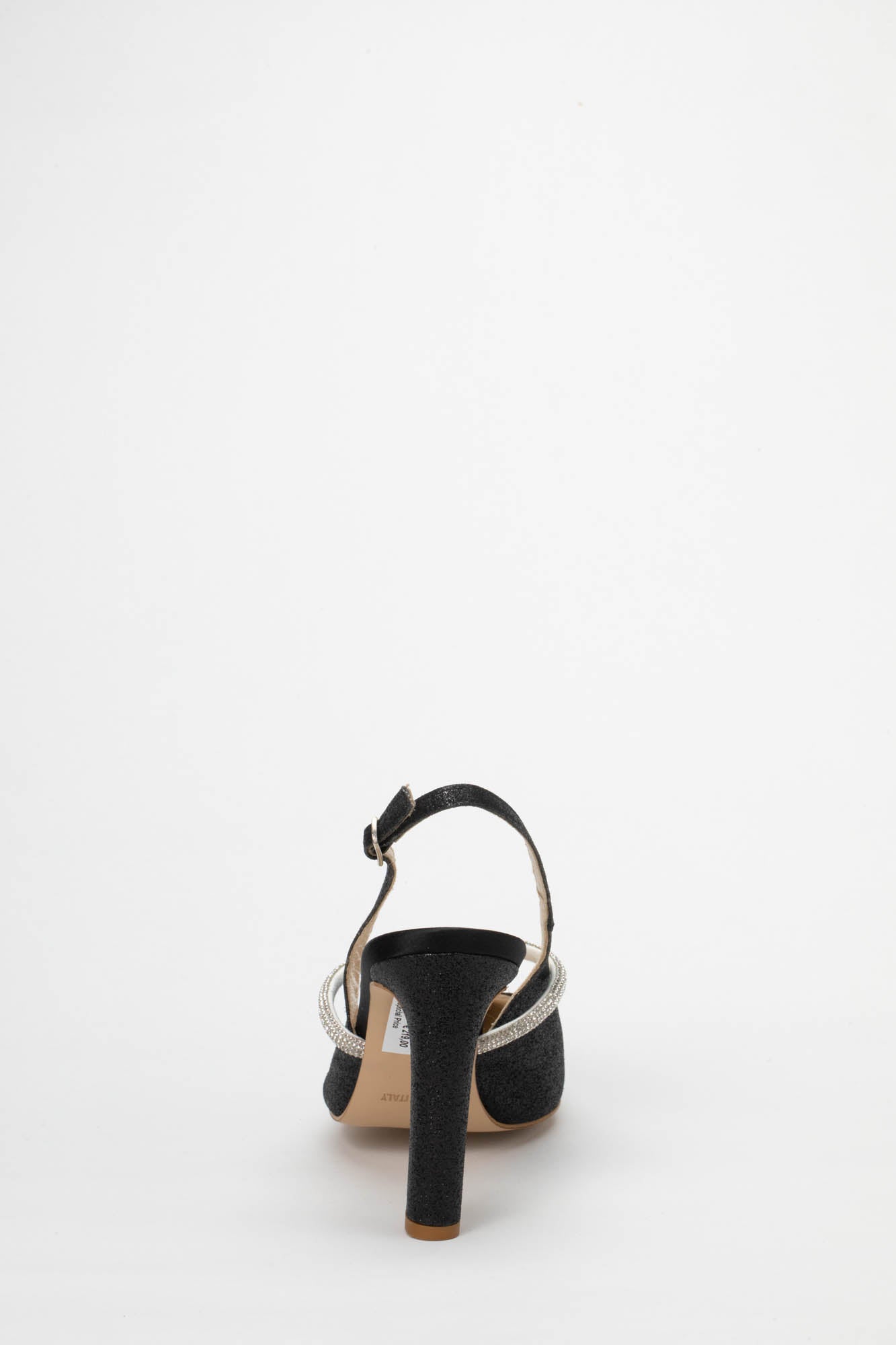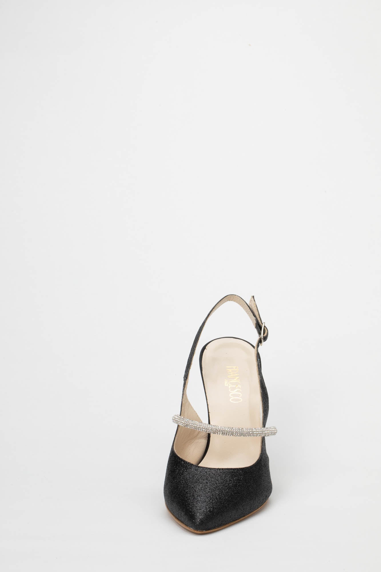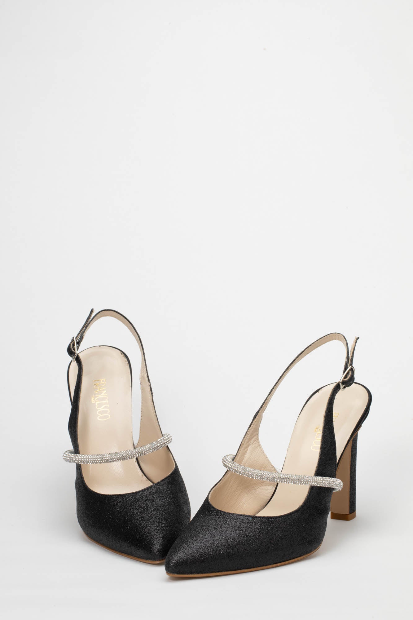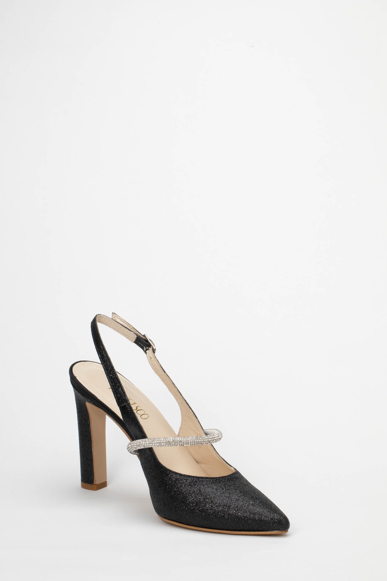 La scarpa da sposa modello 8912 è la quintessenza dell'eleganza moderna, dedicata a chi desidera unire una silhouette slanciata a un dettaglio luce di grande impatto. Questa splendida décolleté slingback è realizzata in un sofisticato glitter nero, una finitura che conferisce una brillantezza notturna, perfetta per completare abiti nuziali e da cerimonia d’alta sartoria. Il carattere unico di questa calzatura è definito dal sottile tubolare di cristalli argento che avvolge con delicatezza il collo del piede, creando un effetto gioiello che illumina ogni passo e aggiunge una nota di lusso contemporaneo all'intero outfit. Il design della 8912 è studiato per esaltare la femminilità senza rinunciare alla stabilità, grazie a un tacco medio da 9 cm che offre un'altezza importante e una base d'appoggio sicura. La forma affusolata della punta si sposa con un cinturino posteriore regolabile, dotato di una discreta fibbia metallica, che permette di personalizzare la calzata garantendo che la scarpa rimanga ferma e confortevole durante tutto il rito e il successivo ricevimento. È la calzatura ideale per la sposa che cerca una statura regale e un design aperto, capace di slanciare la gamba con grazia e naturalezza. Come per ogni nostra proposta, è possibile richiedere la personalizzazione del modello per renderlo unico: contattaci per scoprire come adattare questa creazione al tuo stile.