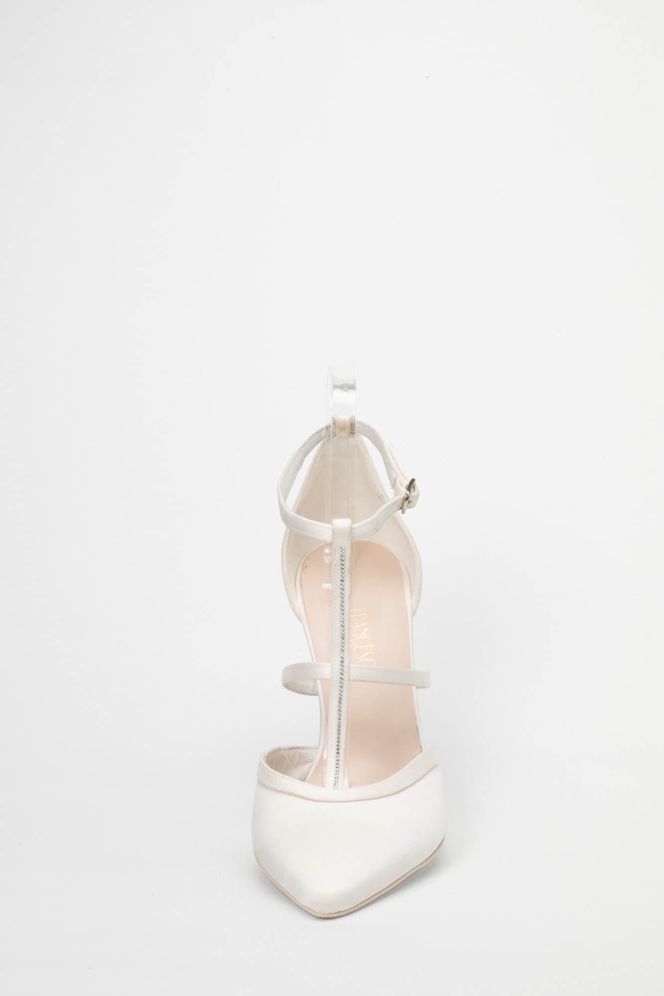 Il modello 9515 è la scelta d'eccellenza per la sposa che desidera unire un'estetica glamour alla massima sicurezza del passo. Questa décolleté si distingue per la sua preziosa finitura in strass, una texture luminosa pensata per riflettere ogni raggio di luce e trasformare la calzatura nel punto focale dell'intero outfit nuziale. Il cuore del design è rappresentato da un tacco fine di 7,5 cm, un'altezza media che garantisce uno slancio elegante alla figura mantenendo una portabilità eccezionale per tutta la durata dell'evento. La scelta di una silhouette senza plateau accentua la purezza delle linee. La stabilità e la sicurezza della calzata sono assicurate dal raffinato sistema di chiusura a cinturino alla caviglia. Il cinturino sottile e regolabile, unito alla struttura chiusa del tallone, permette alla scarpa di assecondare perfettamente ogni movimento.