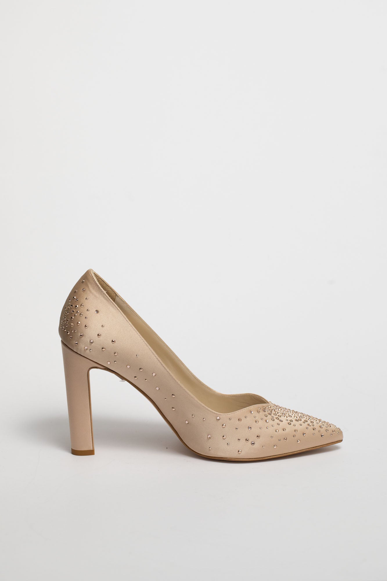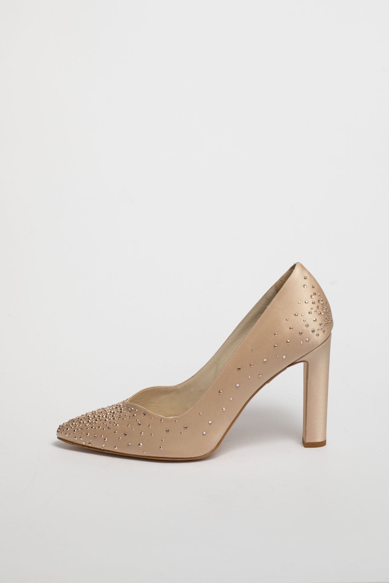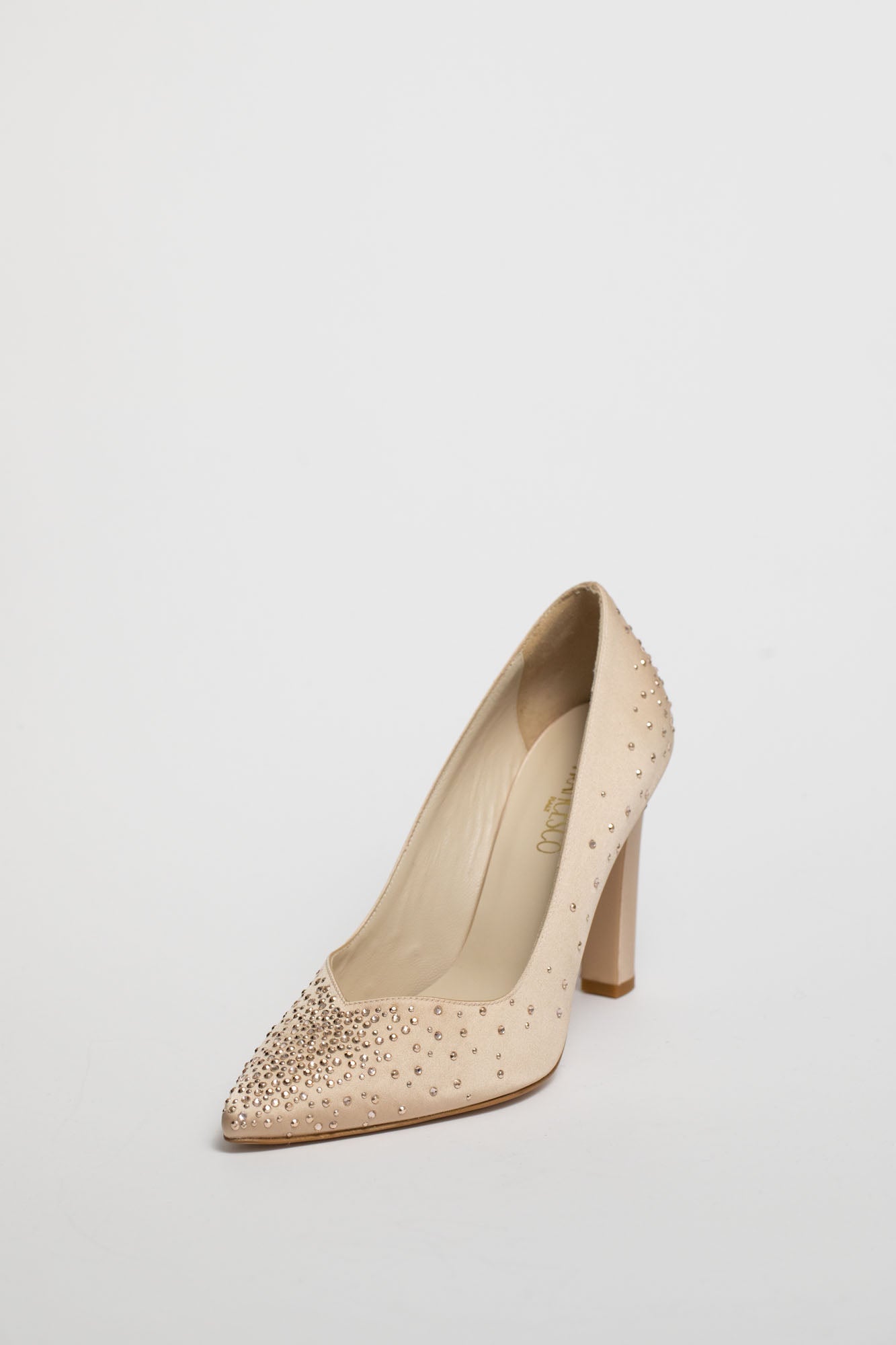 La scarpa da sposa modello TORINO 9730 rappresenta la scelta ideale per chi sogna un matrimonio all'insegna del lusso e della ricercatezza. Questa splendida décolleté a punta si distingue per la sua finitura in pregiato satin dalle delicate tonalità cipria, una nuance versatile che si sposa armoniosamente sia con gli abiti bianco seta che con le proposte più moderne in avorio o champagne. La tomaia è impreziosita da una cascata di cristalli luminosi applicati a mano, che si addensano sulla punta per poi diradarsi elegantemente verso il tallone, catturando ogni riflesso di luce e trasformando ogni passo in un piccolo spettacolo luminoso.