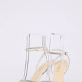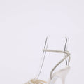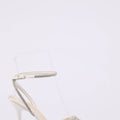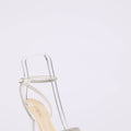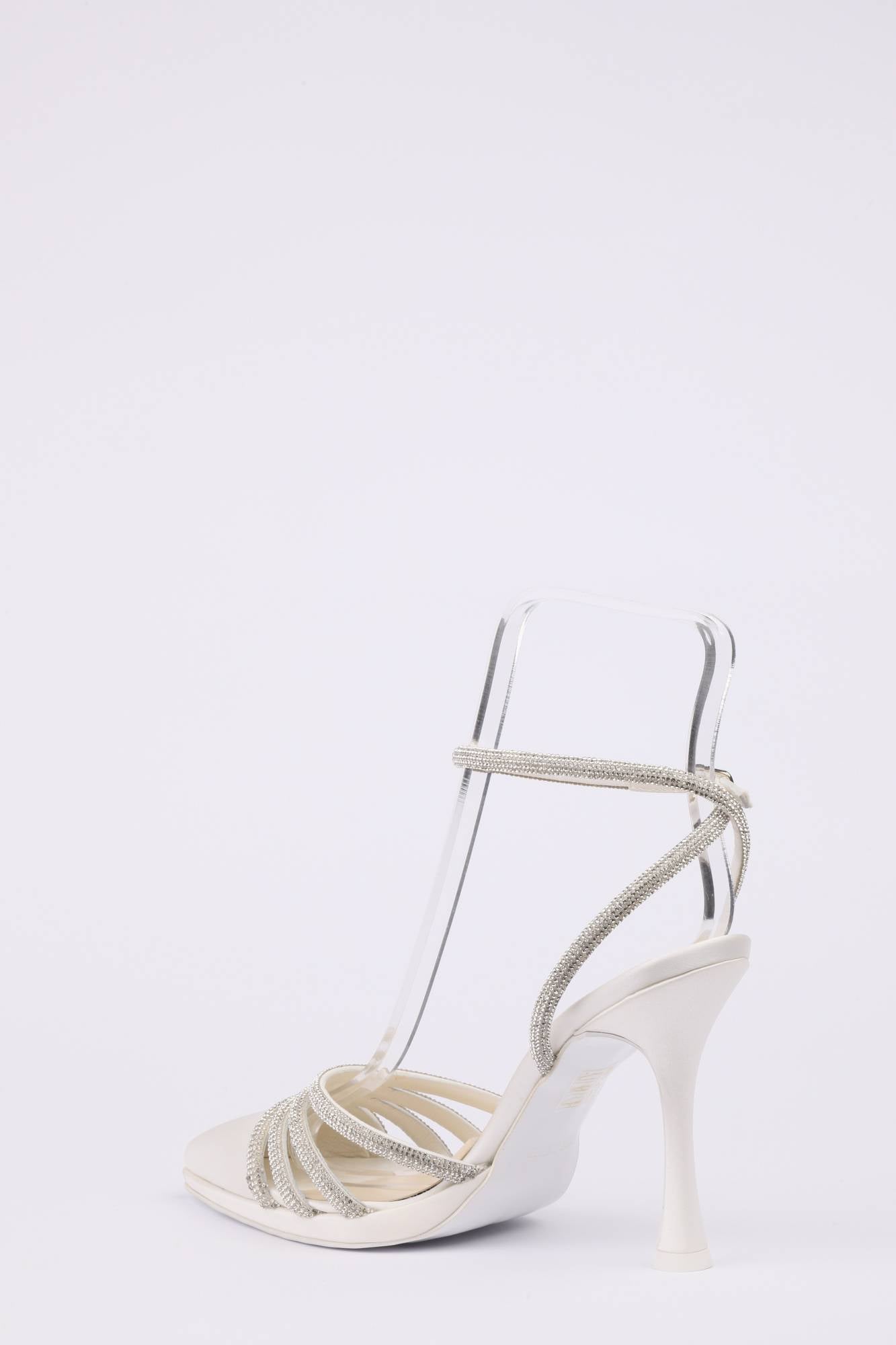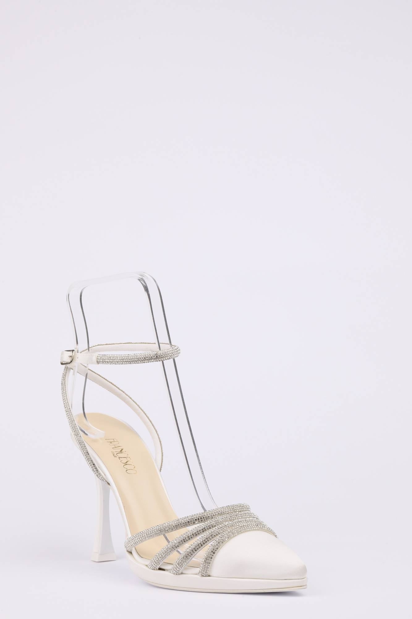 Decolleté in satin avorio con tubolari luminosi argento sulla punta e sul cinturino a incrocio. Leggero plateau e tacco a clessidra fino 10 cm.