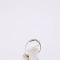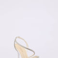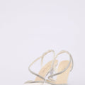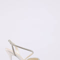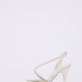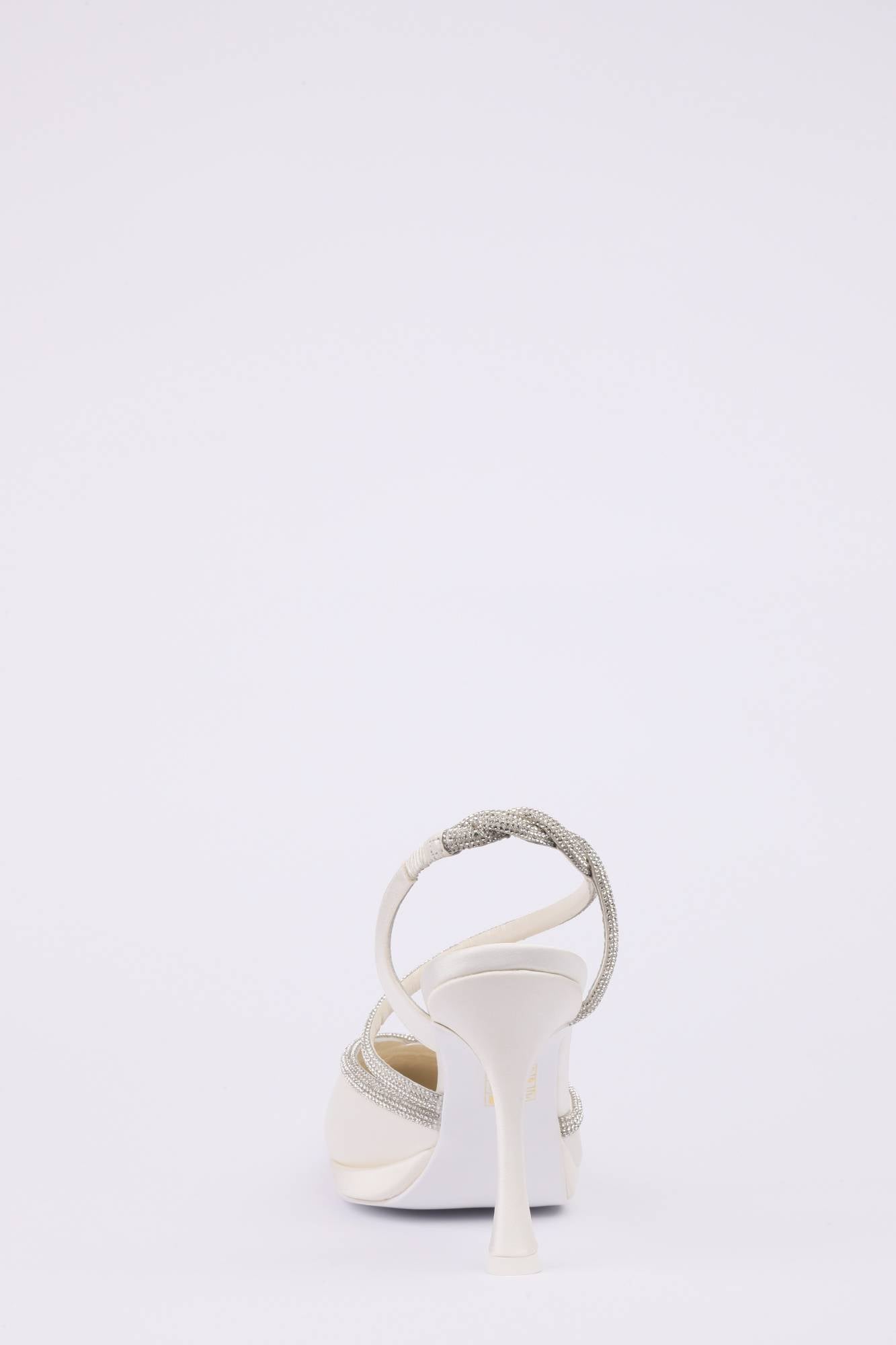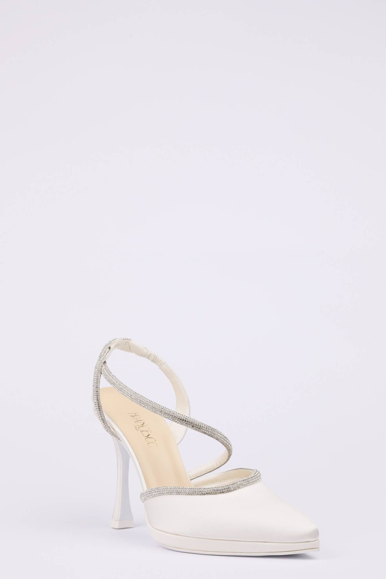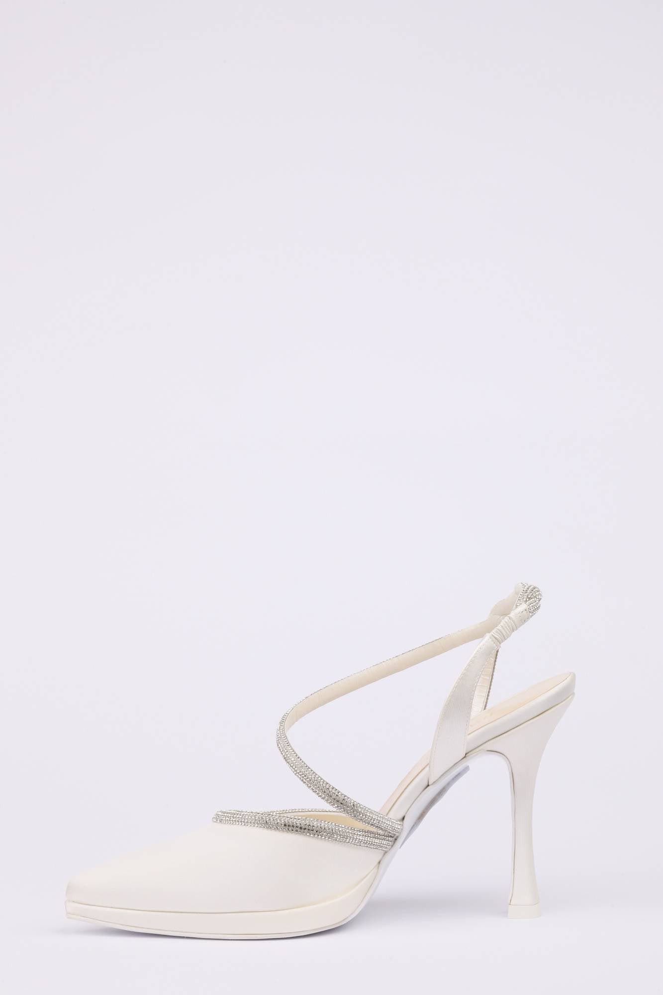 Decolleté in satin con plateau basso e tacco a clessidra fino 10 cm. Elegante tubolare luminoso argento sul collo del piede e sul cinturino.