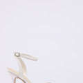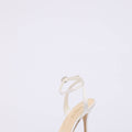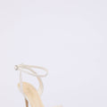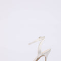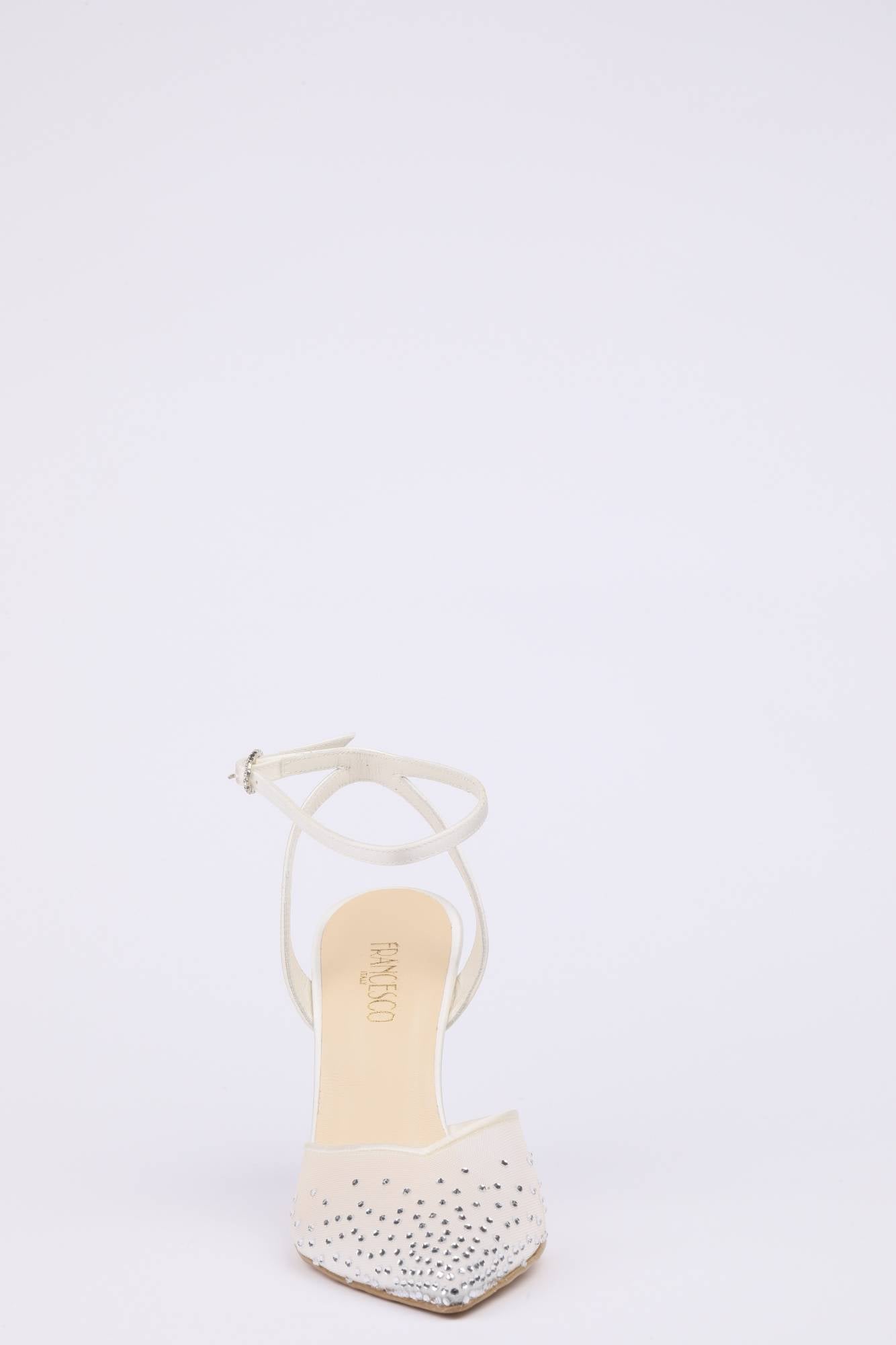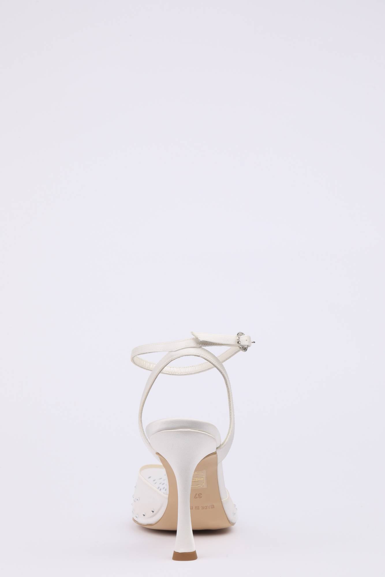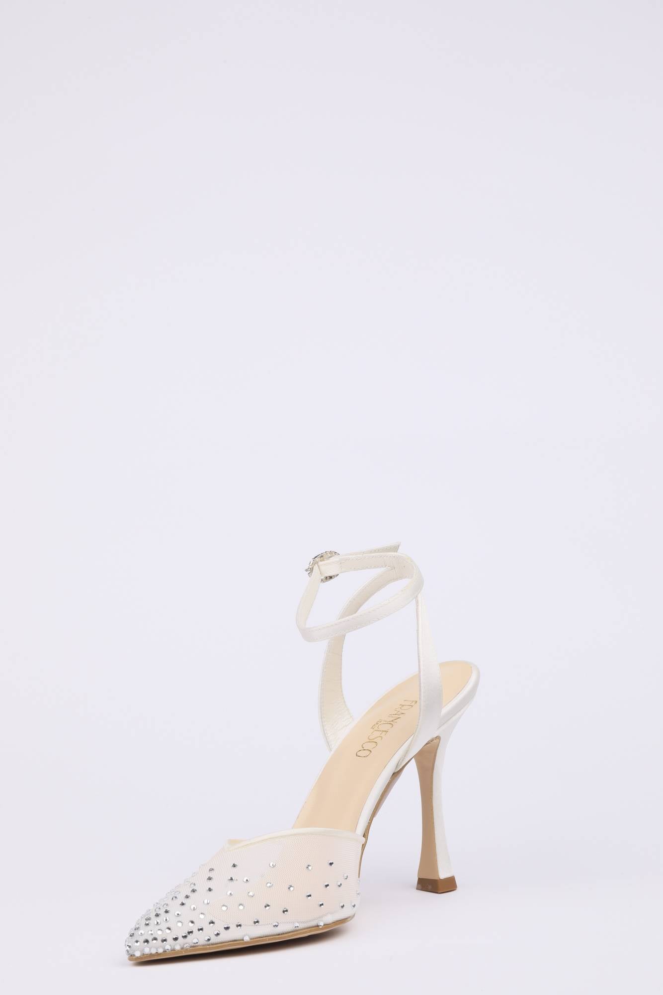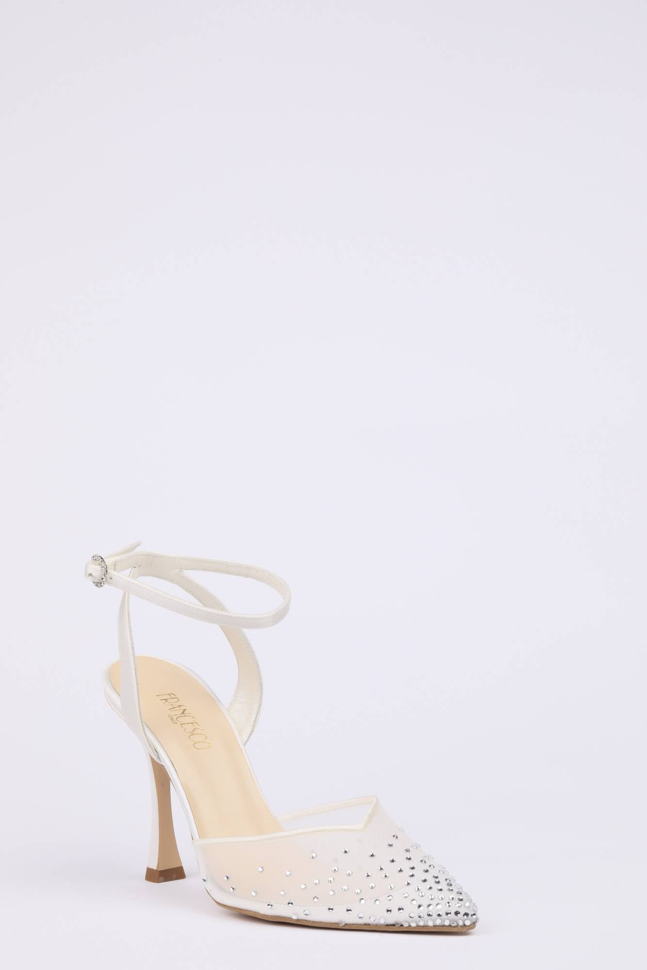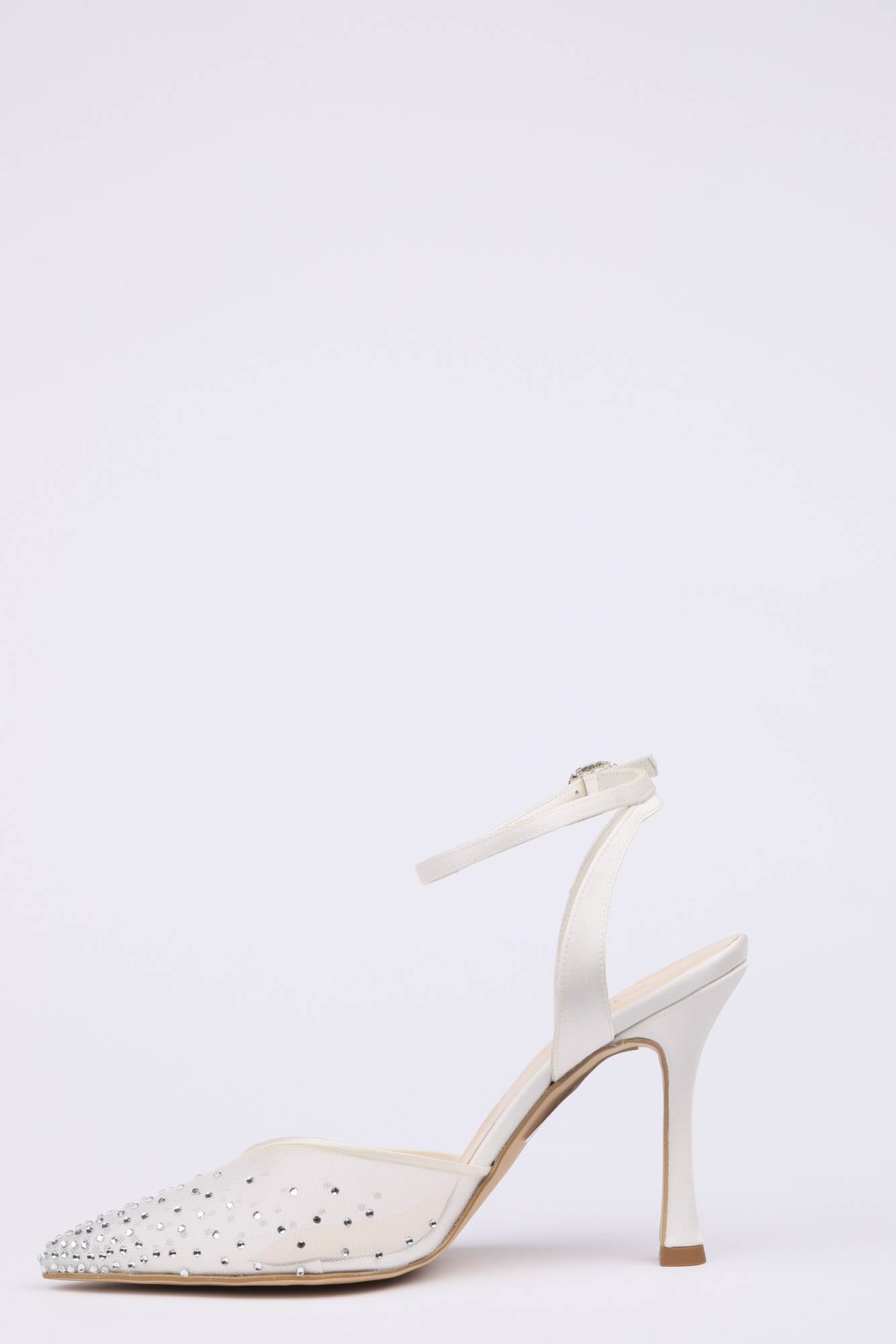 Modello decolletè con punta a rete e cristalli sparsi. Tacco fino di 9 cm. Cinturino alla caviglia e chiusura gioiello.