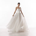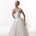 Abito componibile gonna e top interamente in seta con corpino steccato con scollo a cuore e taglio a V in vita e gonna ampia con balze sulla parte posteriore