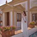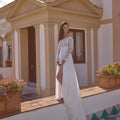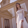 Abito da sposa dalla gonna scivolata in chiffon con corpino luminoso realizzato in pizzo chantilly, scollo omerale e maniche lunghe. Completa il look una morbida cinta drappeggiata.