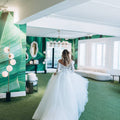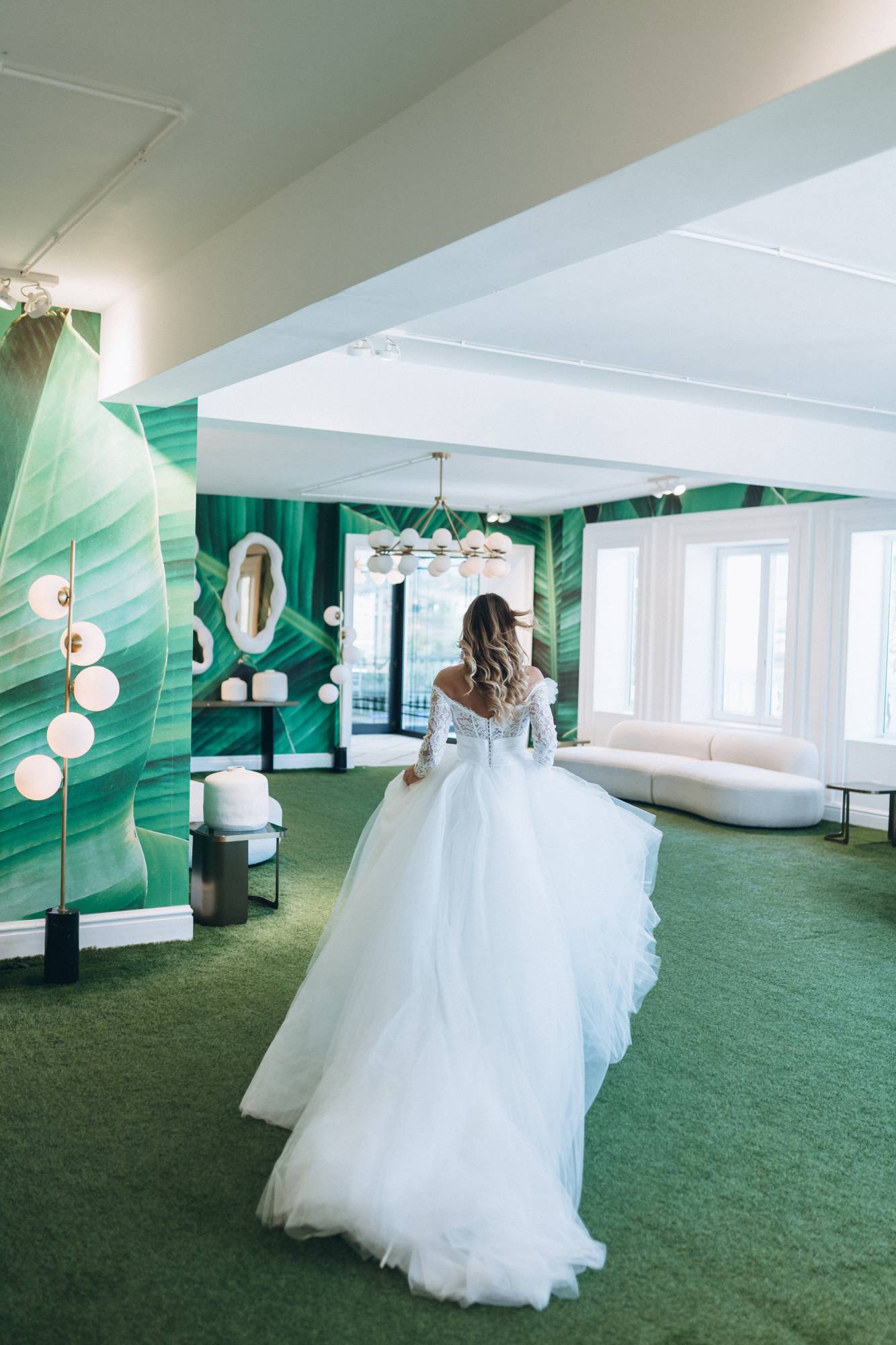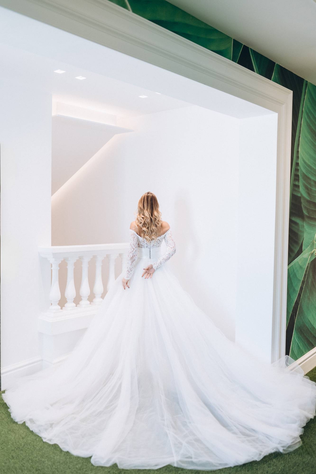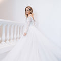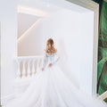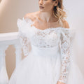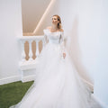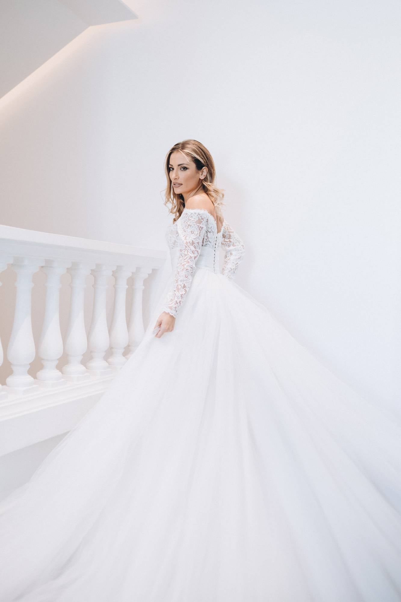 Abito da sposa ampio da principessa con ampia gonna in tulle e corpino in pizzo con scollo omerale e maniche lunghe. La cinta drappeggiata definisce il punto vita. Il fiore sulla spalla dona romanticismo.
