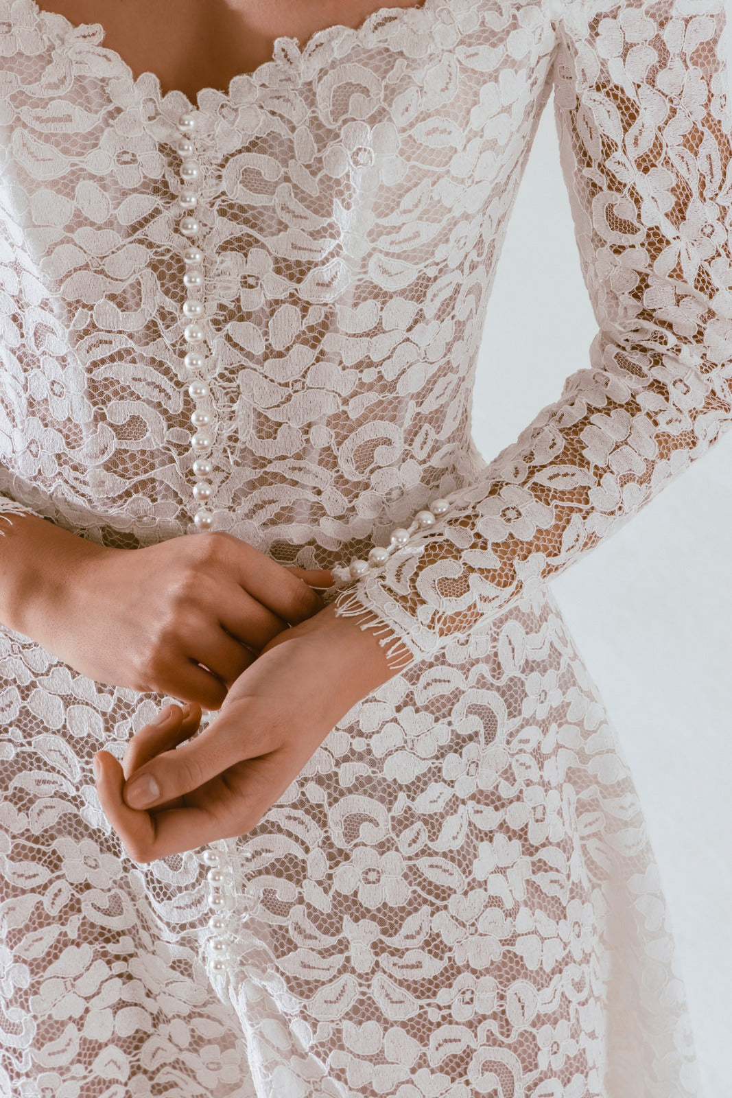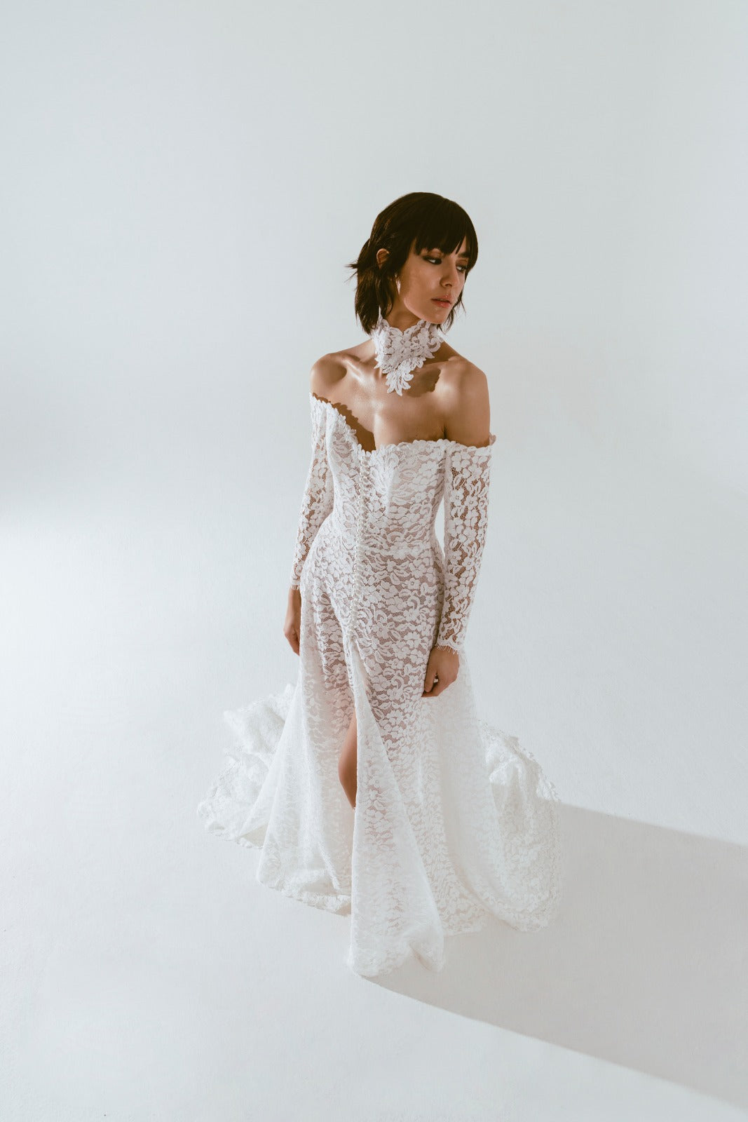 Abito da sposa dalla linea scivolata, realizzato in pizzo con scollo omerale e maniche lunghe. L'abito è romantico ma sofisticato. Una lunga fila di bottoncini di perla corre lungo tutta la scollatura davanti fino allo spacco centrale. L'abito è accessoriato dal choker abbinato.