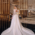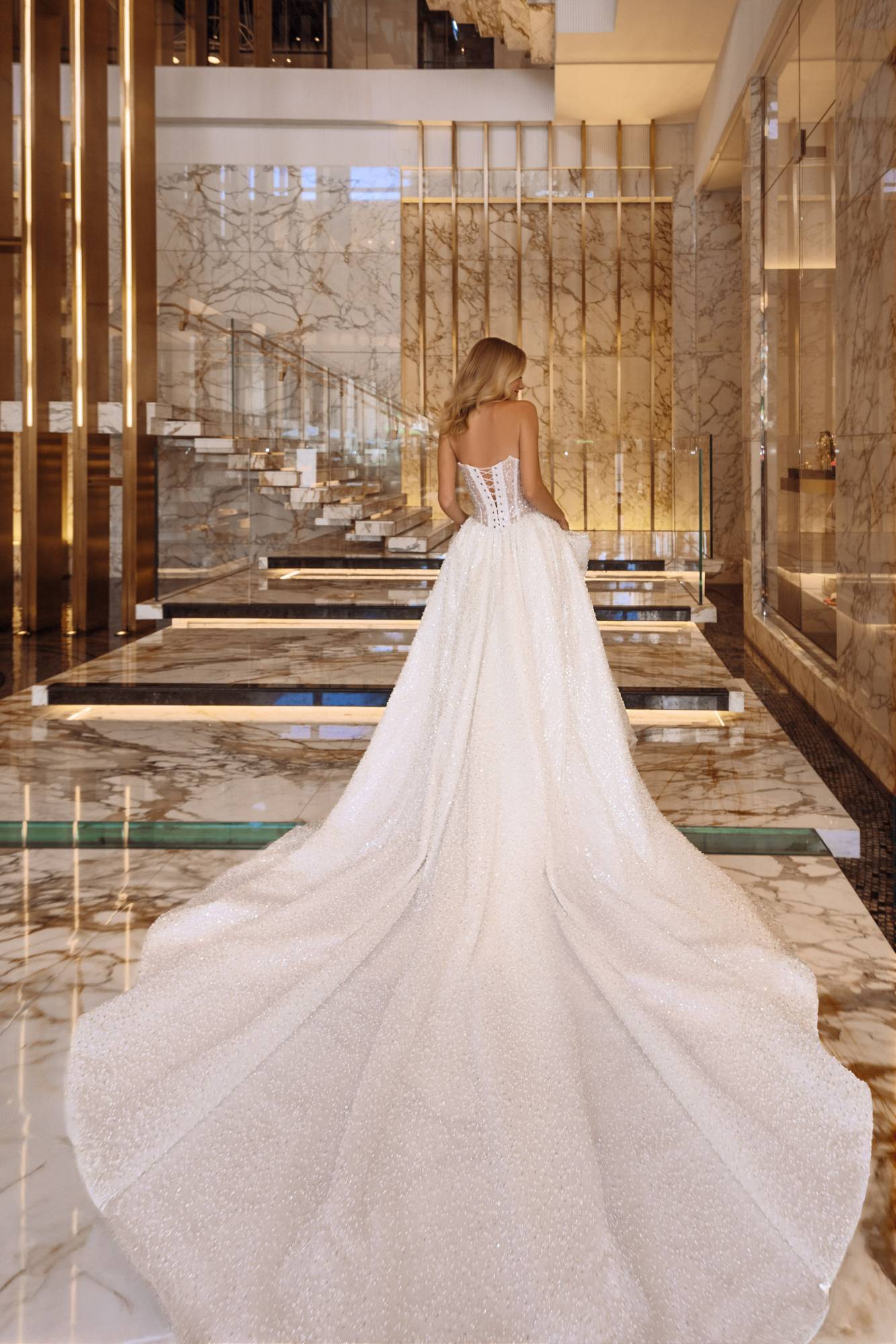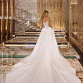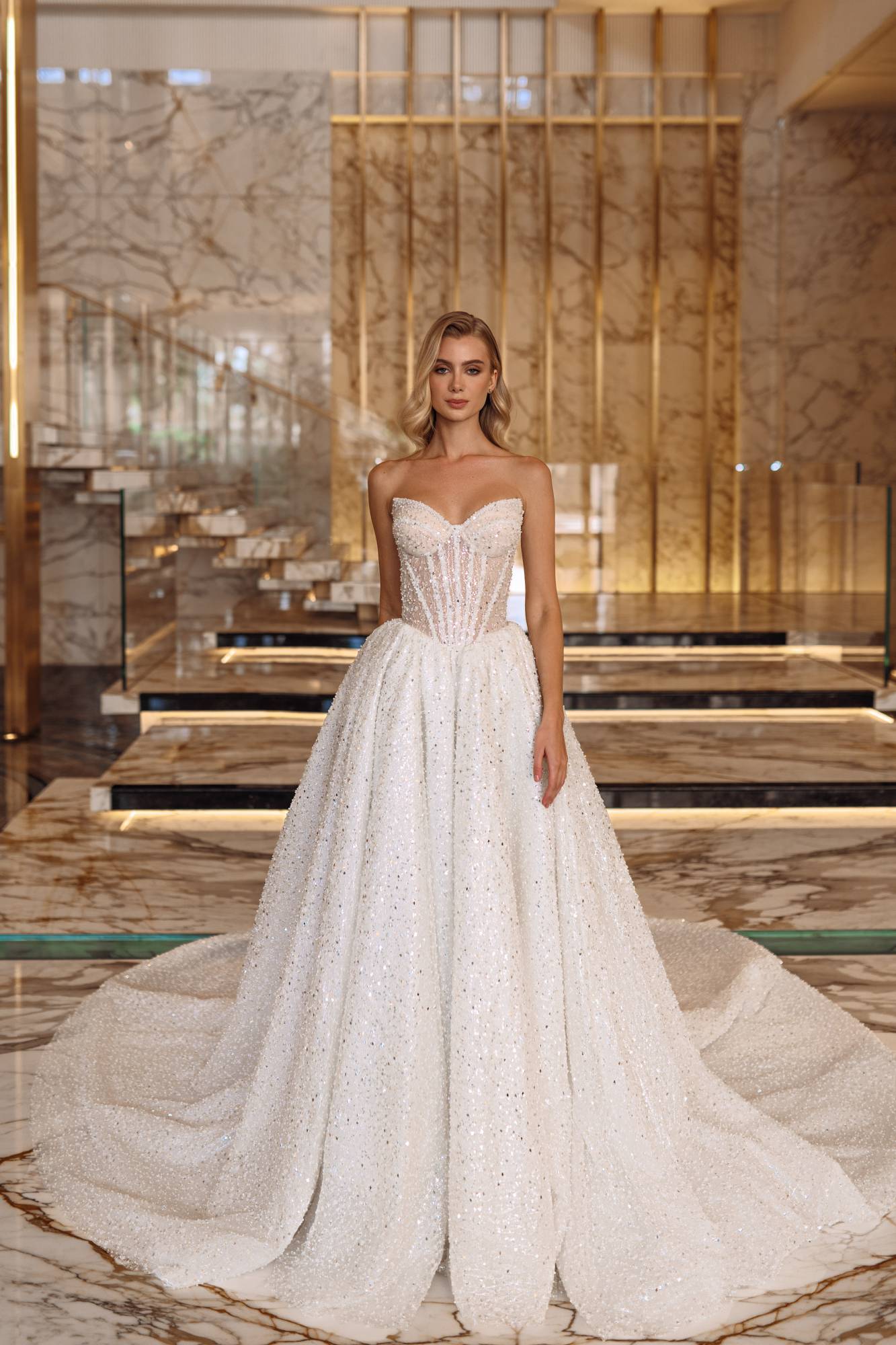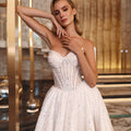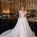 Abito da sposa ampio da principessa in tulle glitter. Il corpino, effetto steccato con chiusura a corsetto sulla schiena, è abbinato ad un bolero con maniche lunghe e colletto.