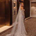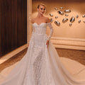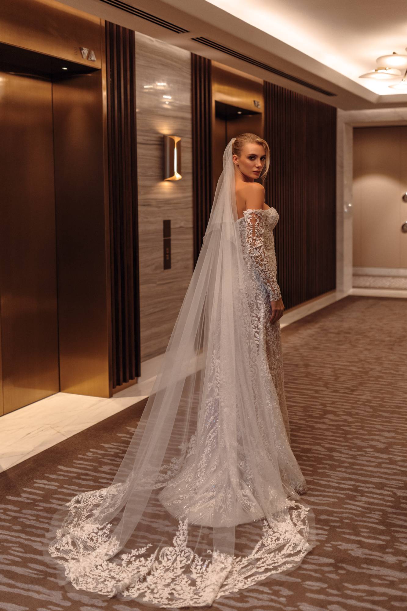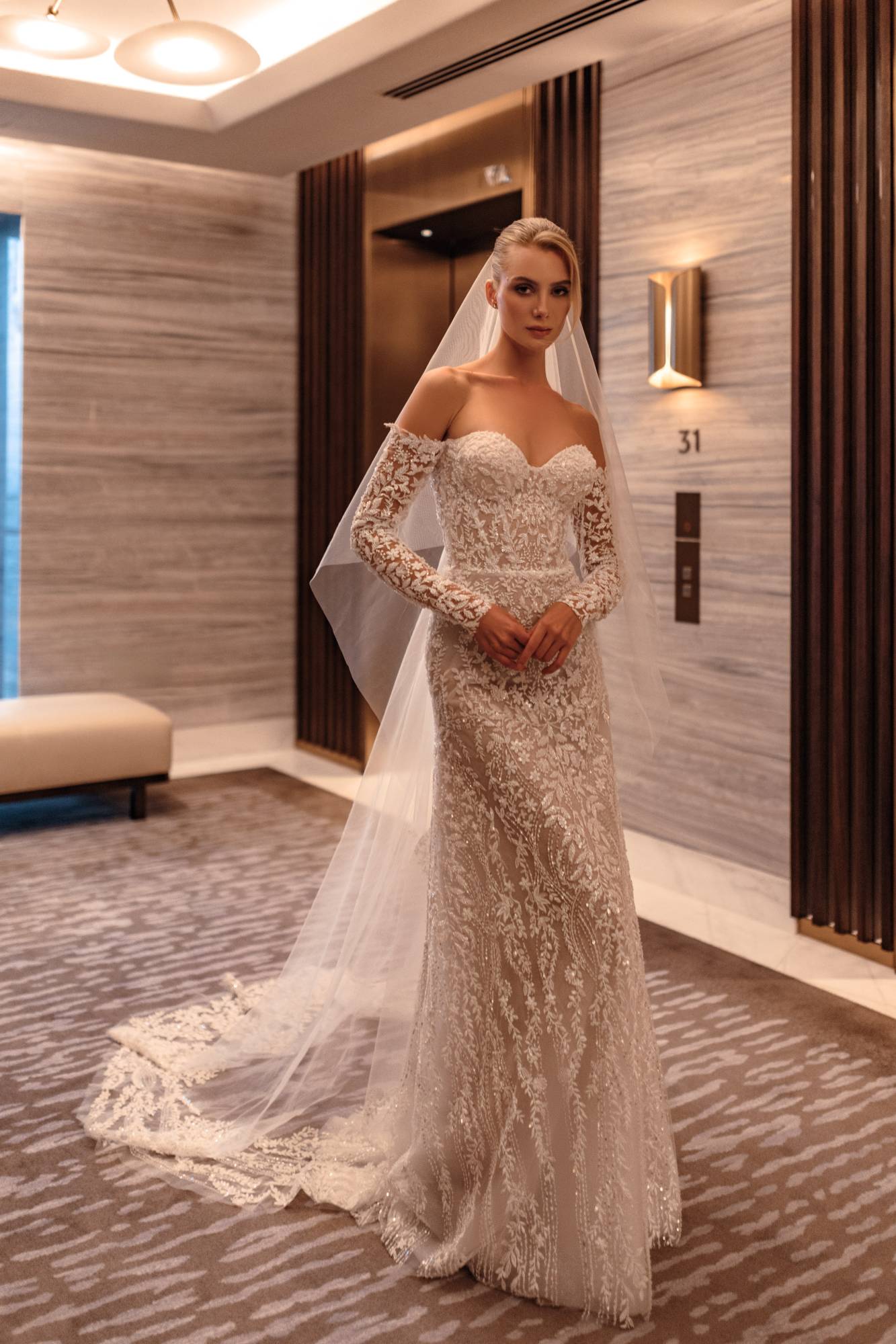 Abito da sposa a sirena con corpino a cuore abbinato a manicotti lunghi. L'abito è interamente realizzato in tulle e pizzo ricamato, con motivi geometrici e fiorellini. L'abito è abbinato ad una vaporosa sopragonna in tulle e applicazioni di pizzo sparse sulla coda.
