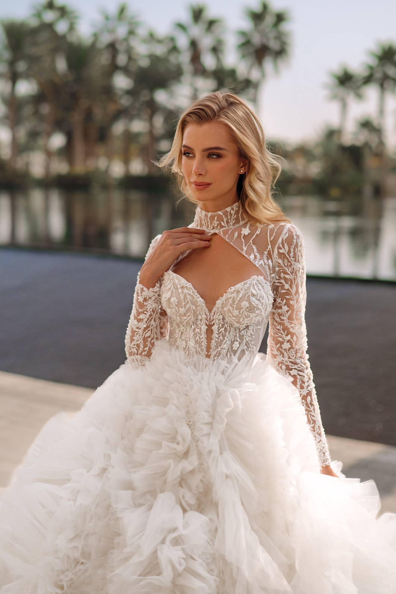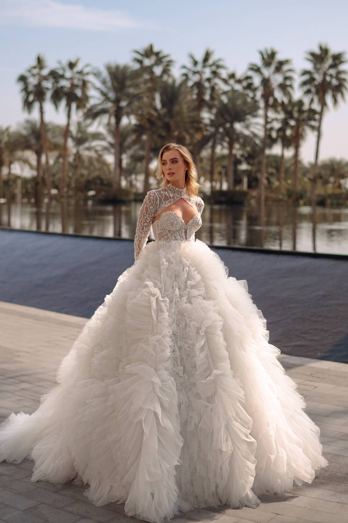 Abito da sposa con ampia gonna da principessa in tulle e ruches. Il corpino, con scollo a cuore e coprispalle abbinato con maniche lunghe, è realizzato in pizzo e ricamo luminoso geometrico.