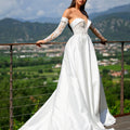 Abito con linea ad A, scollatura a cuore con ricami di pizzo che riprendono le maniche staccabili. Lo spacco laterale profondo della gonna dona all'abito un tocco estremamente sensuale.