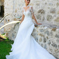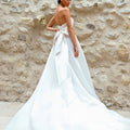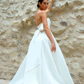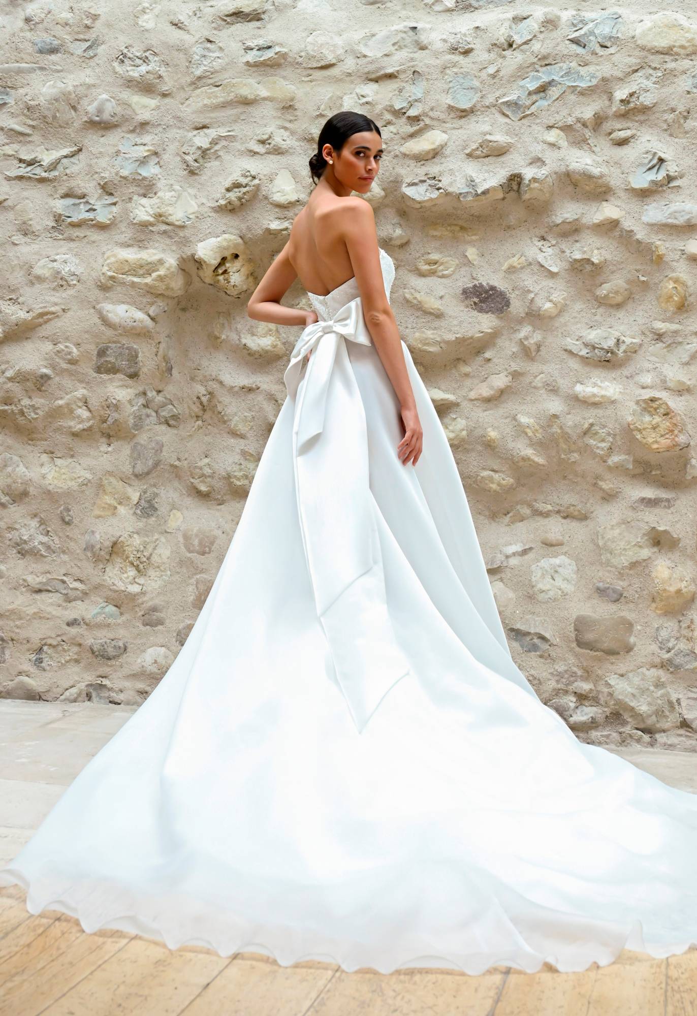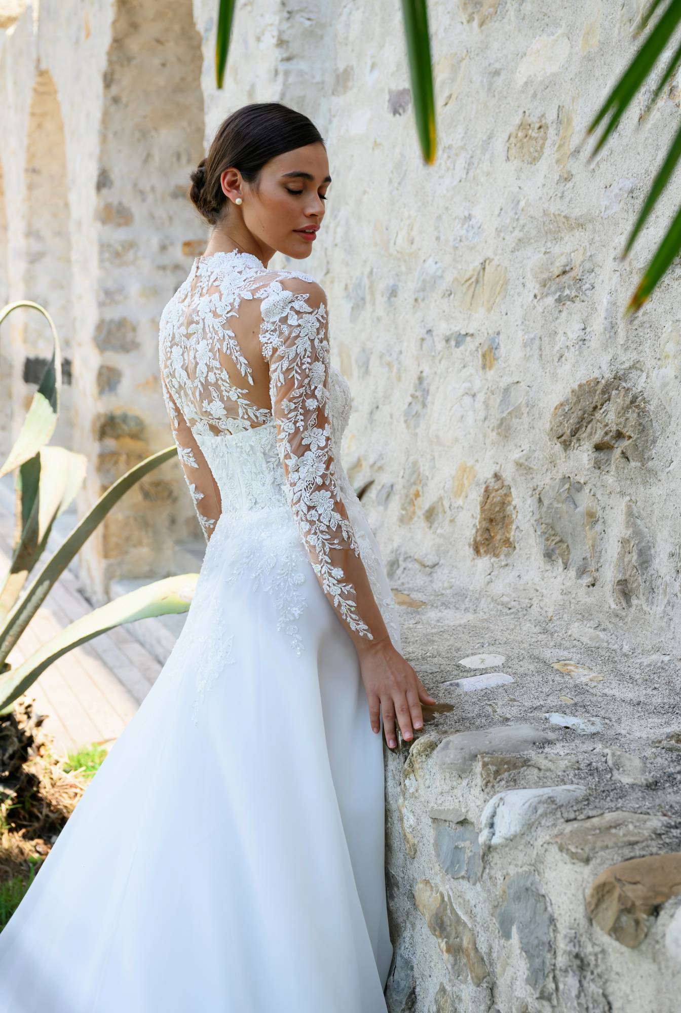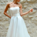 Abito linea ad A con gonna liscia e corpino con scollo dritto impreziosito da perline e una fascia liscia sulla vita che dona all'abito un tocco di puro romanticismo.