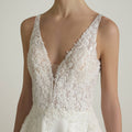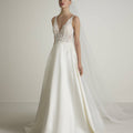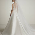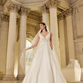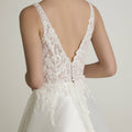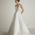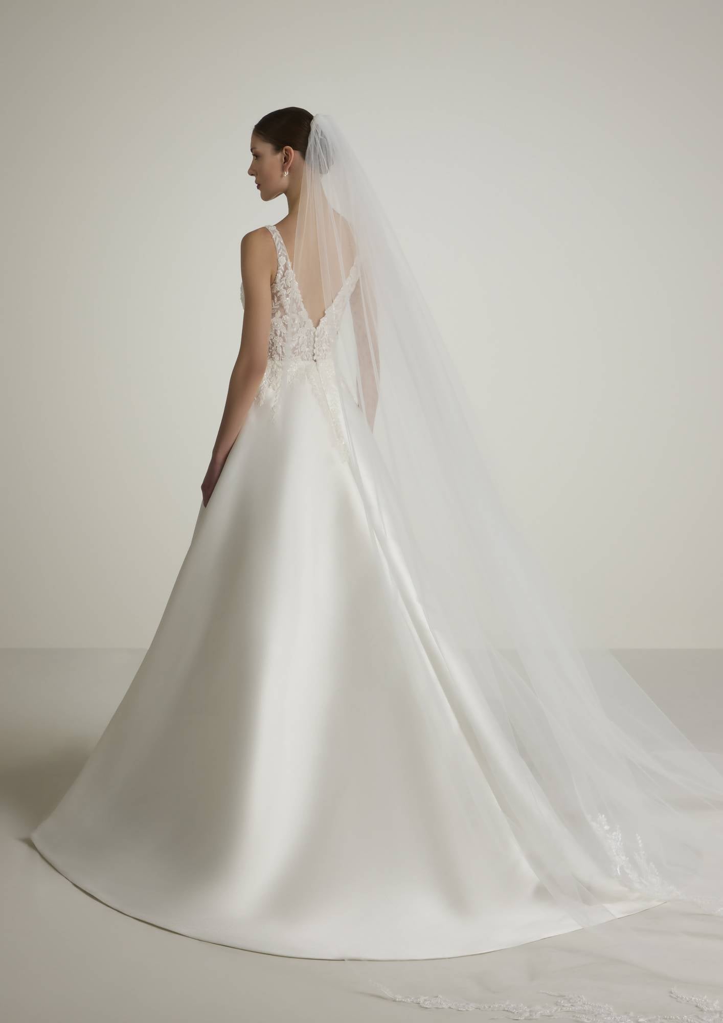 Abito da principessa con ampia gonna in mikado. Il corpino scollato a V è impreziosito da applicazioni in pizzo e ricamo luminoso.