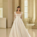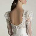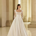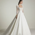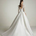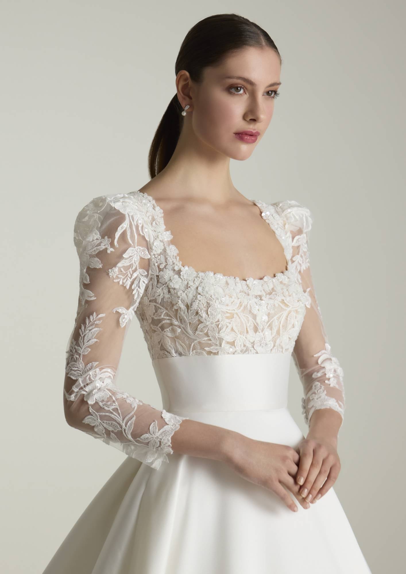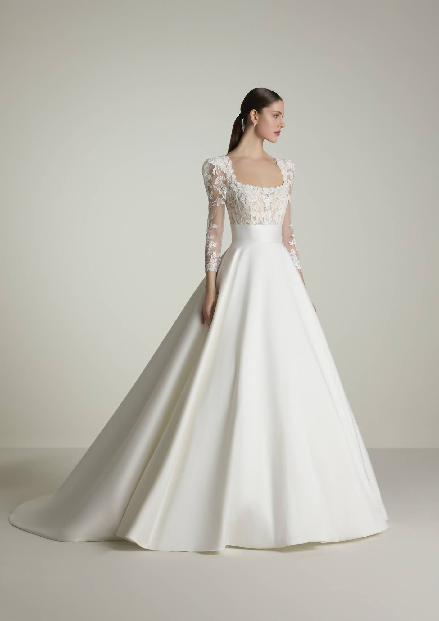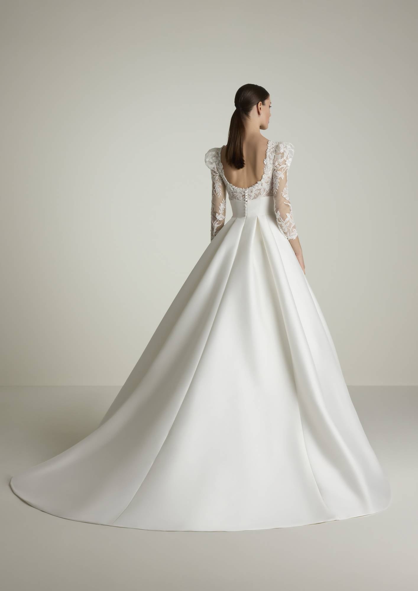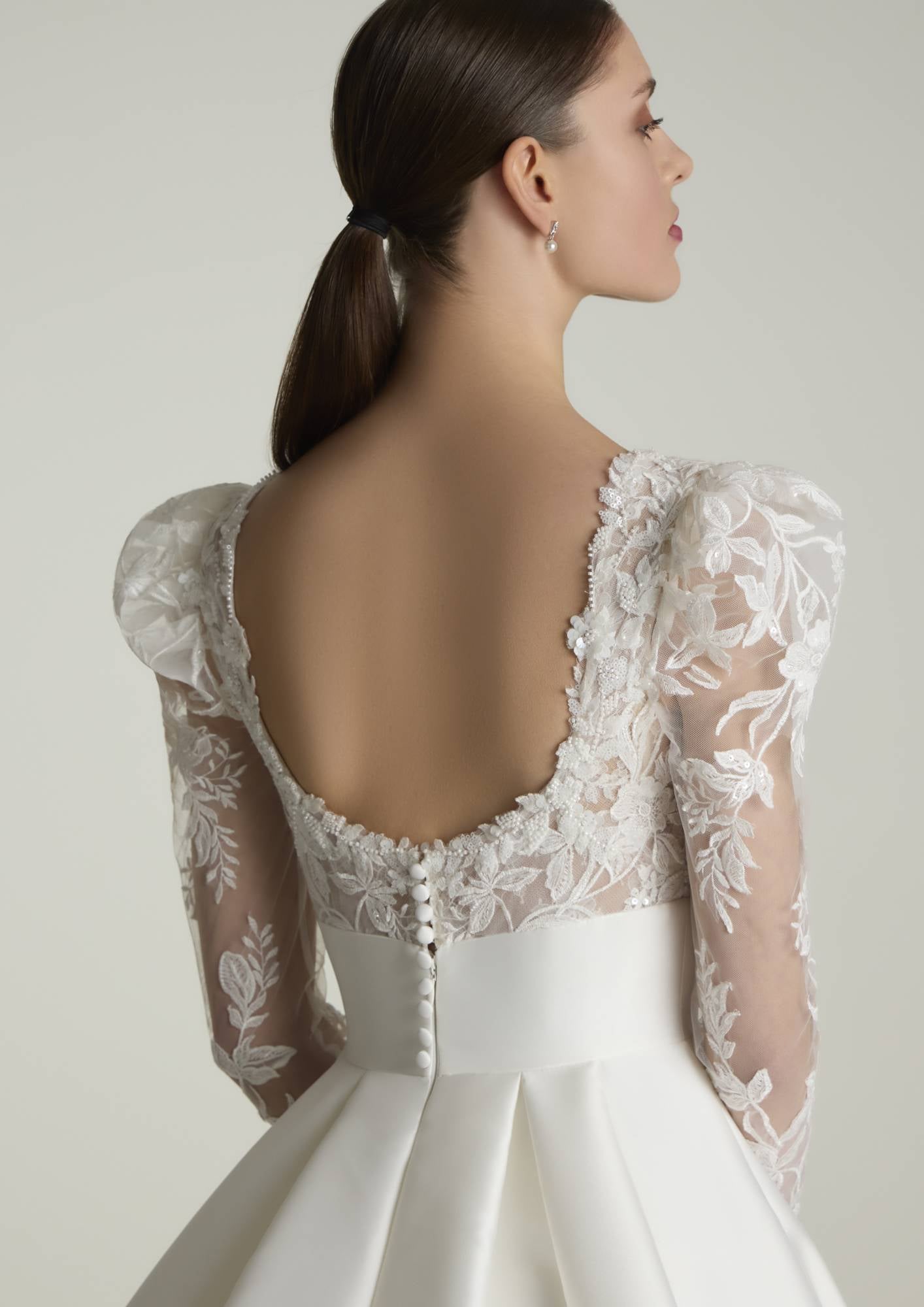 Abito da principessa in mikado con corpino con scollo dritto, maniche lunghe e schiena scoperta.