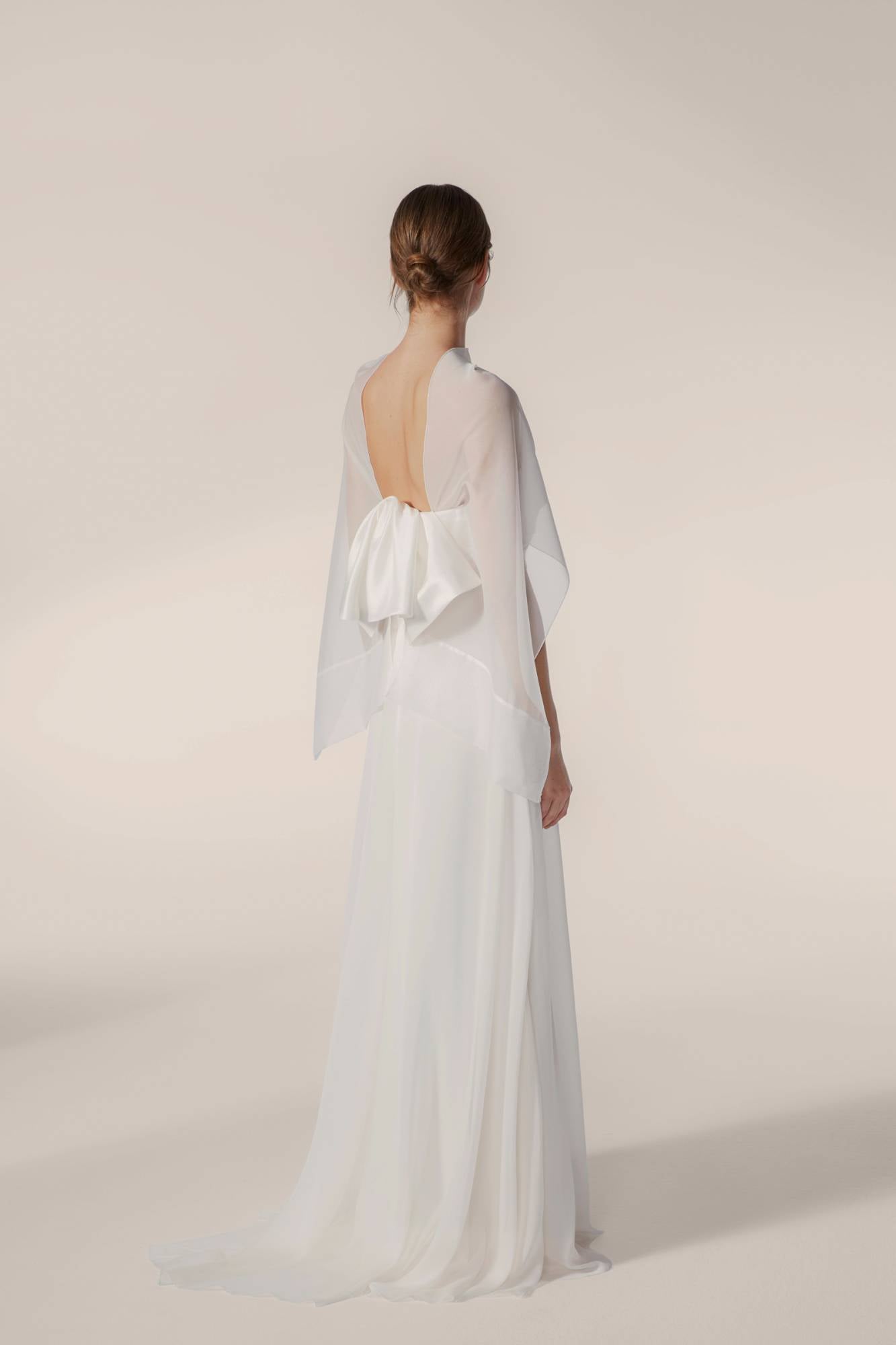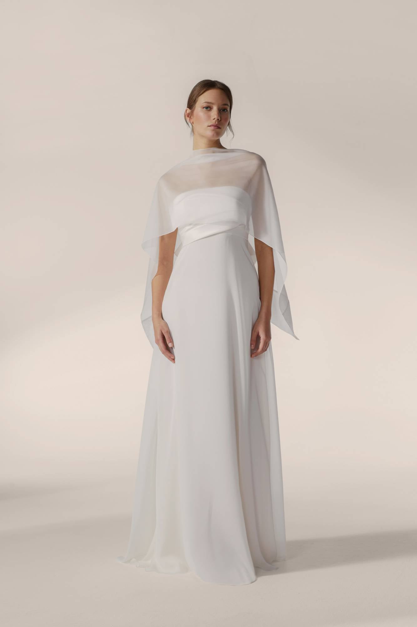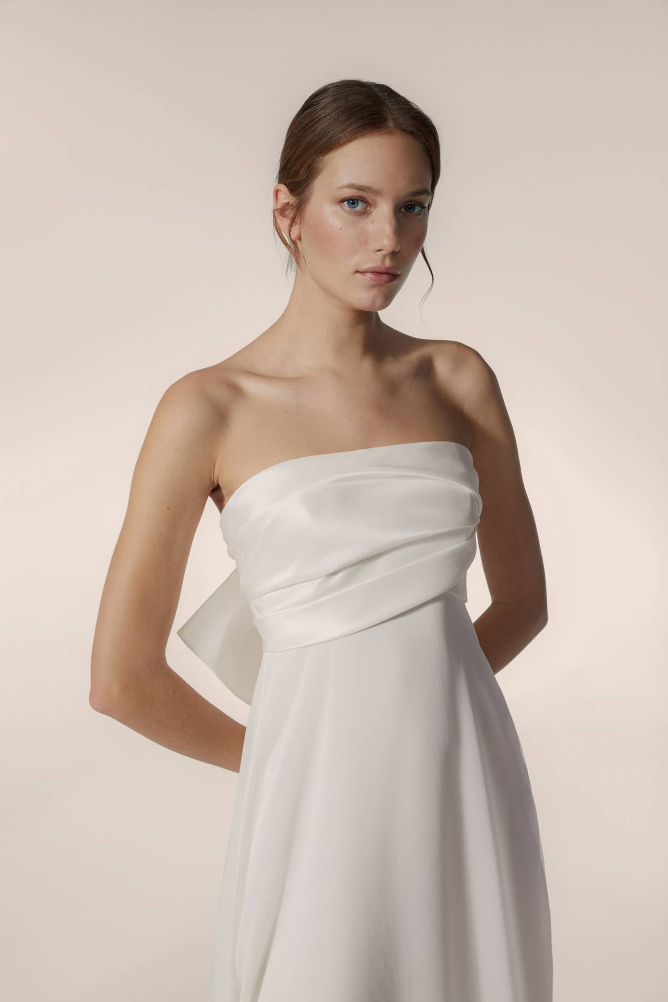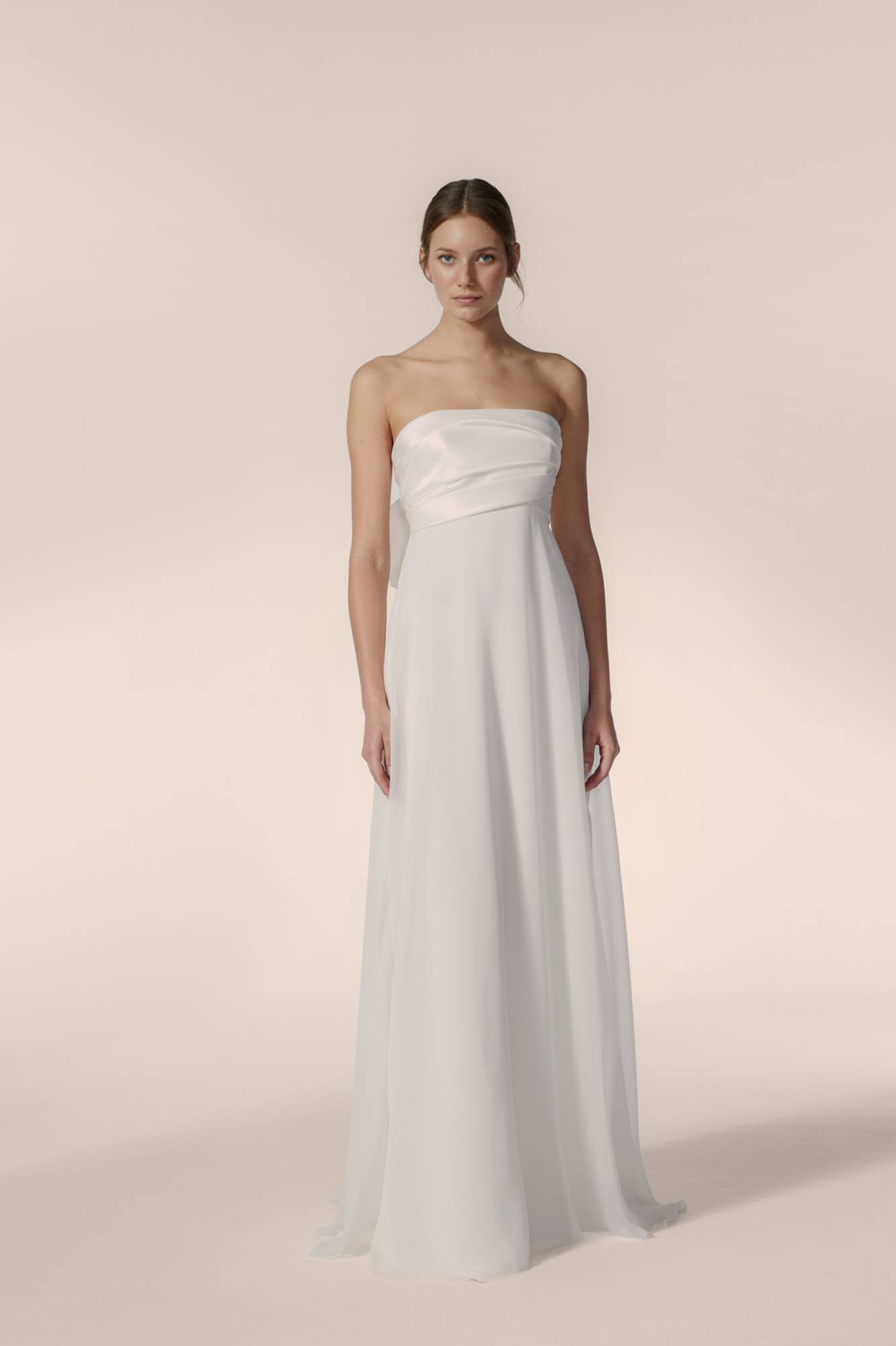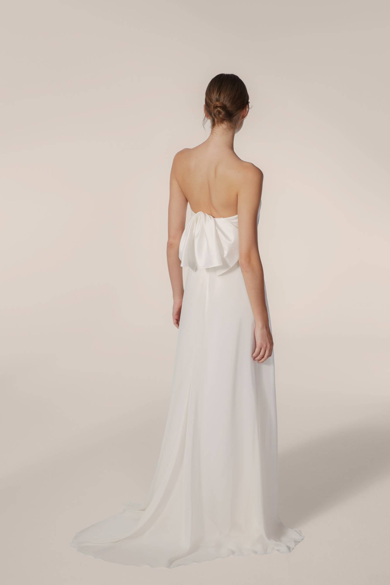 Abito da sposa dalla linea scivolata: il corpino, realizzato in raso, è drappeggiato e asimmetrico. La gonna morbida in seta dona leggerezza e rendere l'abito elegante e sofisticato.