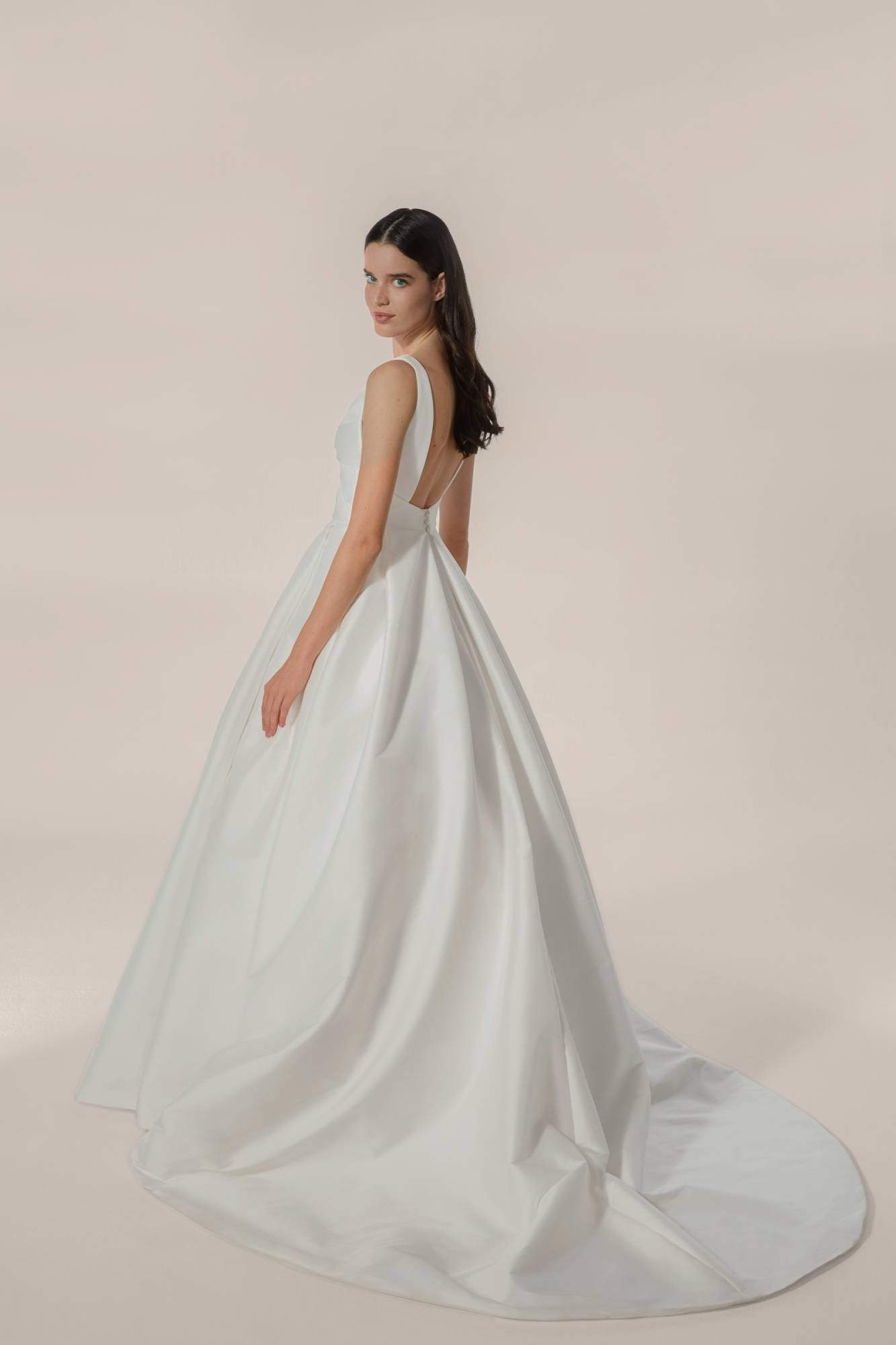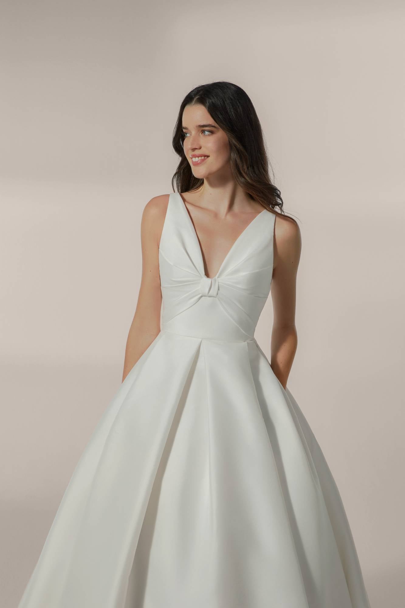 Abito da sposa da principessa in raso con scollo a V e schiena scollata. Il corpino è realizzato in modo da creare un fiocco.