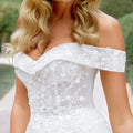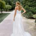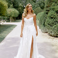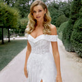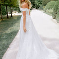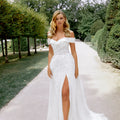 Abito da sposa dalla linea scivolata con collo omerale rimovibile e spacco laterale. L'abito è realizzato in tulle, pizzo e ricamo luminoso.