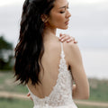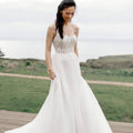 Abito da sposa dalla linea ad A in organza con corpino in pizzo e spalline sottili.