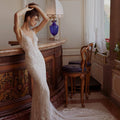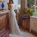 Abito da sposa dalla linea a sirena con profonda scollatura illusione e schiena scoperta e profonda. Abito impreziosito da applicazioni in pizzo con perline e paillettes tono su tono. Completa il look lo spacco laterale.