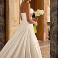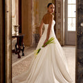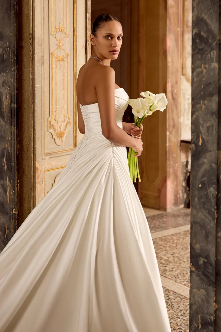 Abito da sposa in mikado con ampia gonna da principessa e morbidi drappeggi sul corpino scollato dritto e sulla gonna.
