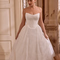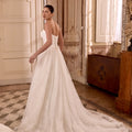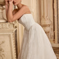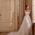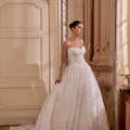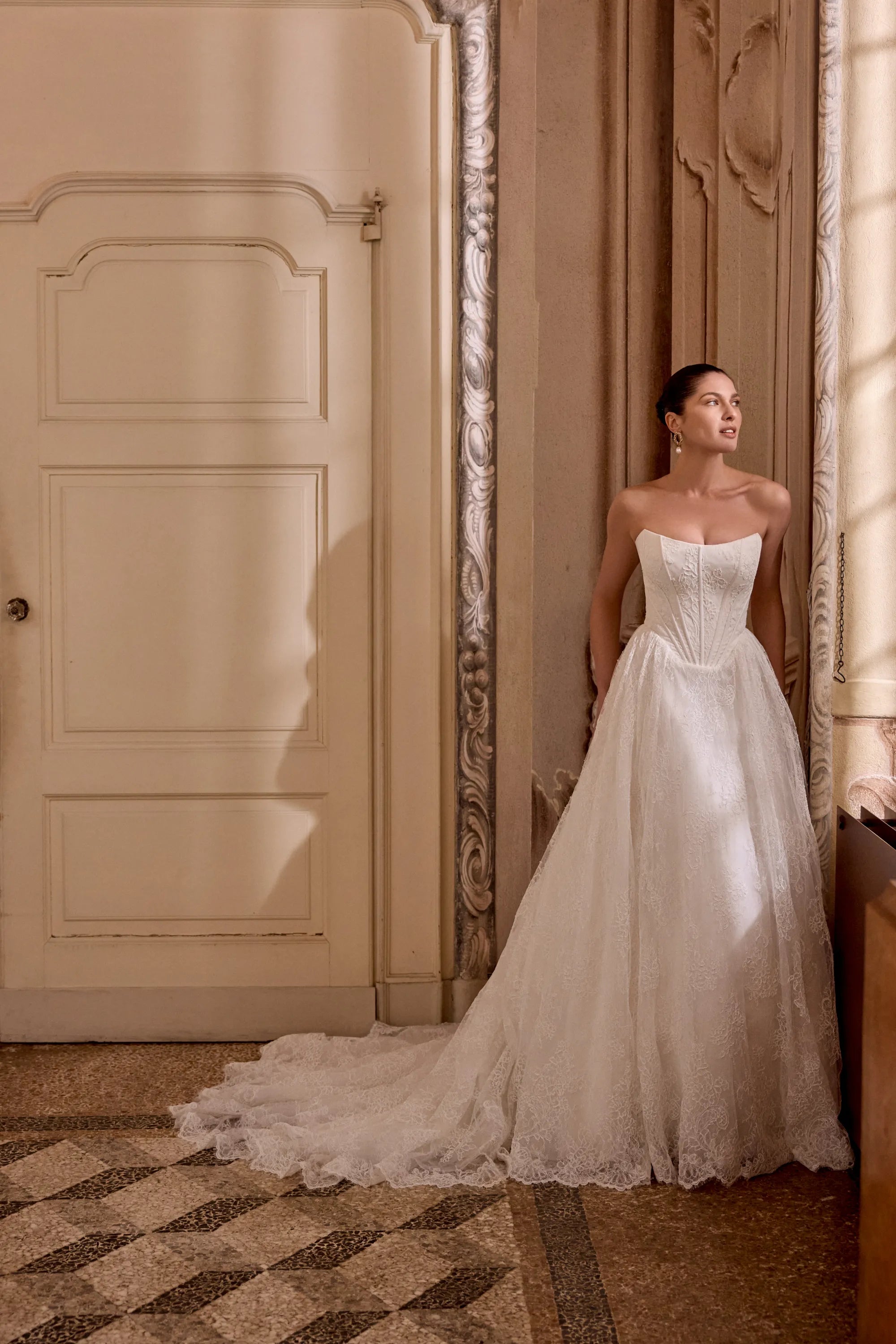 Abito da sposa a principessa realizzato interamente in pizzo chantilly, con corpino steccato effetto corsetto, vita basca e scollatura a corsetto. Chiusura con stringhe sulla schiena.