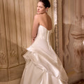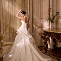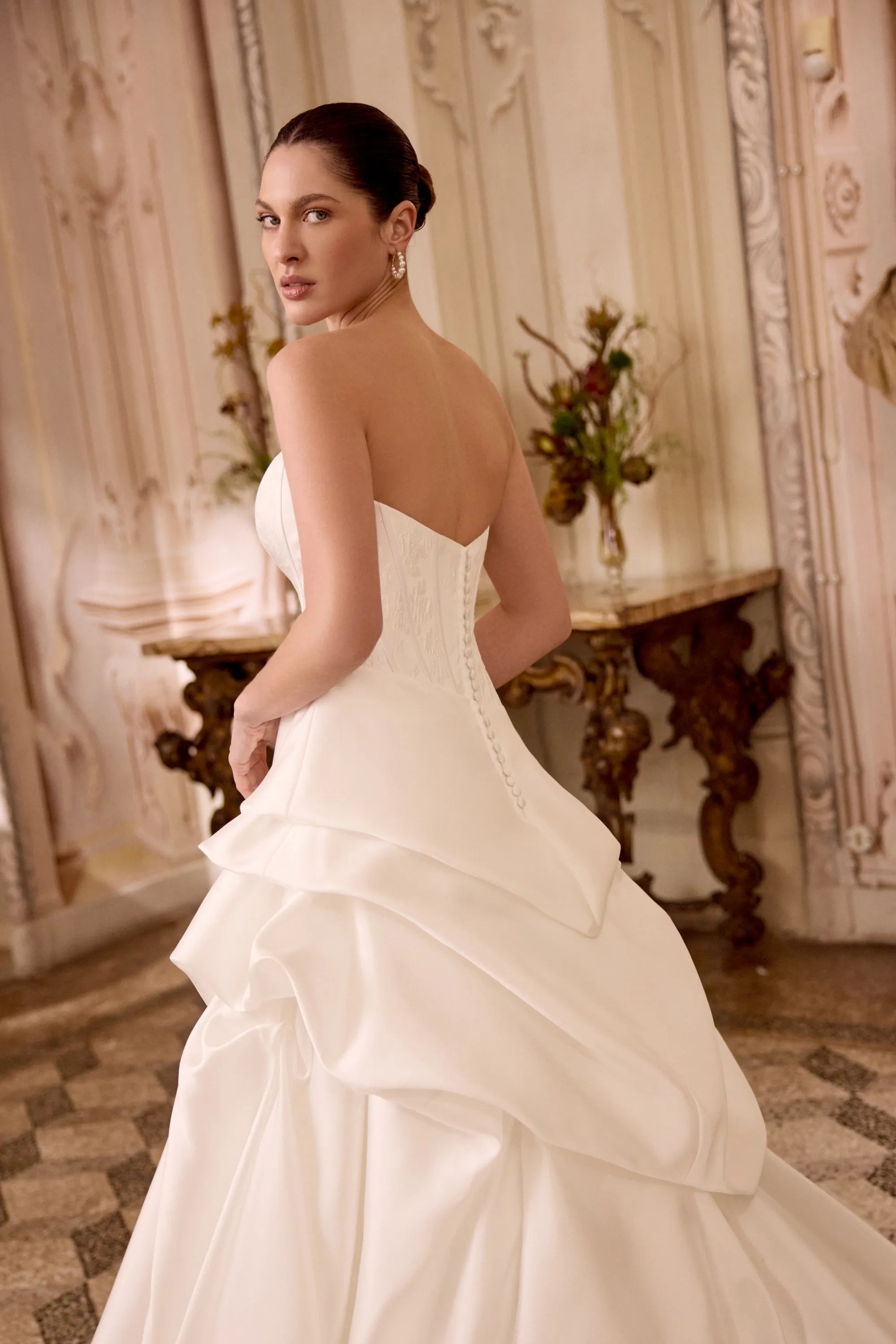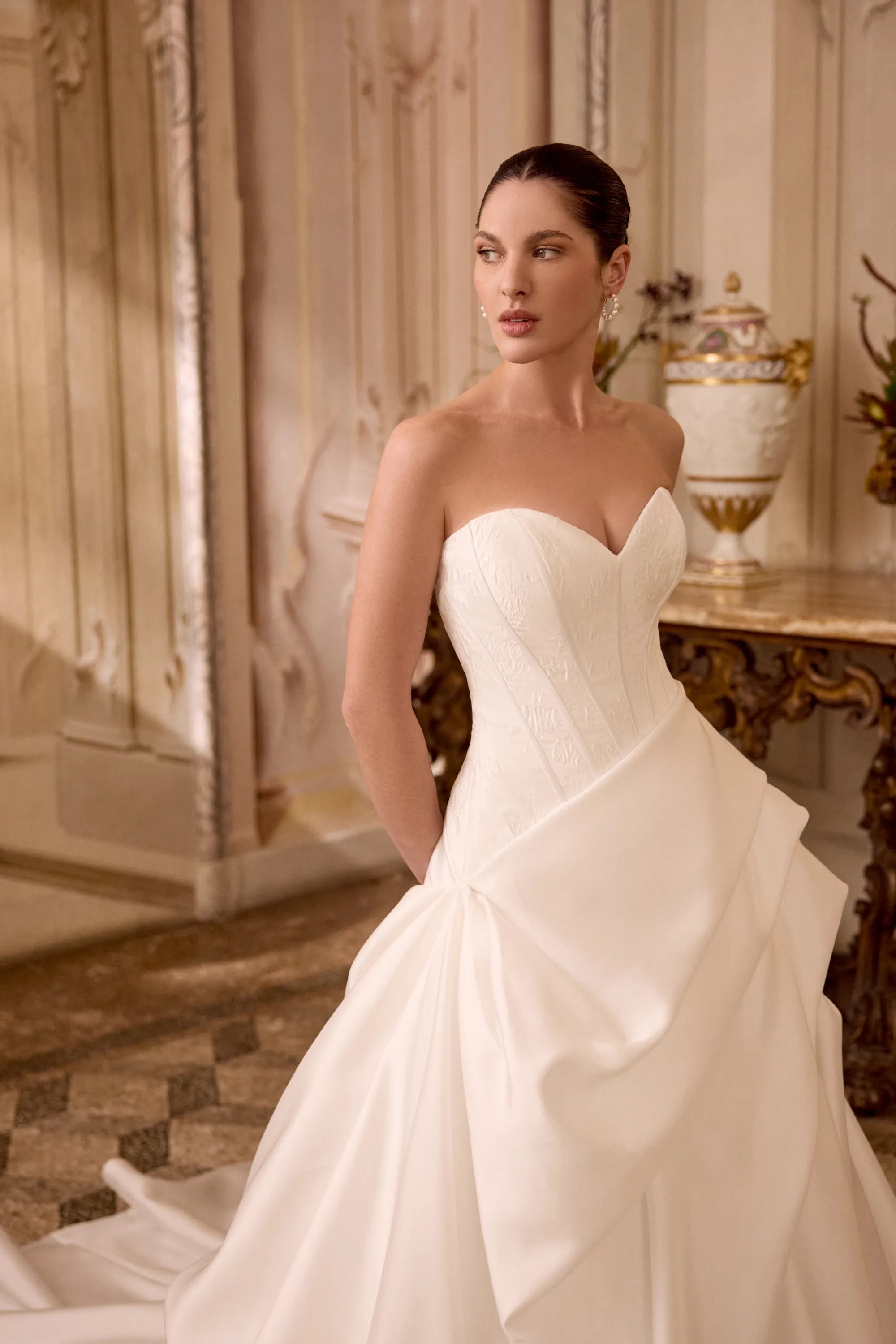 Abito da sposa in mikado con corpetto broccato steccato con taglio asimmetrico e scollo a cuore. La gonna ha una linea pulita a balze anch'esse asimmetriche.