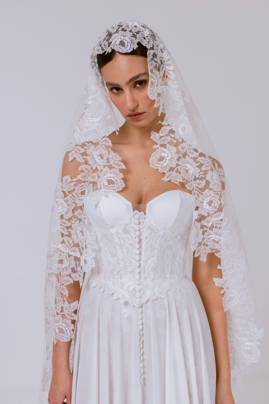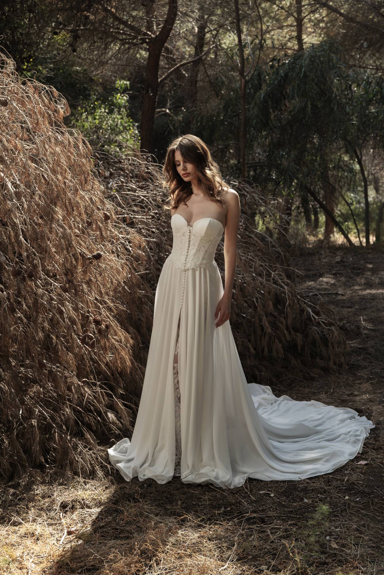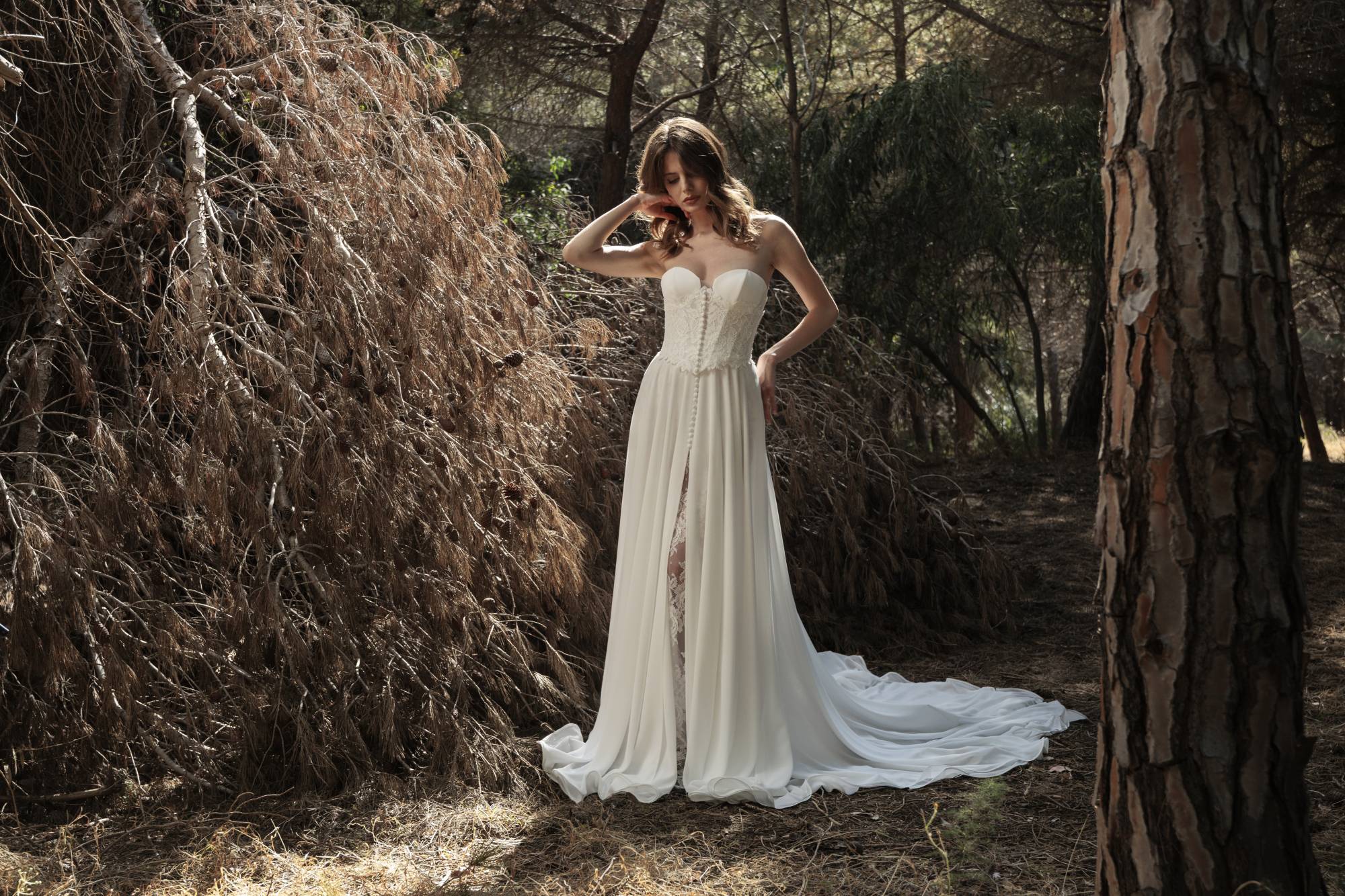 Abito da sposa dalla linea scivolata in chiffon con scollo a cuore, spacco laterale e corsetto in pizzo da indossare come stringivita.