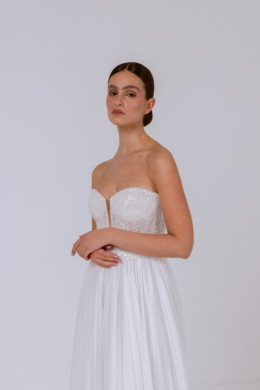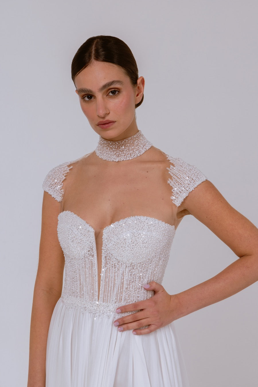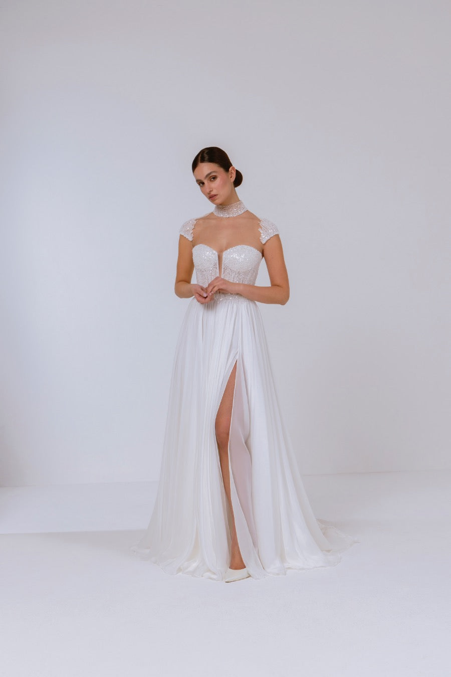 Abito da sposa dalla linea scivolata con spacco e corpino gioiello interamente ricamato di cristalli.