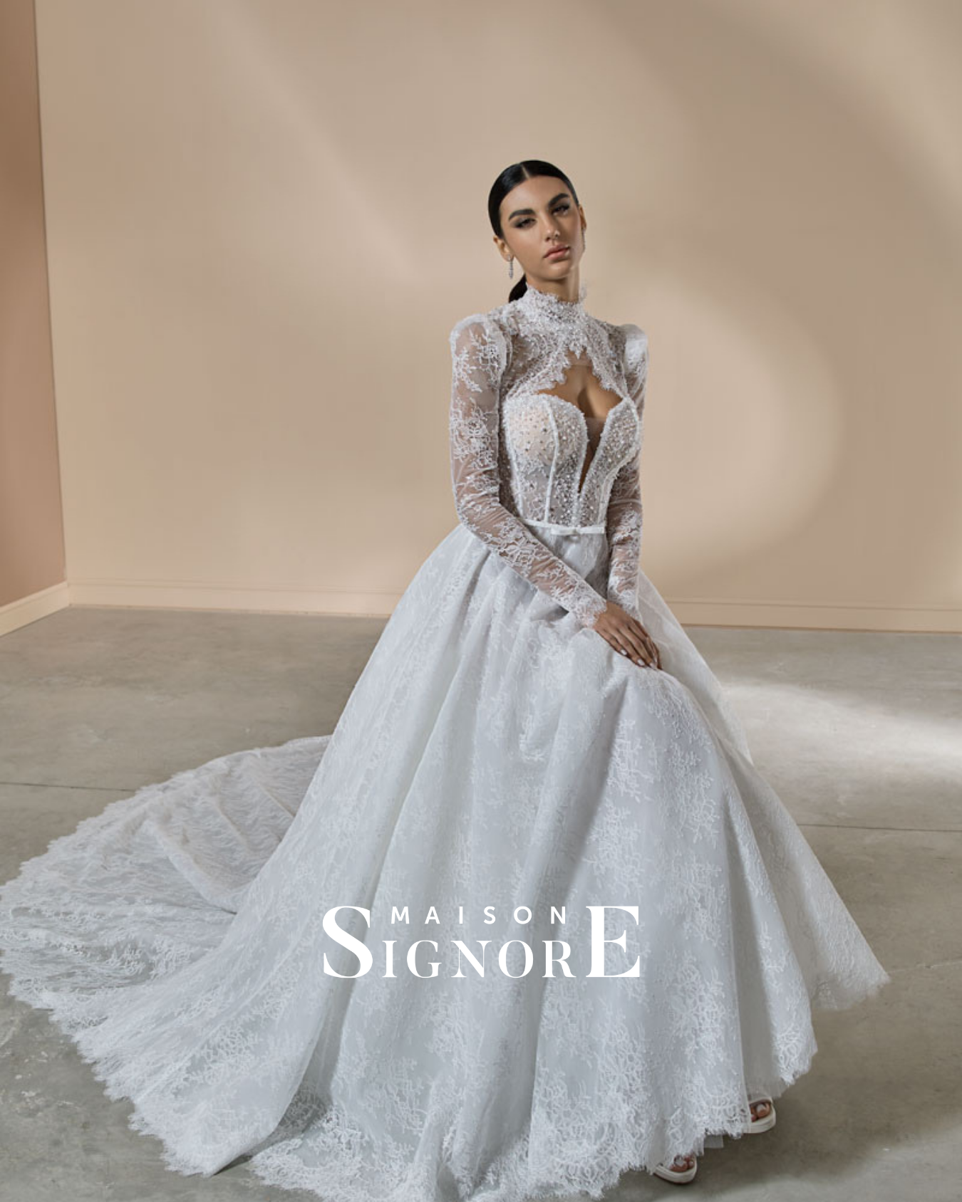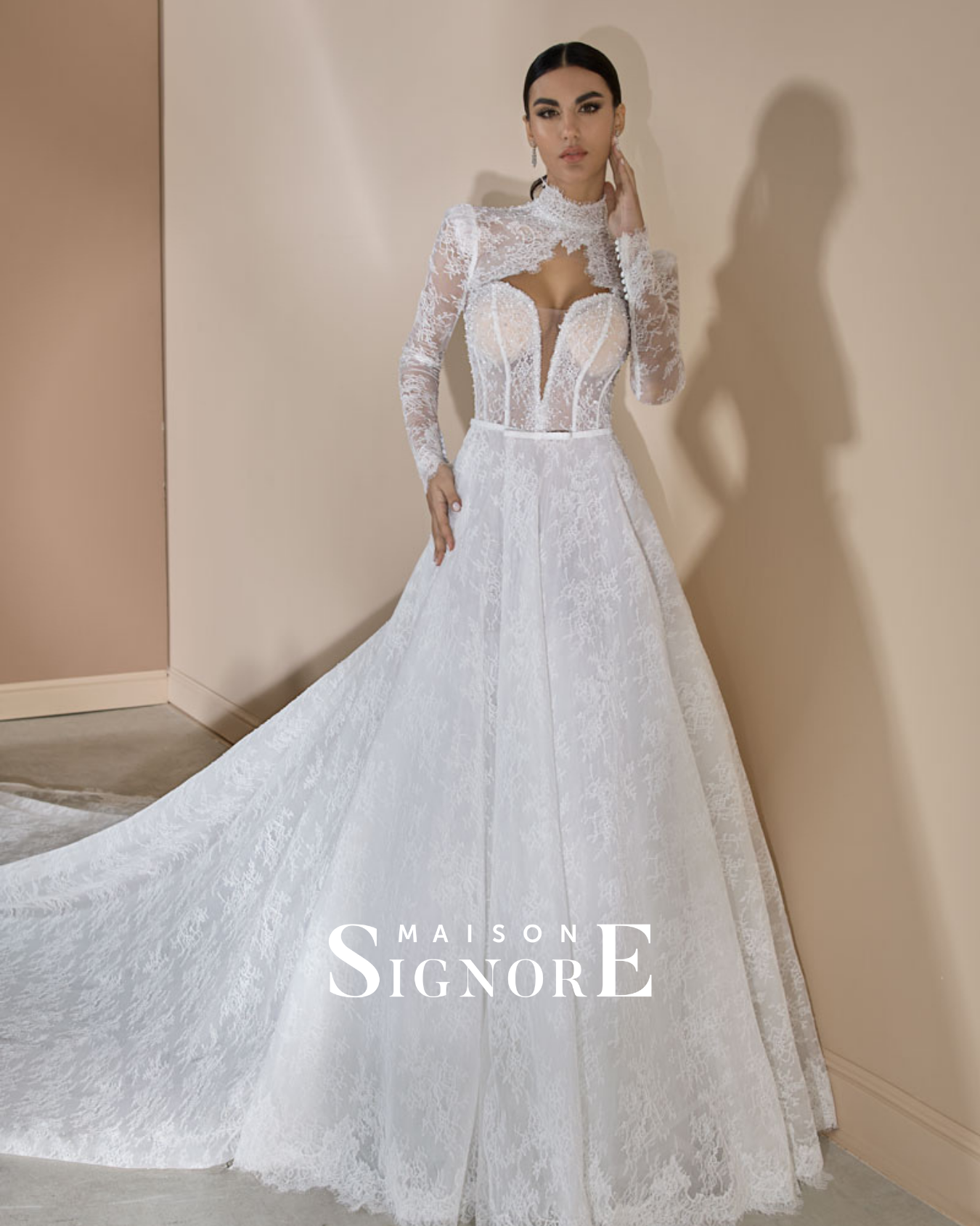 Abito principesco interamente in pizzo con scollo a V profondo e corpino steccato trasparente. Il bolero a collo alto con maniche lunghe dona estrema eleganza all'abito